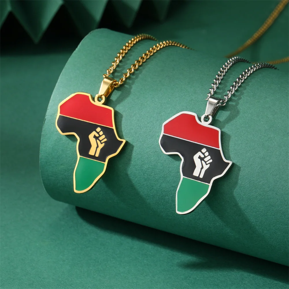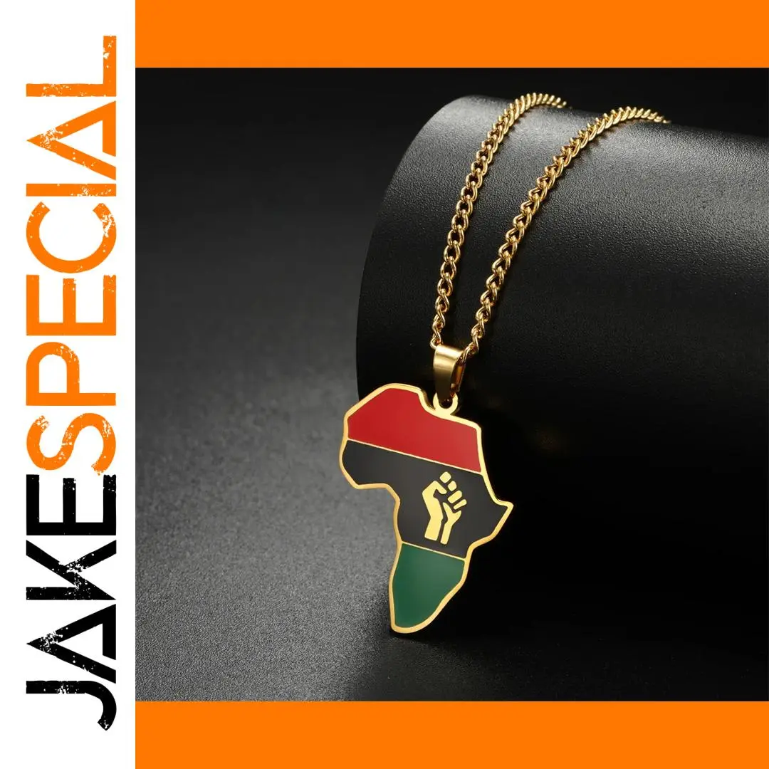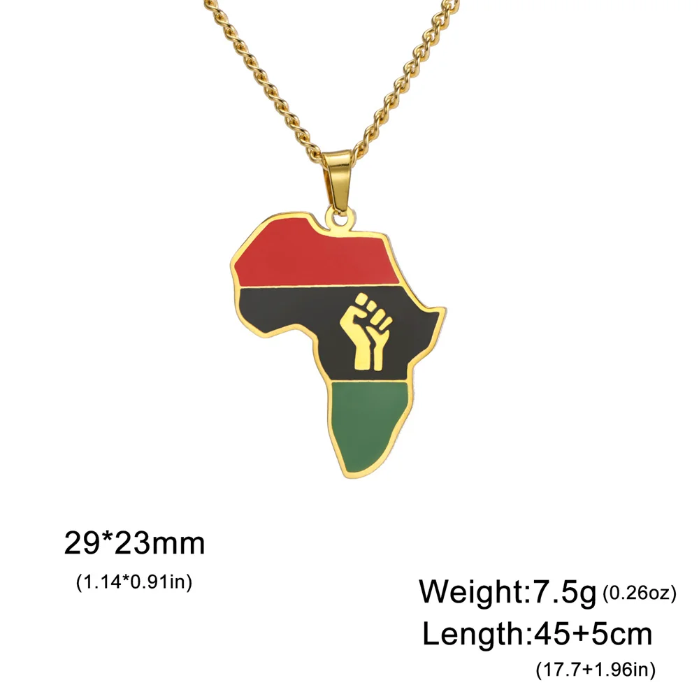 Discover the striking elegance of this unisex stainless steel pendant necklace featuring a geometric African map with a fist symbol design, measuring 29x23mm. Available in silver or gold color options, it boasts a durable, rust-resistant, hypoallergenic profile with high acid and alkali resistance. The classic link chain, adjustable from 45 to 50cm, perfectly complements the bold, culturally inspired motif, making it suitable for a variety of occasions such as parties, weddings, or as a meaningful gift. Its blend of vintage, minimalistic, and casual styles ensures this piece adds a distinctive touch of cultural pride and modern fashion to any outfit.