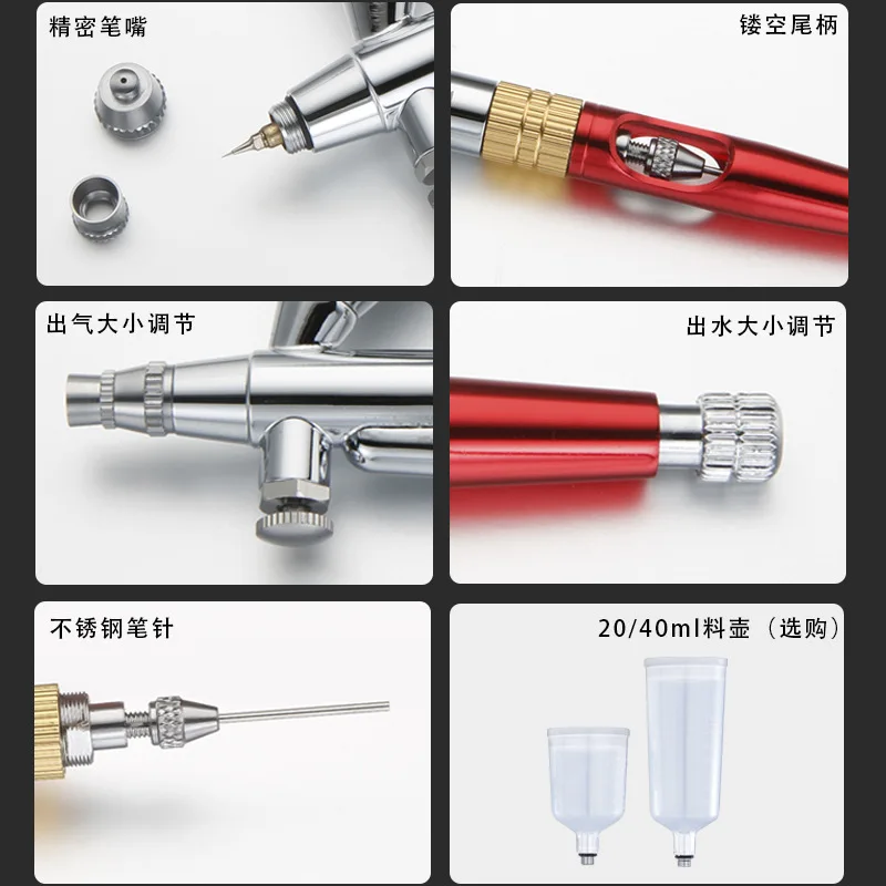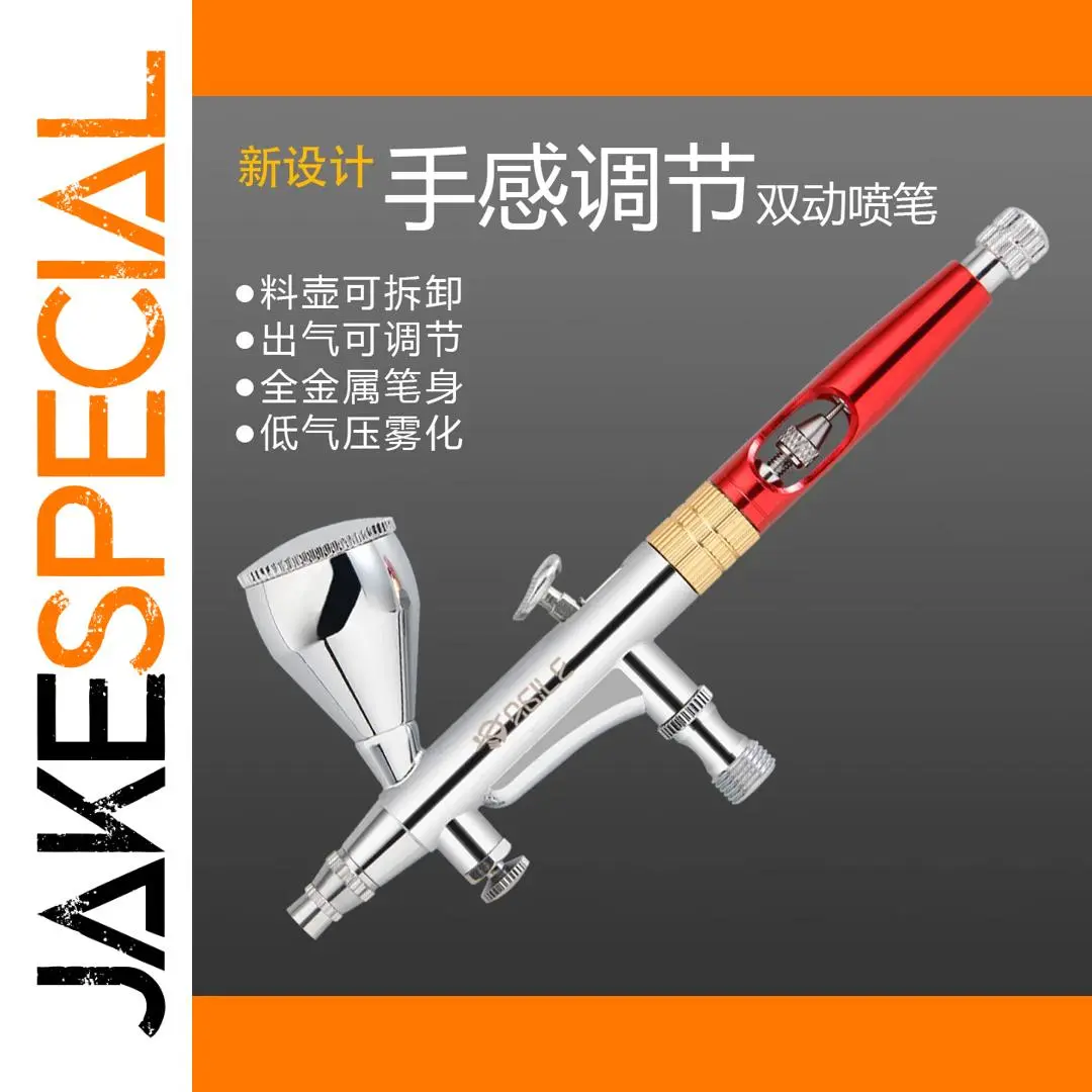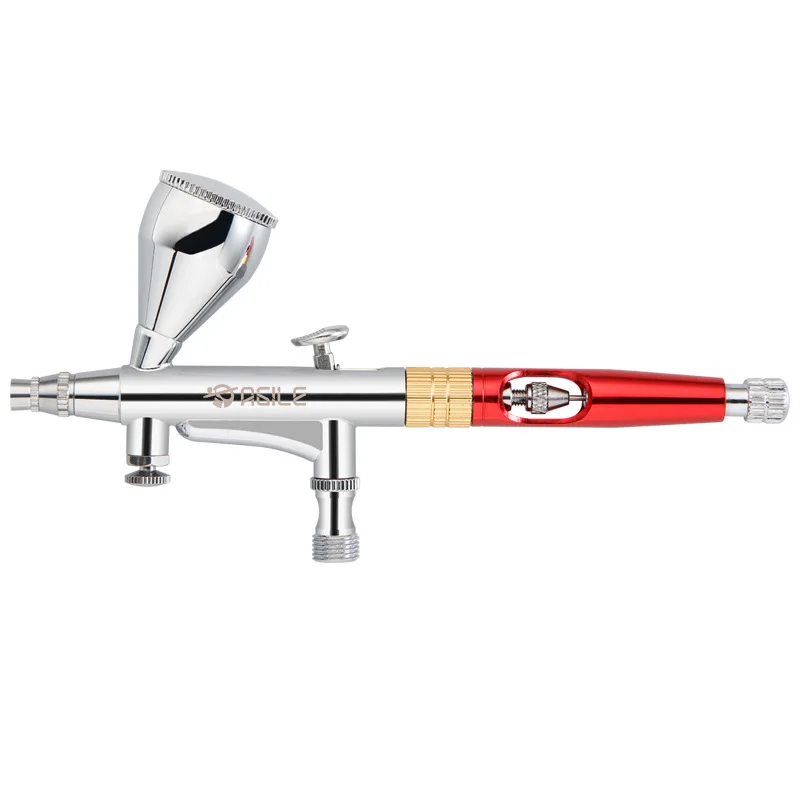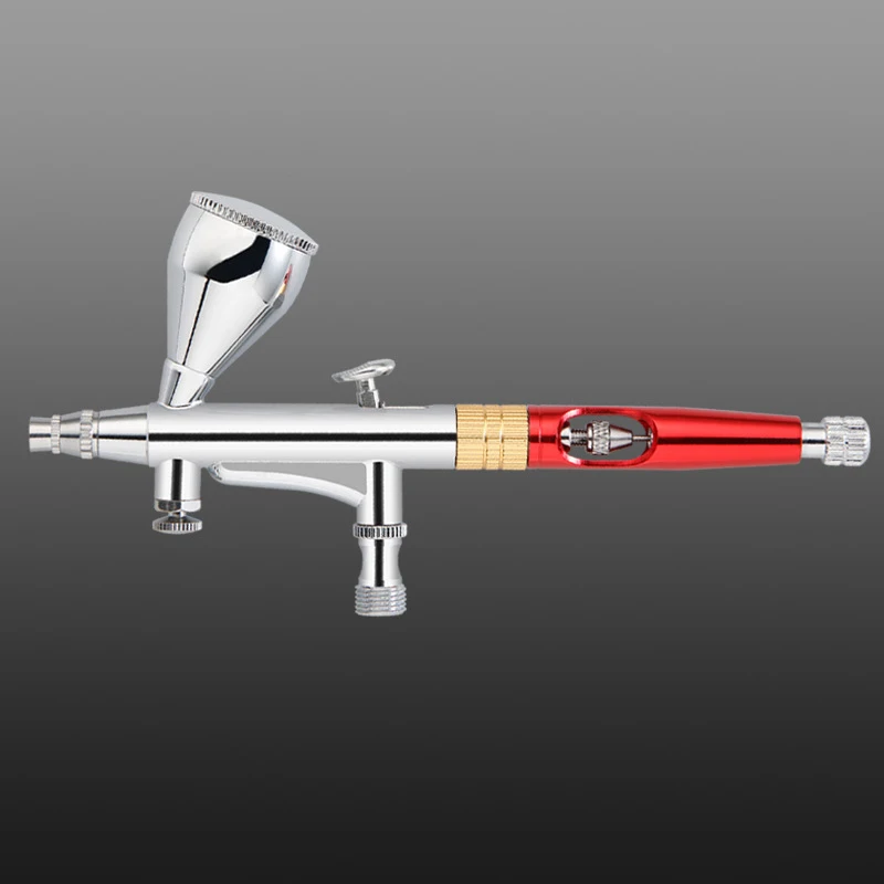 Imagine elevating your modeling and hobby projects with this expertly designed AG181 0.3mm airbrush. Its sleek, polished metallic body features a striking combination of silver, gold, and red accents, giving it a modern and professional aesthetic. The transparent red acrylic section allows you to see the intricate internal mechanisms, emphasizing its technical precision. The fine 0.3mm nozzle paired with a small, textured silver spray tip provides exceptional accuracy for detailed work. Multiple knurled control rings and adjustable knobs enable you to fine-tune airflow and spray flow effortlessly. Crafted for durability and precision, this device turns your creative ideas into reality with ease and style.