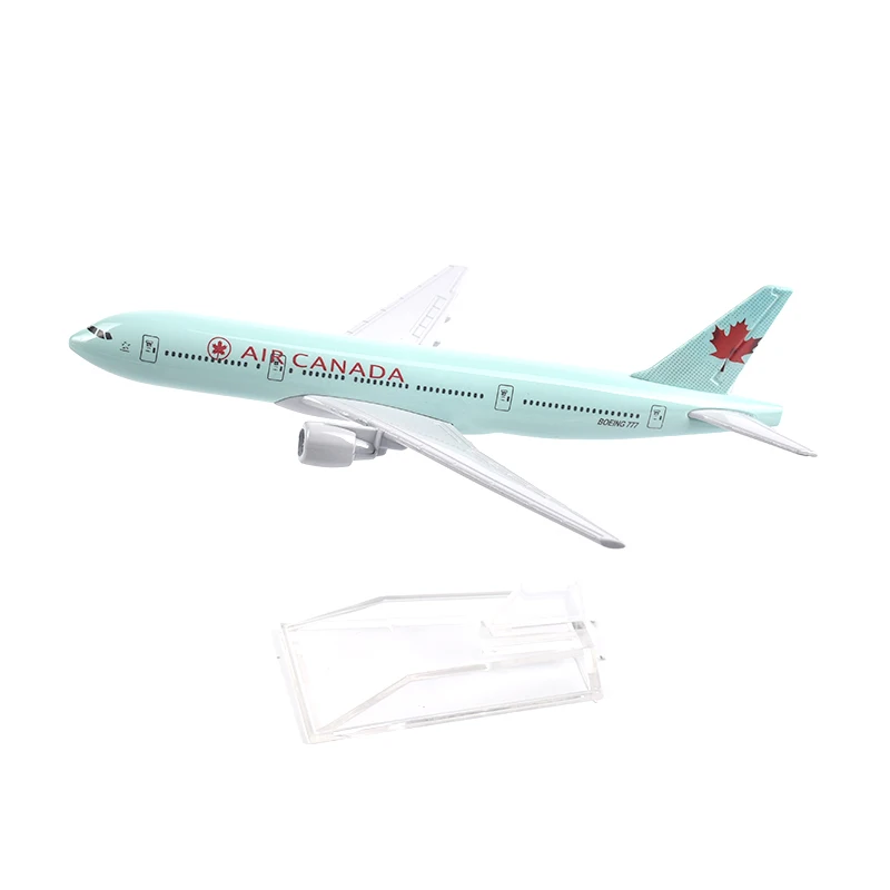 Bring the elegance of commercial aviation into your space with this meticulously crafted 16cm diecast metal model of an Air Canada Boeing 777. Designed at a 1:400 scale, this model captures the sleek silhouette and intricate details of a real aircraft, offering an authentic and visually appealing addition to your collection. Its minimalist pastel turquoise fuselage is beautifully contrasted by the bold red “Air Canada” lettering and iconic maple leaf logo on the tail fin. The model's refined craftsmanship includes detailed panel lines, tiny windows, and winglets that slightly angle upward, all mounted on a clear plastic stand for stability and display. Whether for personal admiration or educational use, this piece embodies the precision and beauty of modern aviation.