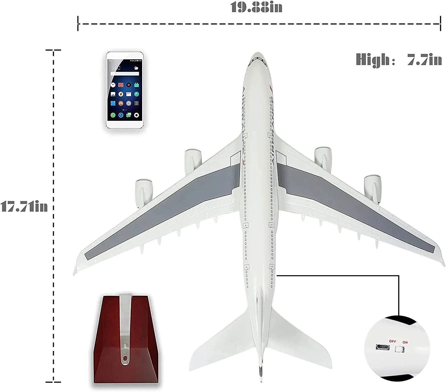 - Includes a black stand with a supportive metal rod to securely showcase the aircraft from multiple angles.