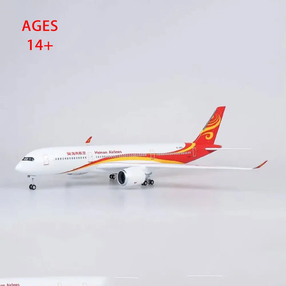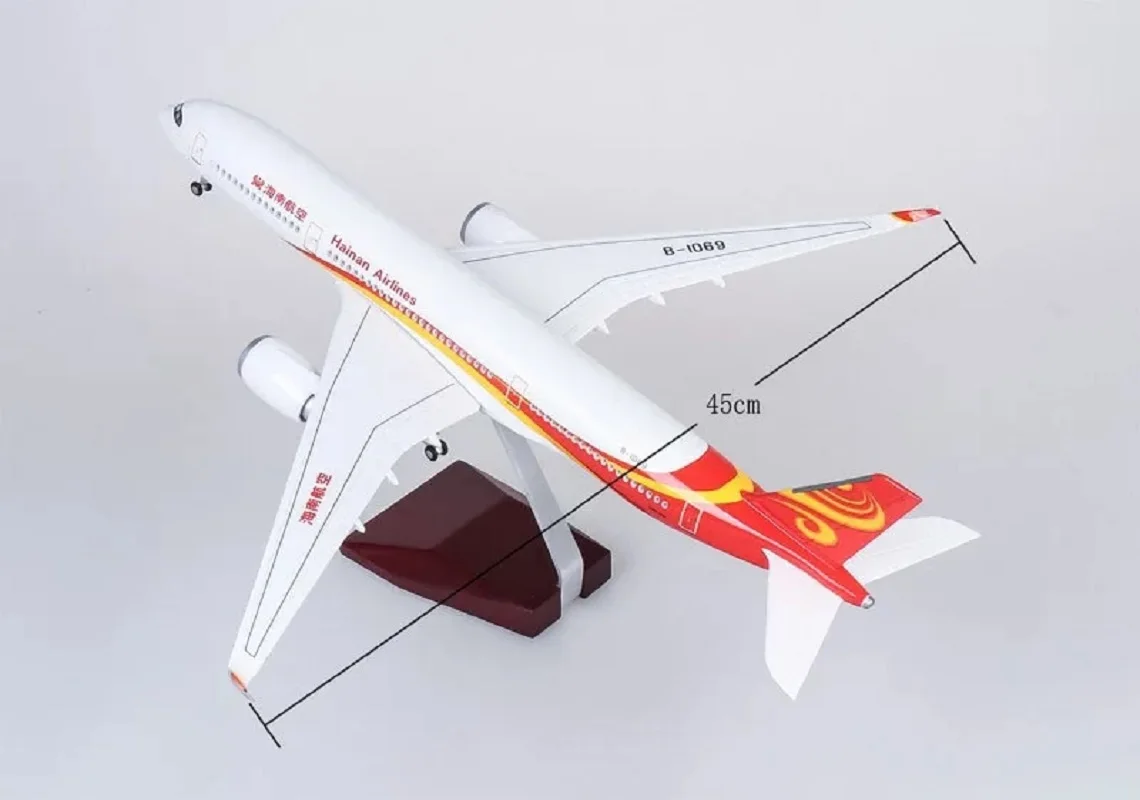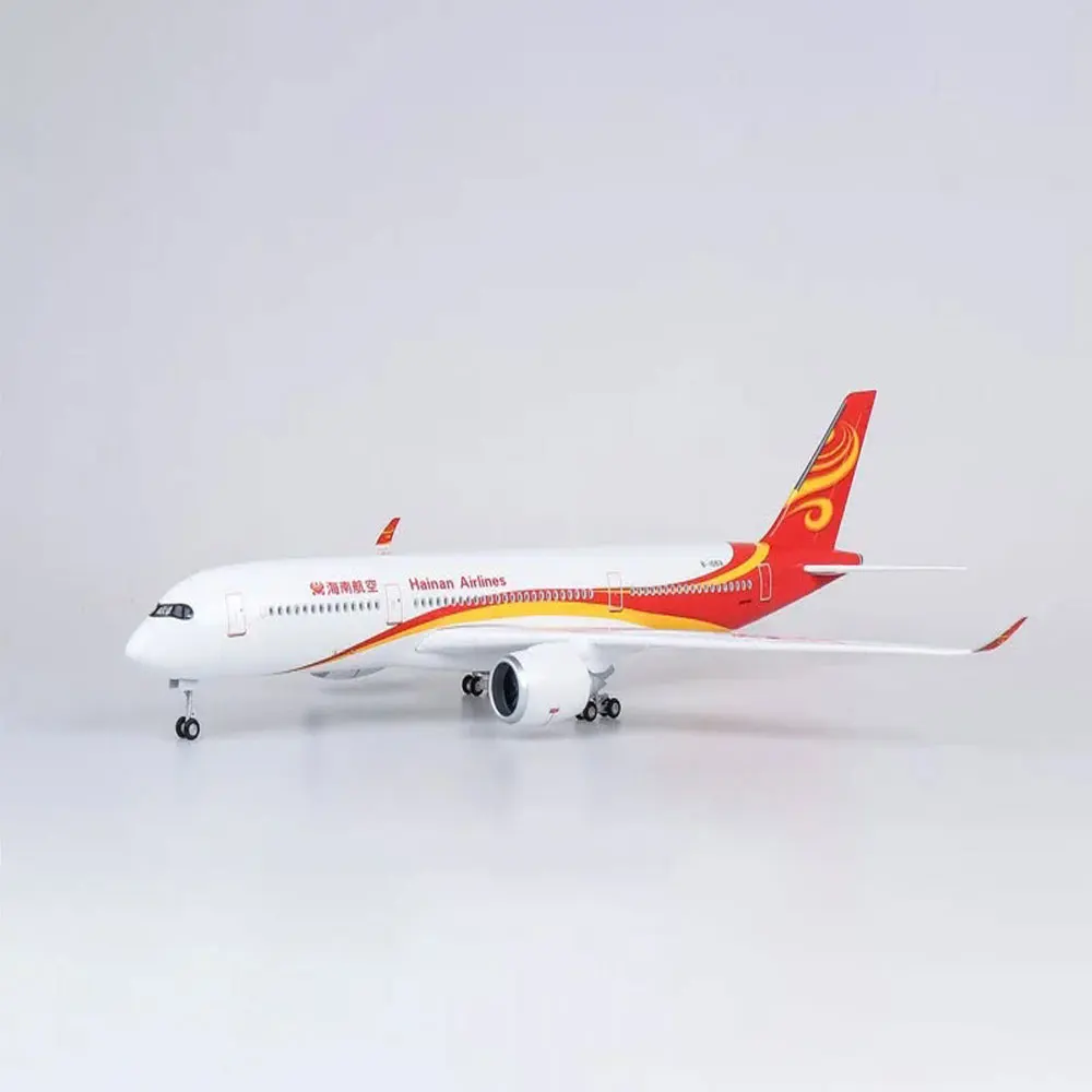 Experience the elegance and craftsmanship of this large, detailed model of the Airbus A350, measuring approximately 47 cm long. Crafted from high-quality resin, it features vibrant accents in red, orange, and yellow near the tail, bringing the sleek aircraft to life. The model includes a sturdy wooden base and metal supports, ensuring stability for display. Its intricate details—such as small windows, realistic wings with upward-curved wingtips, and a colorful swirling pattern on the tail—showcase meticulous craftsmanship. The voice-controlled LED cabin light adds an interactive touch, illuminating your space with a soft glow when triggered. Perfect for collectors, aviation enthusiasts, or stylish interior decor, this model provides an eye-catching visual centerpiece in any setting.