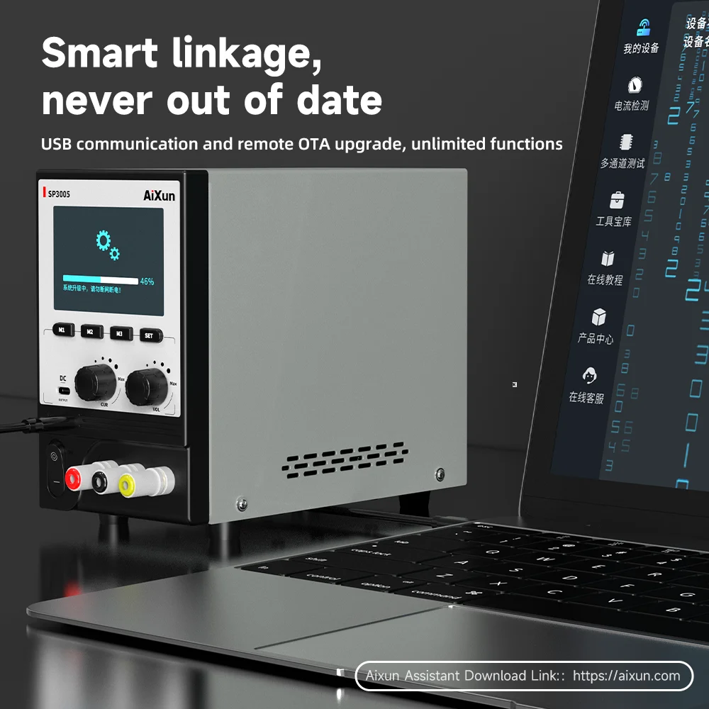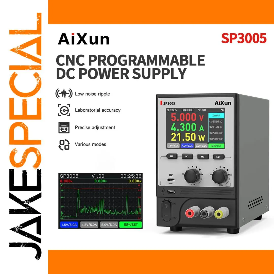 Experience reliable electronic testing with this Aixun SP3005 Programmable Regulated DC Power Supply, designed for professionals and enthusiasts alike. Its sleek, modern design features a vibrant 3.5-inch IPS color display that vividly displays real-time voltage, current, and power output with bold, easy-to-read fonts in red, green, and yellow. The large, ergonomically designed control knobs allow precise manual adjustments, making device configuration seamless. Its sturdy housing combines sheet metal and durable plastic components, ensuring longevity while maintaining portability. The device’s compact size—200mm wide, 100mm deep, and 170mm high—fits comfortably on any workbench. Whether for PCB testing, equipment repair, or circuit development, this power supply combines high-tech features with an intuitive interface to elevate your workflow and ensure accuracy every time.