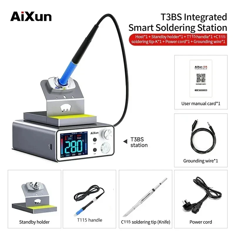 This intelligent soldering station features models T3A, T3B, T3AS, and T3BS, with power ratings of 75W, 96W, and 200W, and output voltages of DC 12V or DC 24V. The compact device operates within a temperature range of 100°C to 450°C (up to 500°C depending on the model) and supports current from 0-8A. The T3B model measures 160*110*54mm, weighs 640g, and heats to 380°C in just 2 seconds with temperature accuracy below 1%. Its 2.4-inch color LCD display provides clear status updates, supporting handles T210 and T115, while meeting industrial ESD standards. Designed for precision soldering of nano and fine components, it features rapid heating, intelligent temperature control, and multiple operational modes, ensuring efficiency and accuracy for expert use.