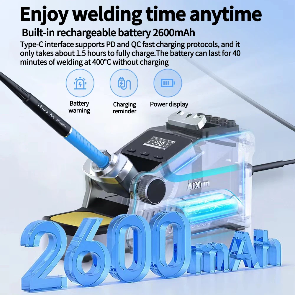 - Features built-in 2600mAh rechargeable battery allowing 40 minutes of continuous welding at 400°C, with fast Type-C charging supporting PD and QC protocols in about 1.5 hours.