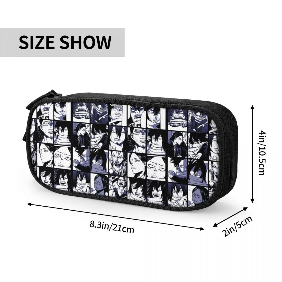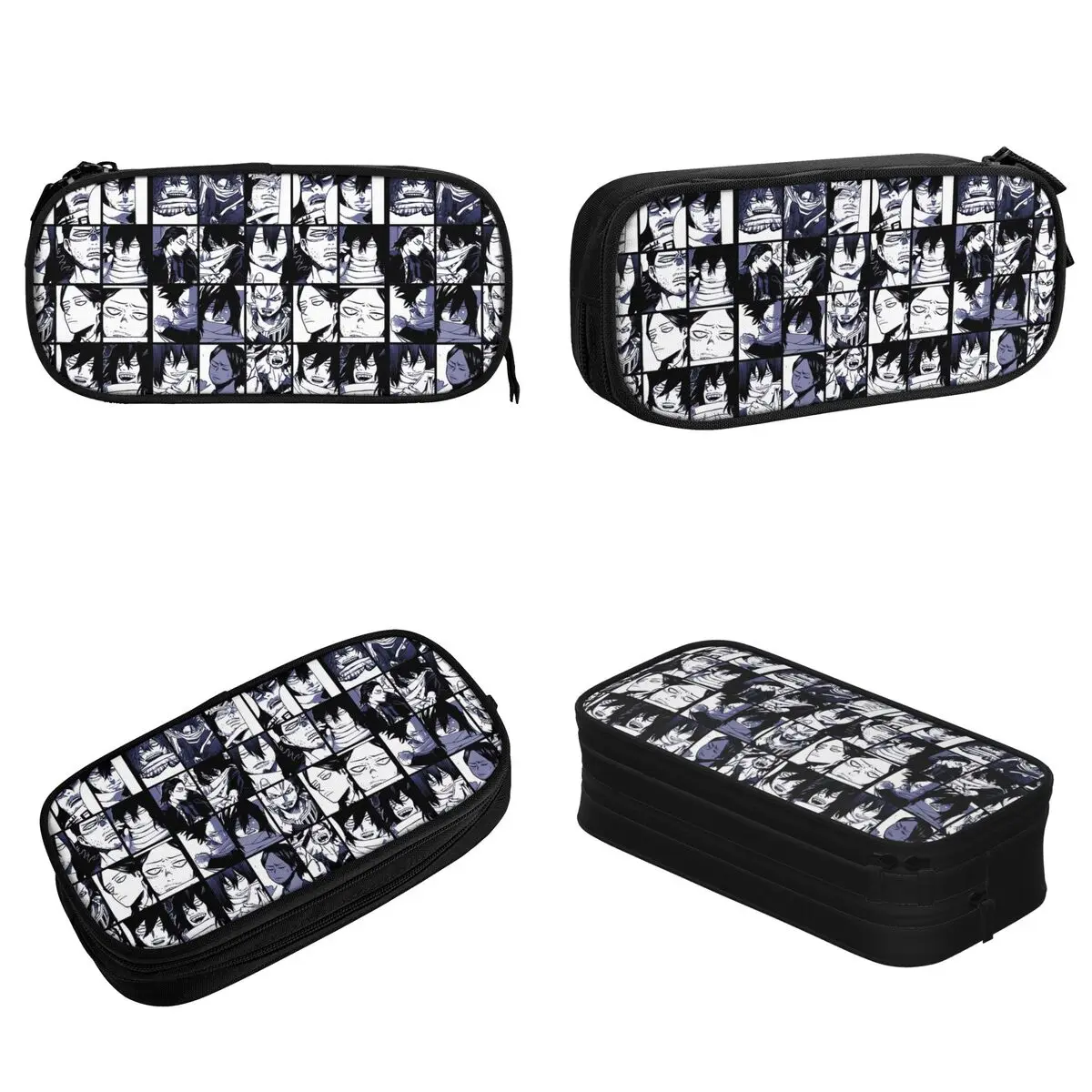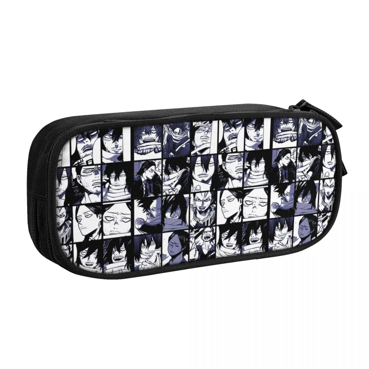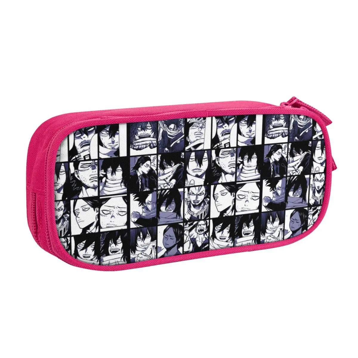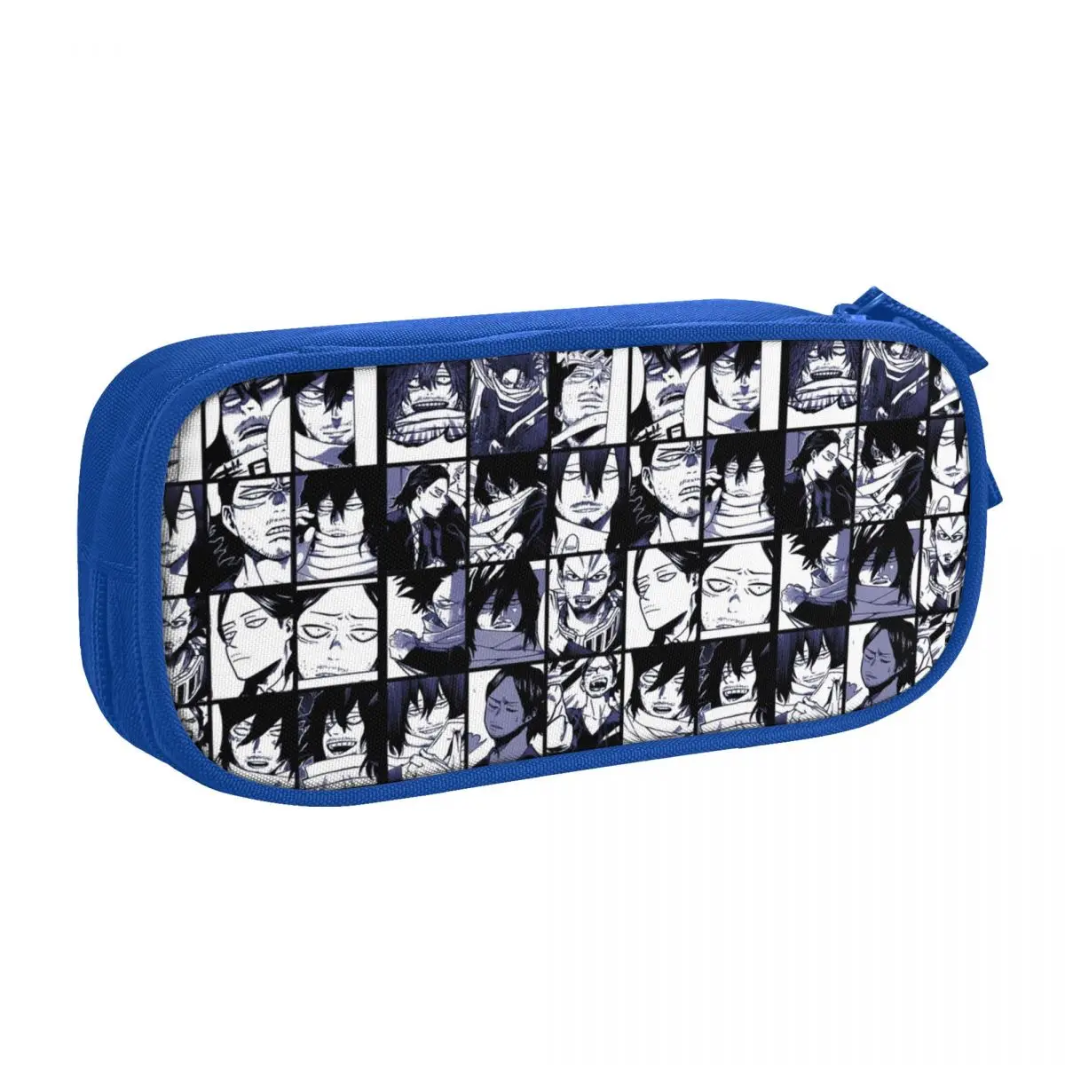 The My Hero Academia Aizawa Shota Collage Pencil Case is an elongated oval-shaped accessory, predominantly black with a vibrant printed design featuring a dynamic grid of Aizawa Shota’s various expressions in a striking blue and white palette. Made from a durable fabric blend, this pencil case not only ensures longevity but adds a unique anime-inspired style to your collection. It includes a sturdy black zipper for secure closure and offers ample storage with two interior compartments; one side features elastic straps for pens, while the other has a mesh pocket for additional organization. Available in Pink, Black, and Blue.