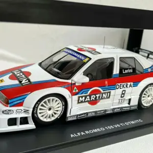 Experience the thrill of racing with this stunning 1:18 scale diecast model of the 1995 Alfa Romeo #8 car, meticulously crafted for collectors. The sleek, predominantly white body is highlighted by vibrant racing decals in red, blue, and black, capturing the essence of high-performance racing aesthetics. Prominent sponsor logos, including a bold “MARTINI” on the hood and others like “MANNESMANN,” “KARTINI,” and “Michelin,” enhance its authentic look. The model features functional front wheels that turn, and the doors are openable to reveal a finely detailed cockpit with seats, steering wheel, and window surrounds, adding realism. Its aerodynamic design and intricate detailing perfectly emulate the racing car's powerful presence on the track.