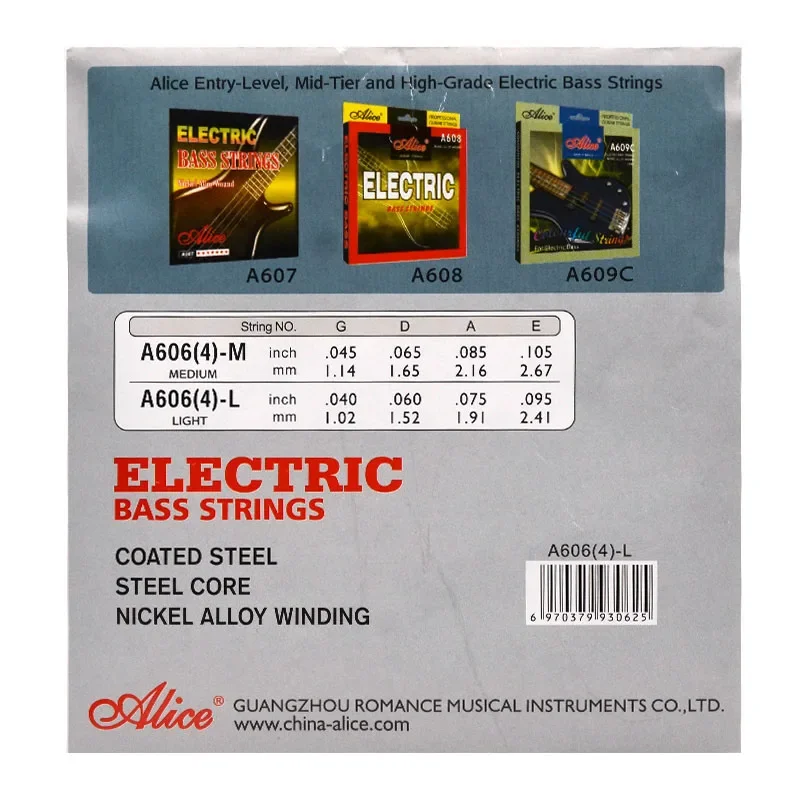 Experience enhanced tone and playability with this set of four steel core, nickel-alloy wound bass strings from Alice. Designed for precision and durability, each string features a polished metallic sheen that reflects light beautifully, adding a sleek, modern look to your instrument. The varied gauges of .040, .060, .075, and .095″ ensure a full range of deep lows to bright highs. The high-quality steel core provides strength and stability, while the nickel alloy wrapping delivers warm, rich sound. The strings are neatly organized in a clear plastic bag for protection. Whether you're recording or performing live, this set promises consistent performance and excellent sound clarity for your bass guitar.