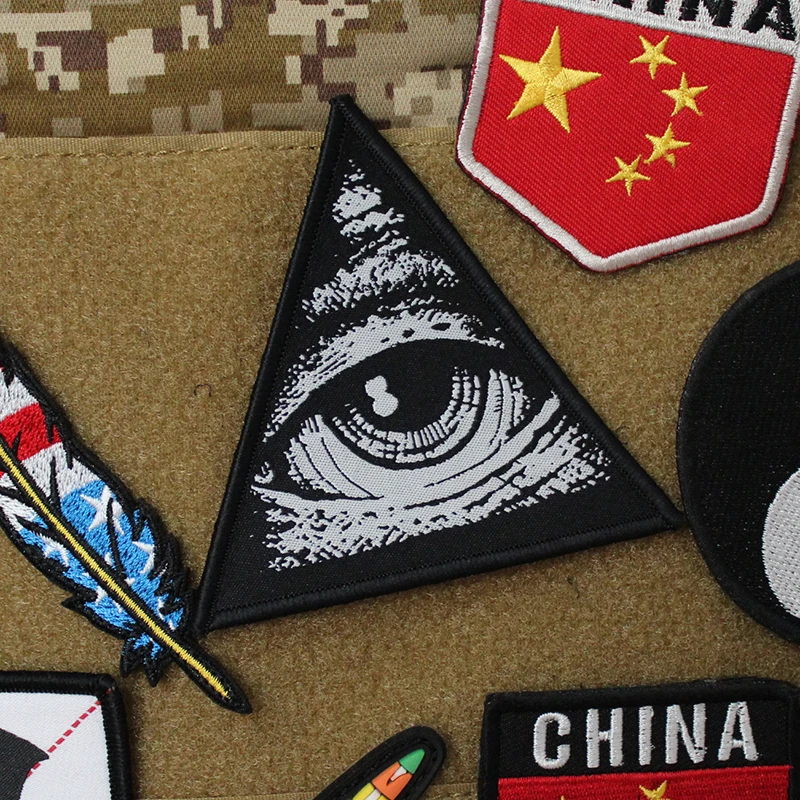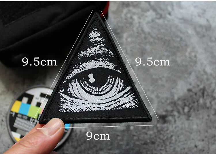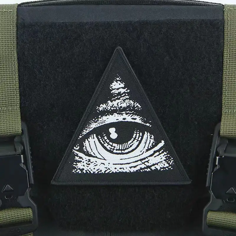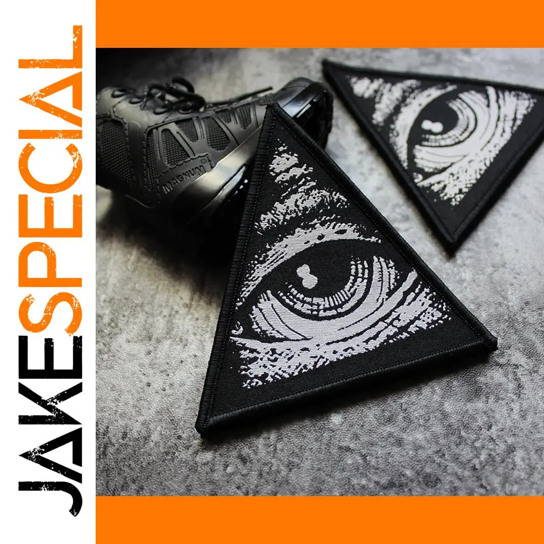 Enhance your style with this edgy triangle all-seeing eye patch, measuring 9 x 9.5 x 9.5 cm, featuring a striking “Eye of God” design in intricate white linework on a black polyester fabric background. Its bold, graphic aesthetic is outlined with a narrow black border, creating a sharp, modern look perfect for customizing clothing, backpacks, or hats. Handmade and eco-friendly, this printed applique accessory offers versatile DIY applications, with hook and loop fastenings for easy attachment. Available in bulk quantities over 50 pieces, it’s ideal for adding a mysterious, impactful touch to your wardrobe accessories.