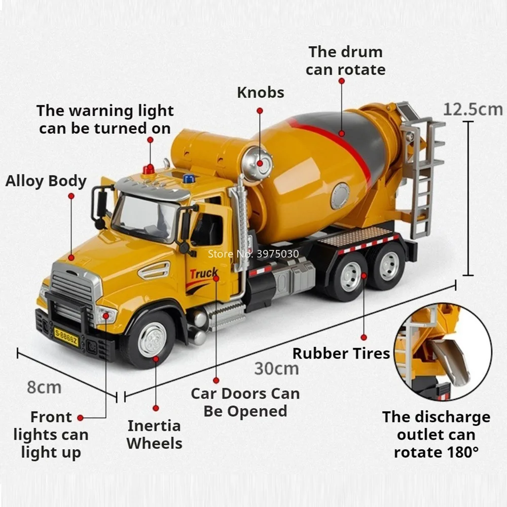 Experience the excitement of construction with this detailed alloy diecast engineering toy set, featuring four high-simulation yellow vehicles: a mixer truck (30 x 8 x 12.5 cm), excavator (28 x 8.3 x 17 cm), crane (34 x 9.5 x 15 cm), and transport vehicle (35 x 9 x 12 cm). Crafted with zinc metal bodies, plastic chassis, and rubber tires, these models showcase realistic functions, including opening doors, sound and light effects, and sliding movement, all powered by included batteries. Built for durability and crafted to inspire imagination, this set is perfect for enthusiasts aged 14 and above, elevating your collection with precision and industrial charm.