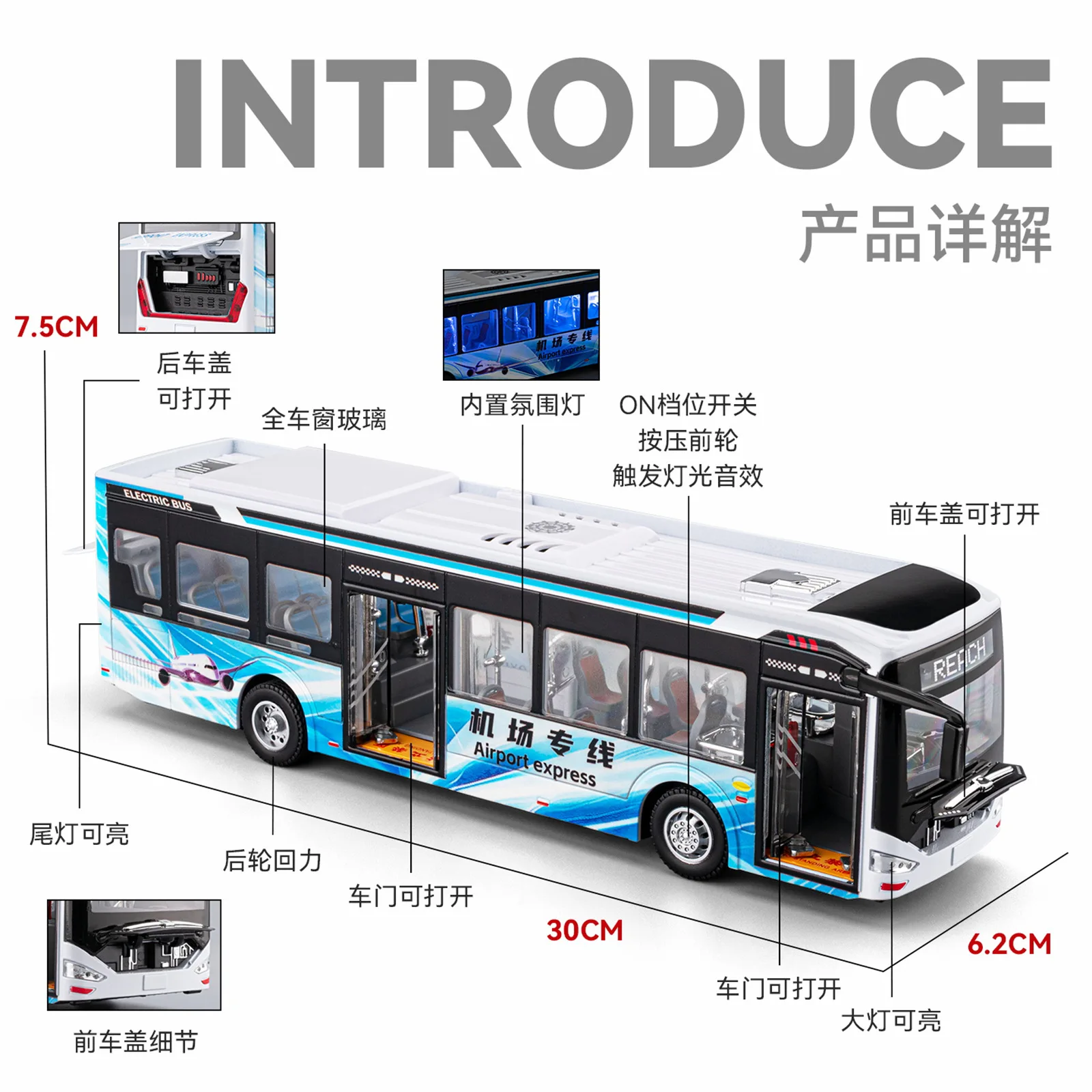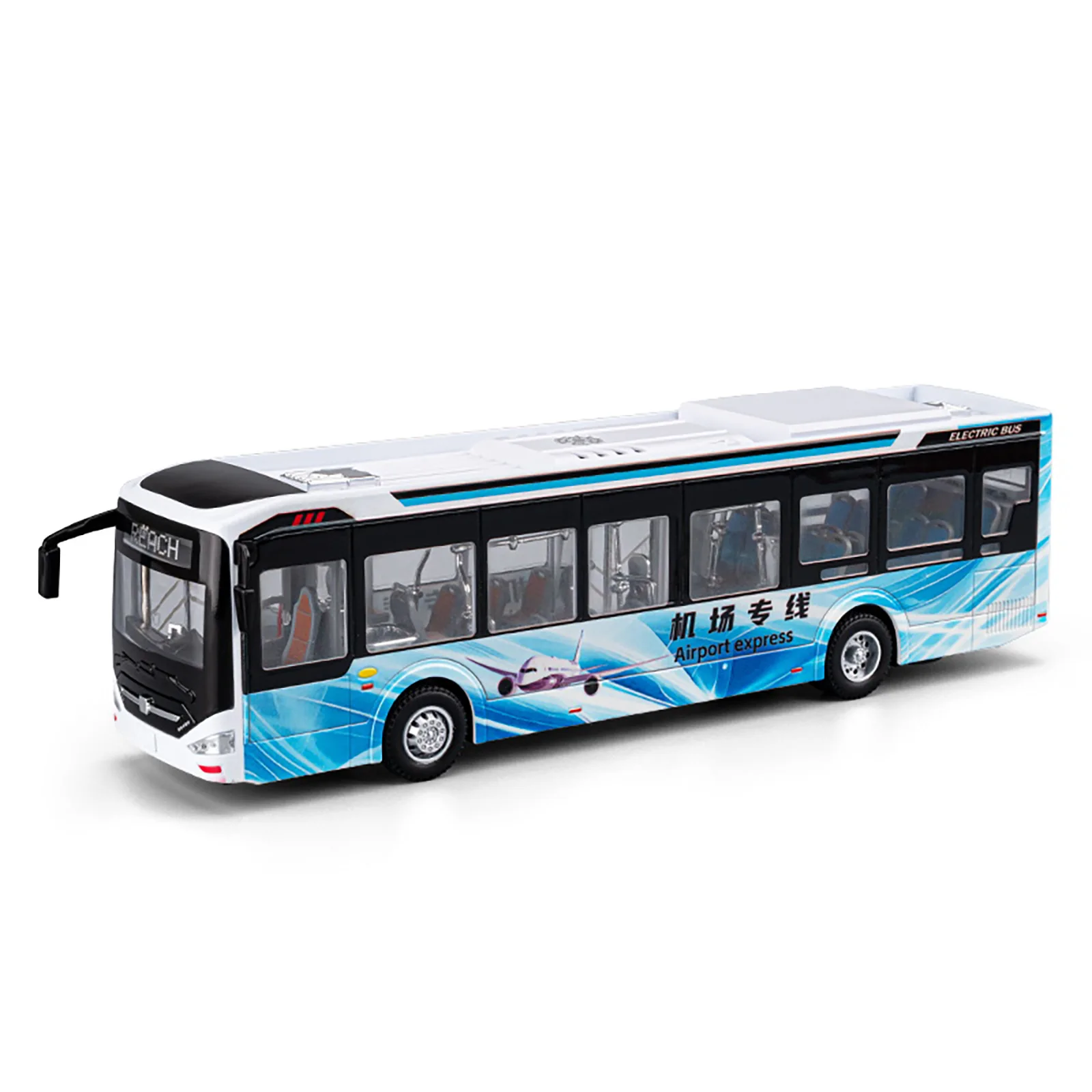 Experience the realism of this large alloy electric tourist bus model, crafted from durable diecast metal and featuring metallic-looking wheels with intricate hubcaps. Its sleek white body is highlighted by bold red accents along the lower sides, complemented by transparent rectangular windows revealing detailed interior seating. The front showcases a realistic curved windshield, headlight-equipped grille, and side mirrors, while the roof includes vents and air conditioning units. Equipped with functional sound and light effects powered by batteries and accessible controls, this modern city transit replica offers an authentic appearance with black window frames and vibrant color details, making it a captivating addition for display, gifting, or interactive collection use.