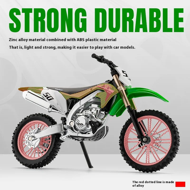 This exquisite alloy motorcycle model serves as a unique decoration for your car center console. Featuring a striking vibrant green body with white accents, it prominently displays the number “50” and identifies as a KX450. Crafted from durable zinc alloy, the model weighs 0.5 kg and showcases realistic details including a chrome exhaust pipe, intricately designed wheels, and a metallic gold front fork. The rugged tire tread pattern adds to its off-road aesthetic, while the stable base mimics dirt terrain for a lifelike presentation. Perfect for motorcycle enthusiasts and collectors, this piece will enhance any setting with its stylish flair.