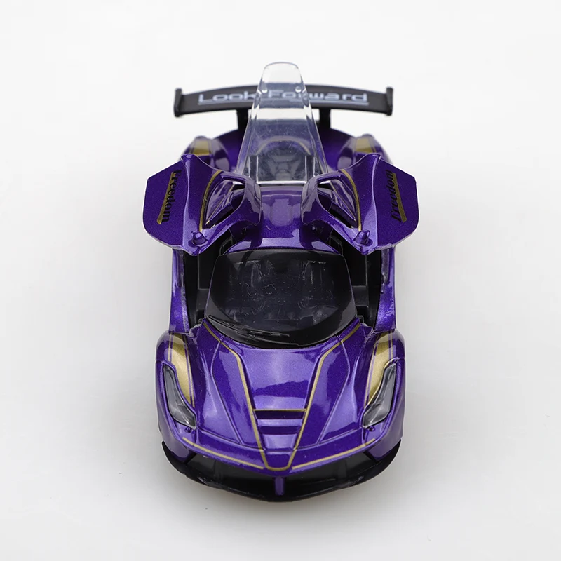 Experience the thrill of high-performance supercars with this beautifully crafted alloy pull-back car. Designed at a 1:36 scale, it combines sleek, aerodynamic aesthetics with durable metal construction that withstands everyday play and display. The vibrant colors—purple, yellow, white, and blue—highlight its dynamic style, with glossy finishes that mimic real racing vehicles. The detailed design features including racing lines, spoiler wings, and sharp body contours give it a realistic and energetic look. Ideal for both collectors and children, this toy brings excitement and sophistication to any collection. Its non-electronic, battery-free operation emphasizes simplicity and pure mechanical fun, making it a versatile addition to any toy or display shelf.