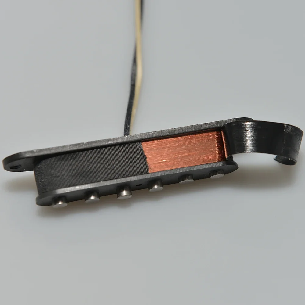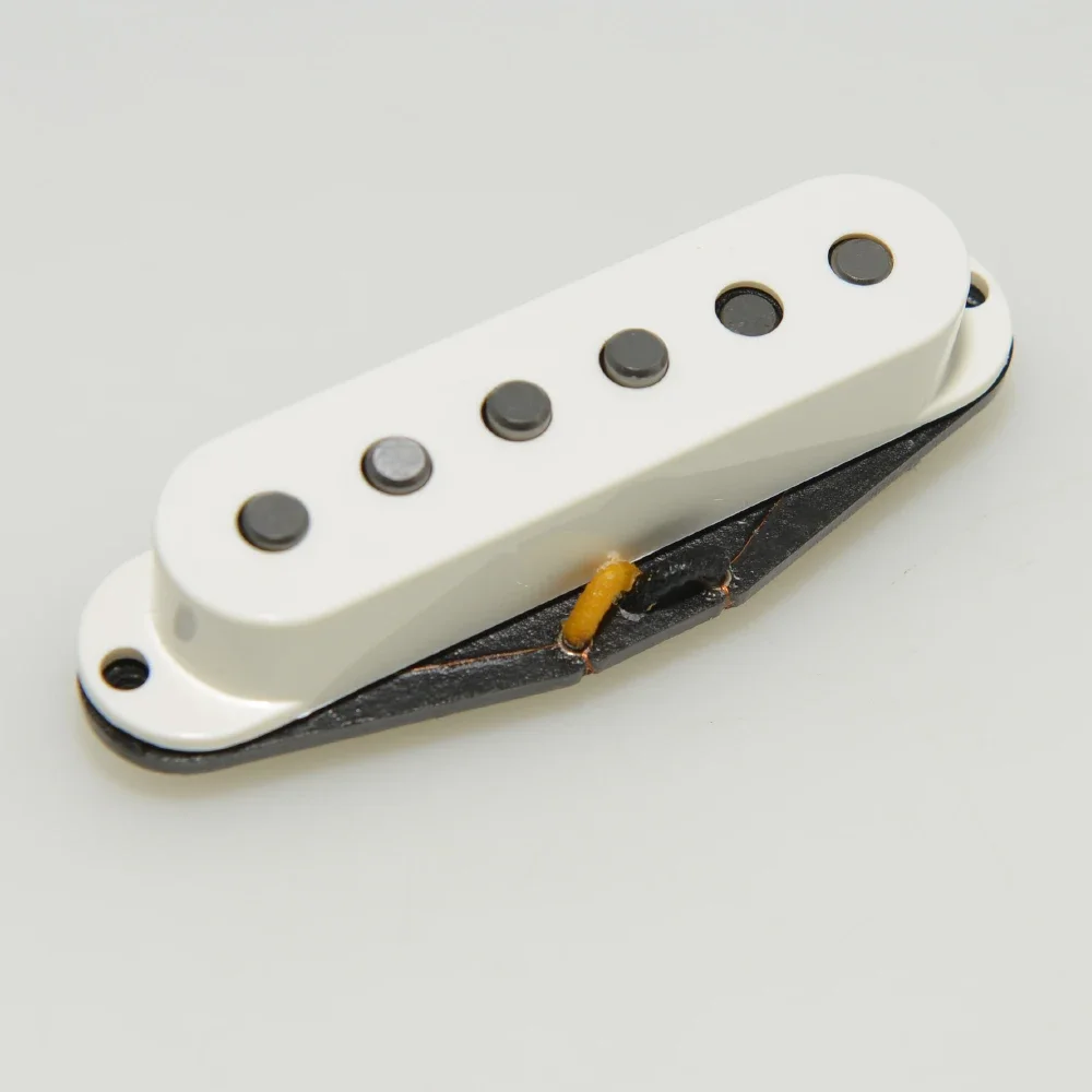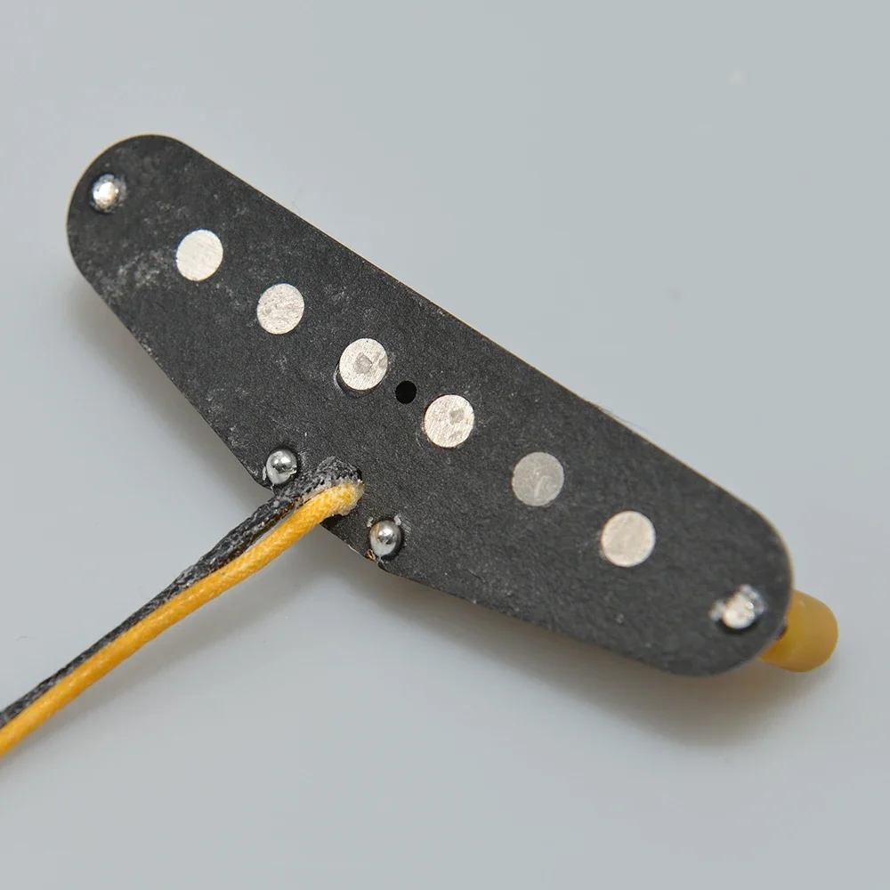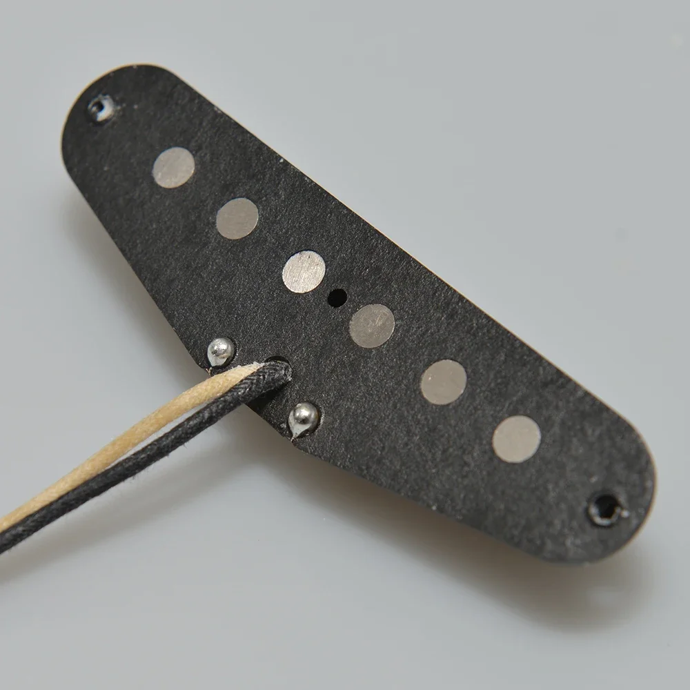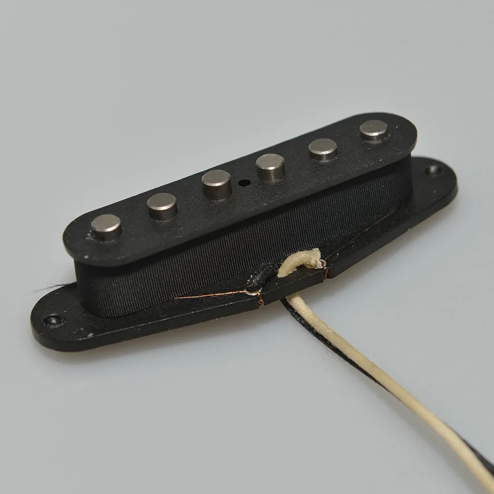 Enhance your electric guitar’s sound with this versatile single-coil pickup featuring a durable metal construction and available with Alnico 2, Alnico 3, or Alnico 5 magnets. It offers resistance from approximately 5.8 to 6.8 kilo-ohms, depending on the model, and features six adjustable raised pole pieces for optimal string alignment. Designed for replacement or customization, its sleek black top plate provides a classic, understated look, while the tightly wound copper coil contributes to rich tonal output. The sturdy black base includes mounting holes for straightforward installation, and the connected black and white wires add vintage character with a slightly aged appearance.