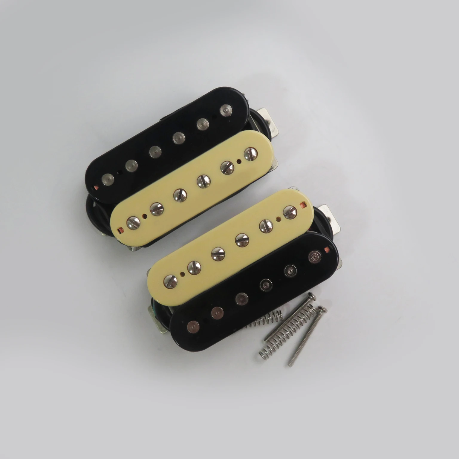 Experience the perfect blend of style and functionality with this set of two high-quality Alnico 5 humbucking pickups. Designed to elevate your guitar's tone, these pickups feature a classic look with contrasting color covers—a sleek black gloss for the neck and a warm cream or ivory for the bridge—creating an eye-catching, vintage-inspired aesthetic. Both pickups boast meticulous craftsmanship, including adjustable pole pieces for optimal sound tailoring, durable metal construction with nickel silver bases, and vacuum wax potting to prevent squeal and feedback. Whether you're aiming for smooth jazz, gritty blues, or powerful rock sounds, this set provides versatile control and classic tone, making it an essential addition to any serious guitarist’s arsenal.