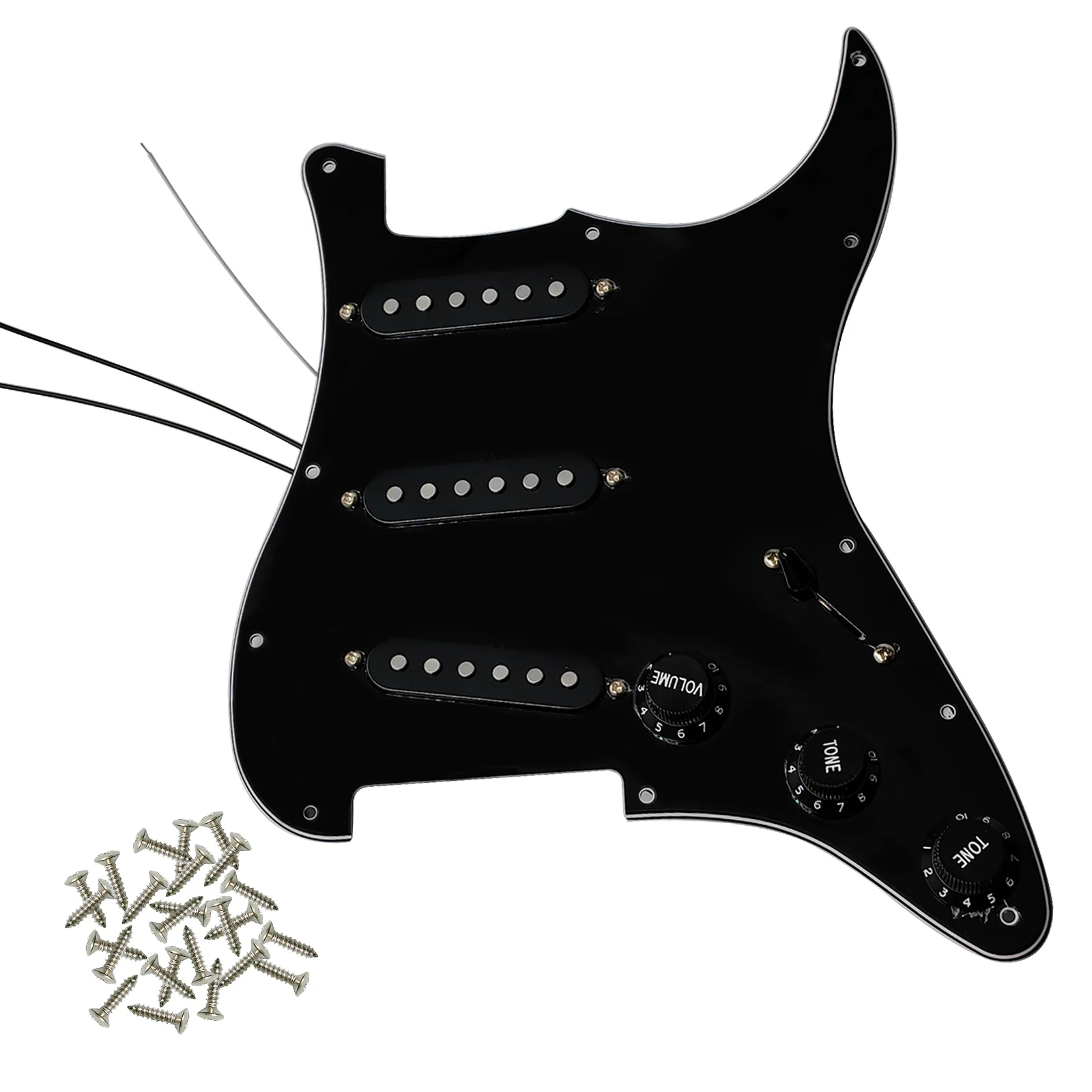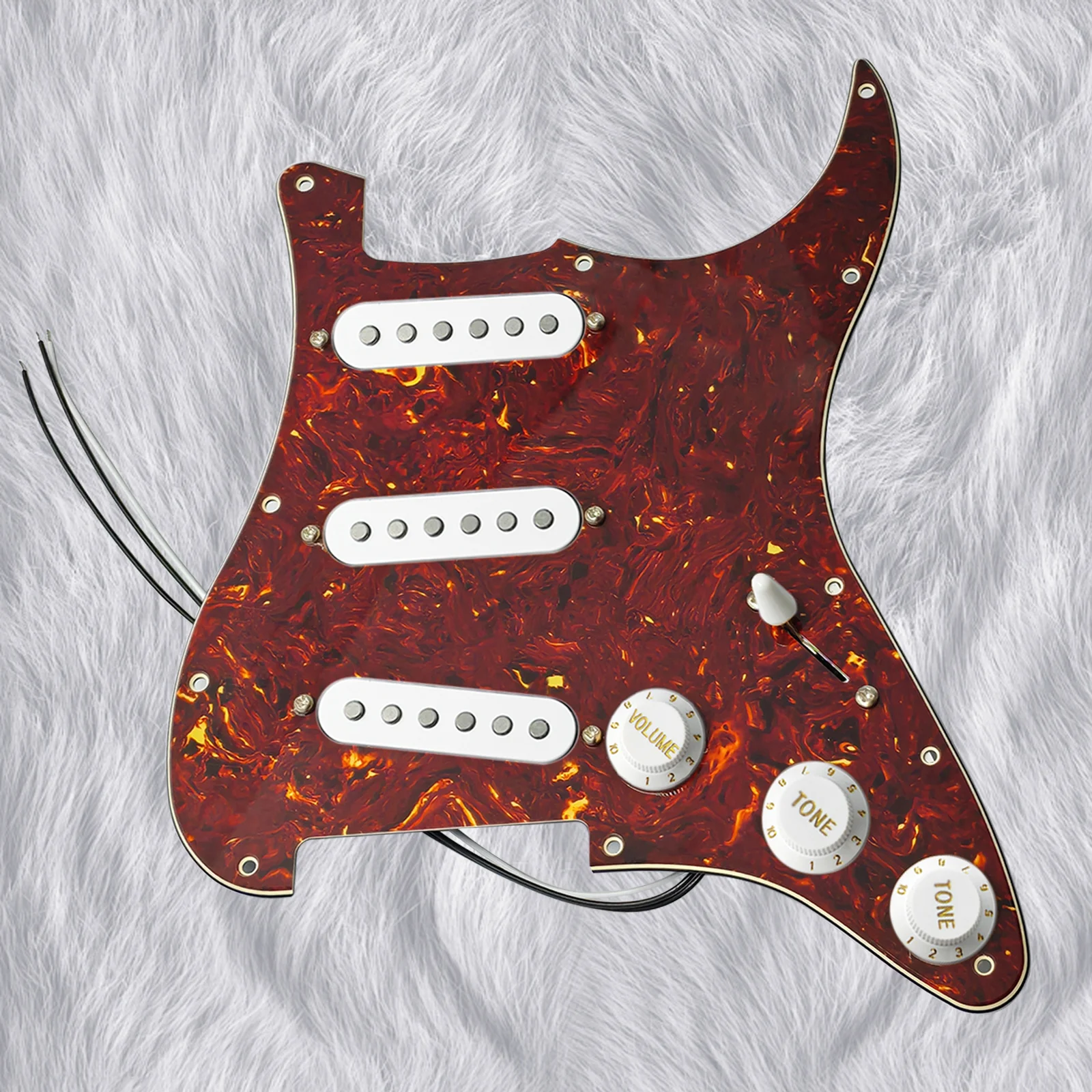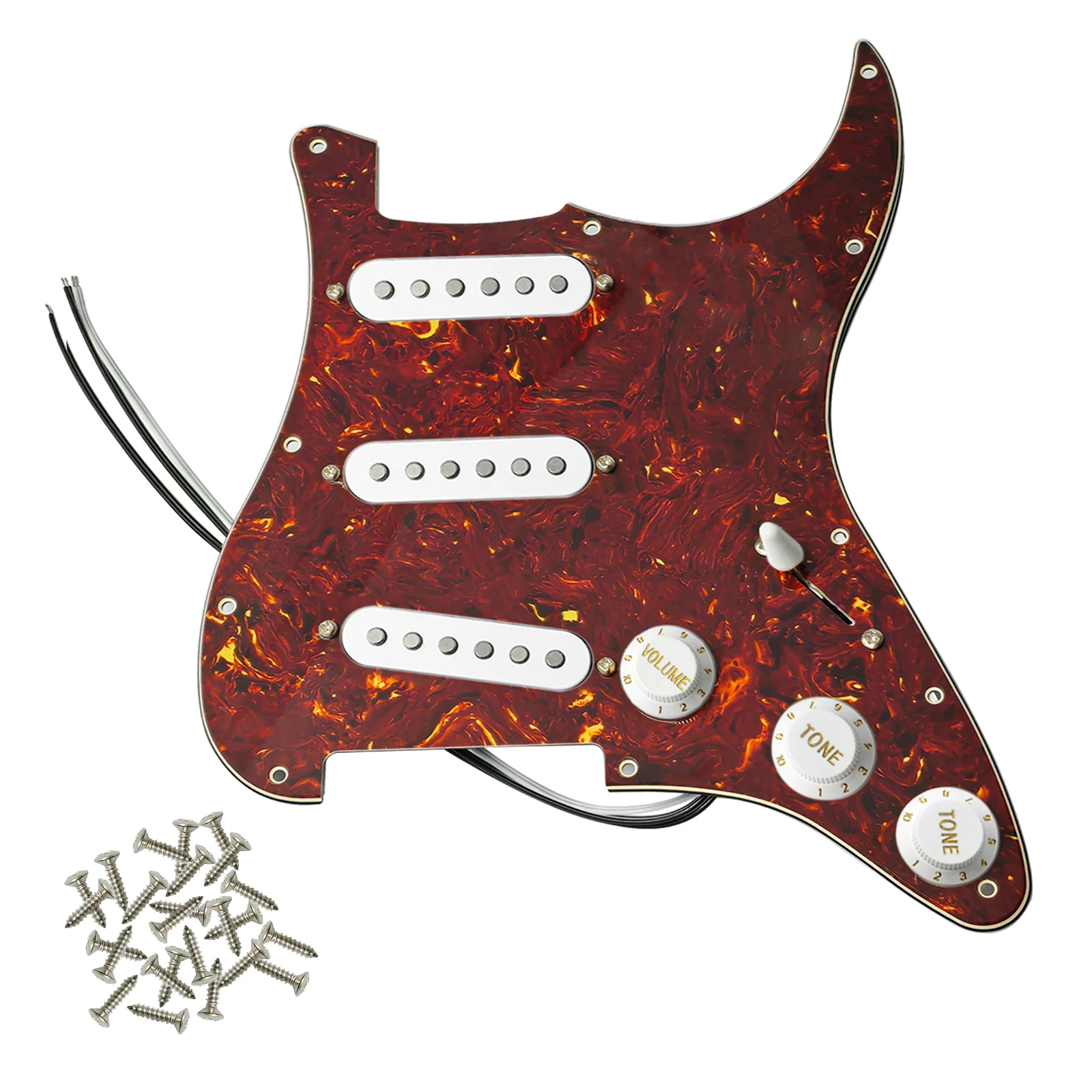 Imagine upgrading your guitar with this premium pre-wired setup, bringing vibrant clarity and warm sound to every note. Designed specifically for Stratocaster-style guitars, this set features staggered Alnico 5 single-coil pickups that deliver a balanced, musical response. The beautifully contoured pickguards are available in four distinctive colors: crisp white 3-ply, elegant cream 3-ply, classic black 3-ply, and rich brown tortoise shell, adding vintage charm to your instrument. The set includes all essential wiring, knobs, and a 5-way switch, making installation straightforward. Whether you’re recording, performing live, or practicing, this pickup set guarantees reliability, excellent sound quality, and a stylish appearance that will turn heads on stage.