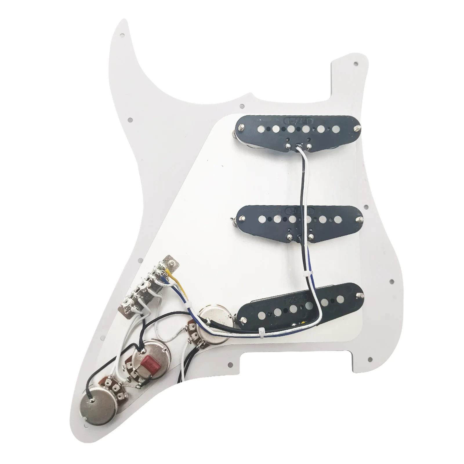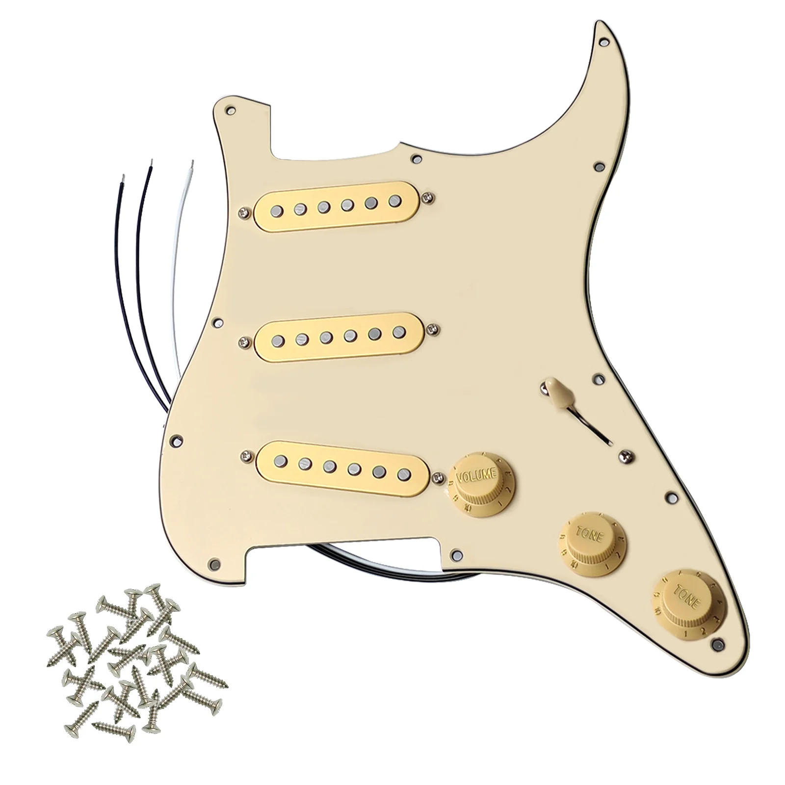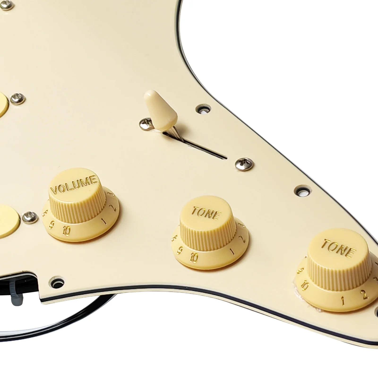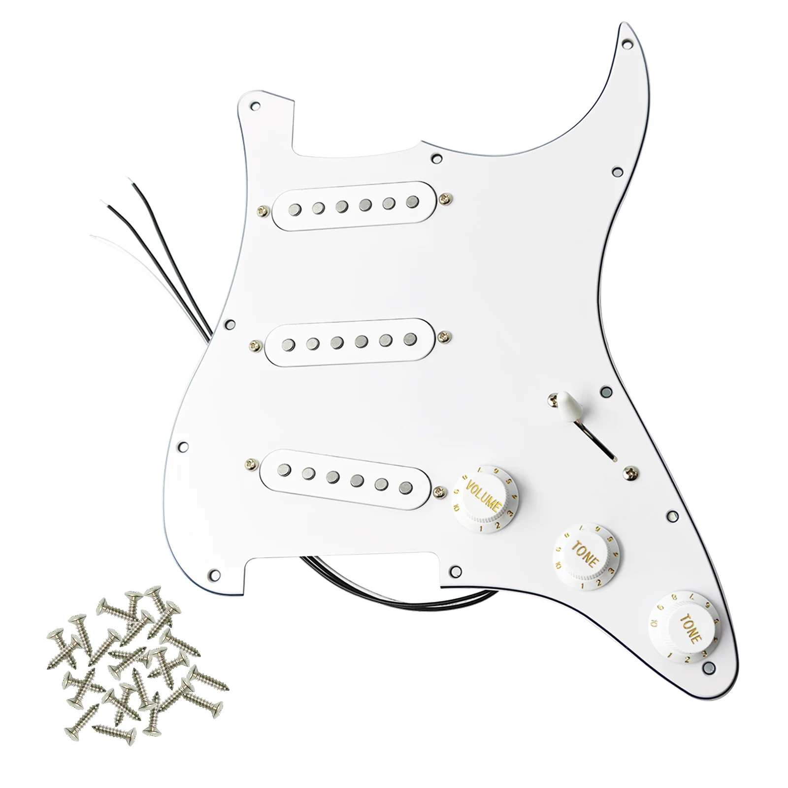 Imagine upgrading your guitar with this premium pre-wired setup, bringing vibrant clarity and warm sound to every note. Designed specifically for Stratocaster-style guitars, this set features staggered Alnico 5 single-coil pickups that deliver a balanced, musical response. The beautifully contoured pickguards are available in four distinctive colors: crisp white 3-ply, elegant cream 3-ply, classic black 3-ply, and rich brown tortoise shell, adding vintage charm to your instrument. The set includes all essential wiring, knobs, and a 5-way switch, making installation straightforward. Whether you’re recording, performing live, or practicing, this pickup set guarantees reliability, excellent sound quality, and a stylish appearance that will turn heads on stage.