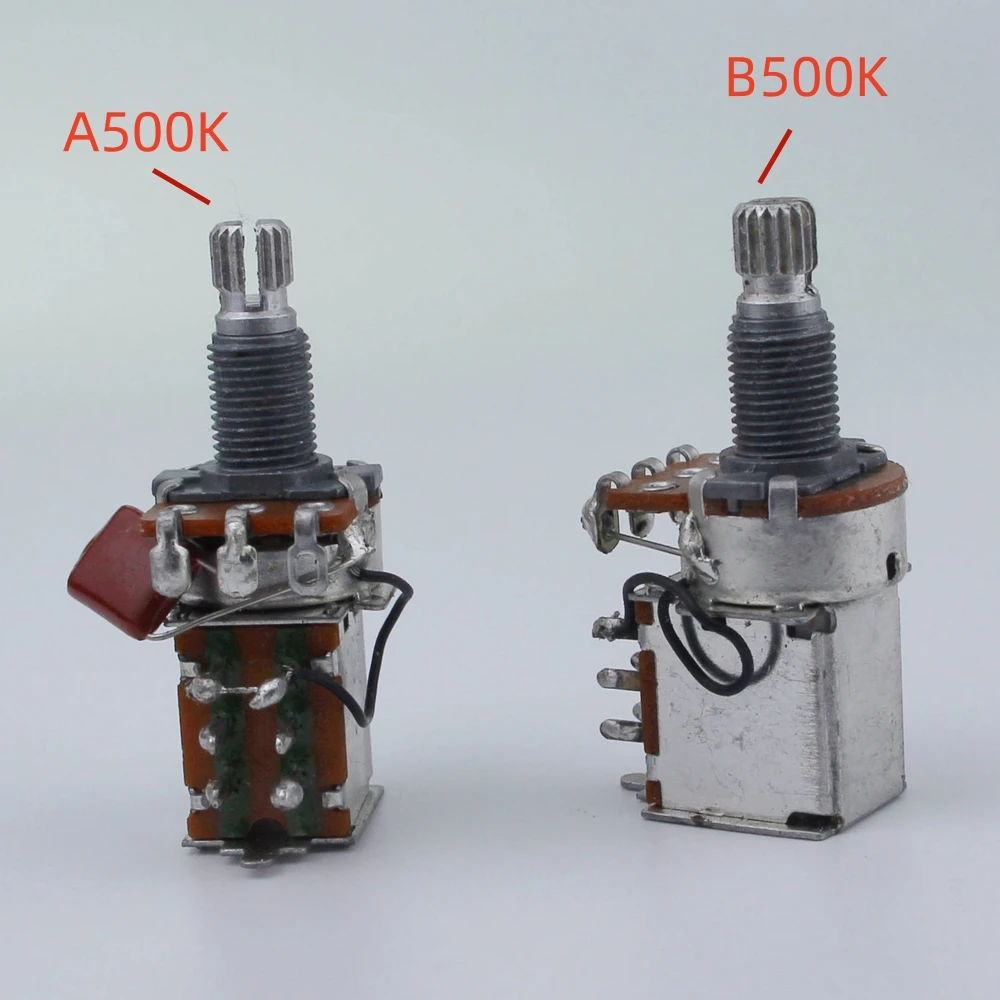 Experience precise control with this durable 500k audio taper push/pull potentiometer, ideal for guitar and bass applications. Available in two models: A500K with a darker, aged metal finish, and B500K featuring a sleek, polished silver appearance. Both units feature knurled metal shafts for easy grip and adjustment, with rectangular bases showcasing exposed internal components or smooth metallic surfaces for a refined look. Constructed from high-quality metal with solder joints, these potentiometers ensure reliable performance in your instrument. Designed with a standard model number of 1607, they offer excellent stability and compatibility, making them a perfect upgrade for customizing your sound with confidence.
