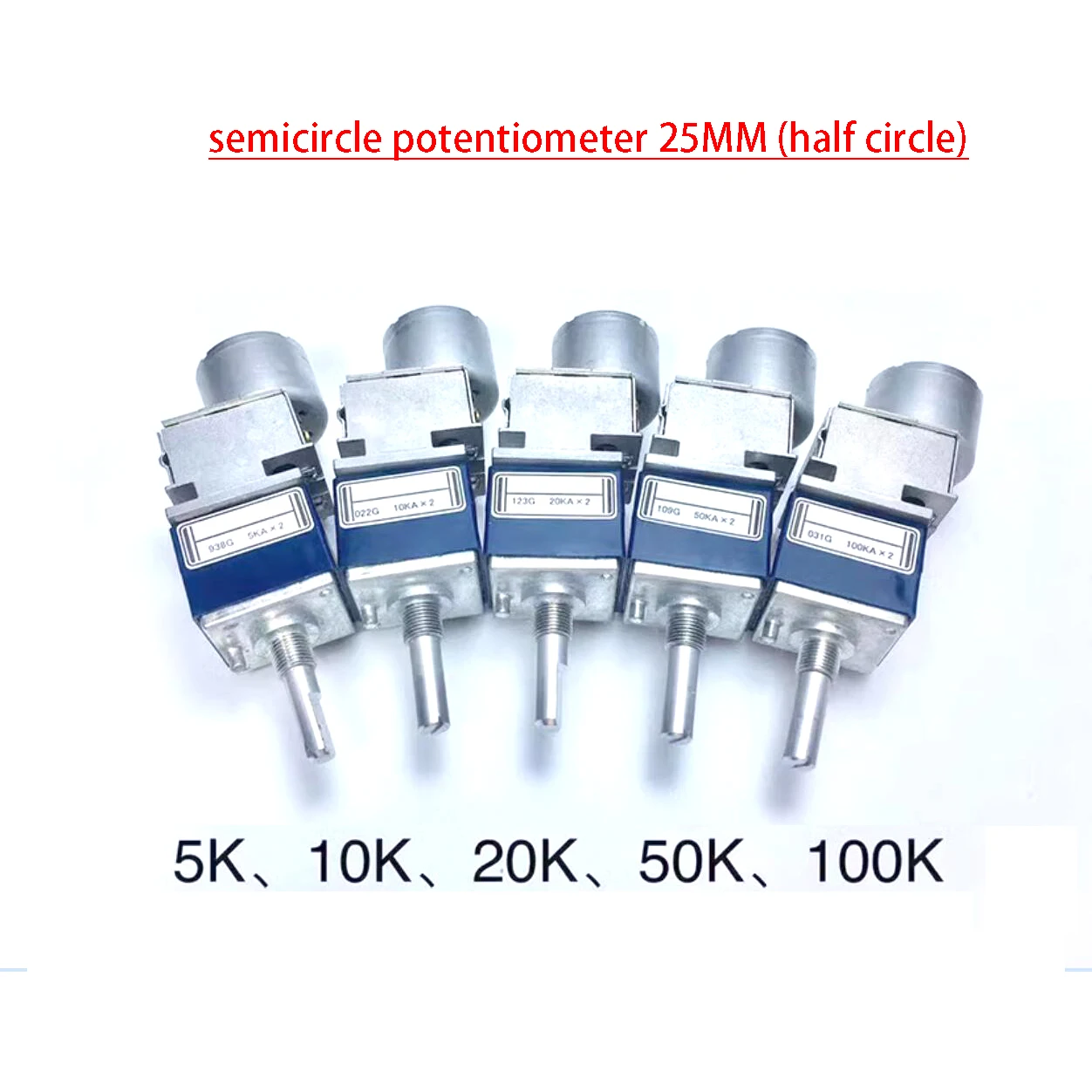 - The silver-colored, compact motor potentiometer measures 25mm in semicircular (half-circle) form, ensuring precise adjustment of audio signals with smooth operation.