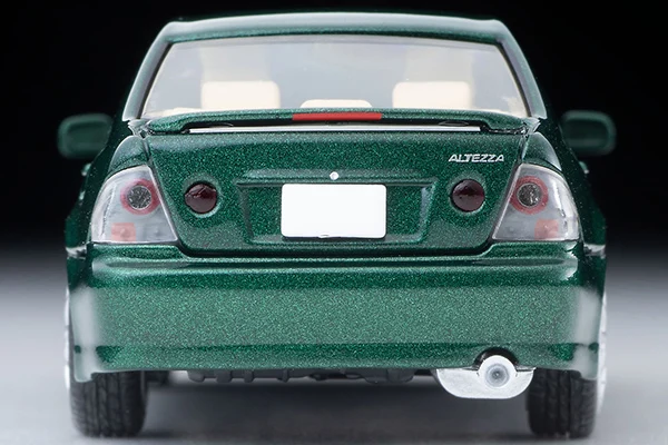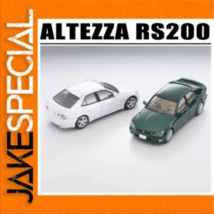 Discover the stunning ALTEZZA RS200 diecast model vehicle by TAKARA TOMY, meticulously crafted at a 1:64 scale. This collection features two models: a sleek white sedan with a curved roofline and detailed windows, and a glossy dark green sportier version showcasing intricate headlights and an aggressive front grille. Both models boast finely crafted wheels that mimic a realistic alloy look, enhancing their authenticity. Ideal for collectors, each diecast model captures exquisite detailing and craftsmanship. Experience the artistry of the Tomica TLV-N227d collection, perfect for display or as a thoughtful gift.