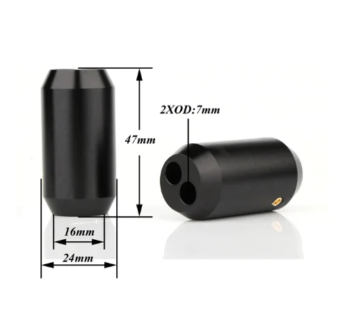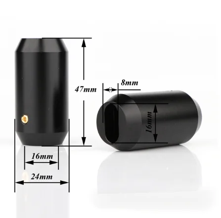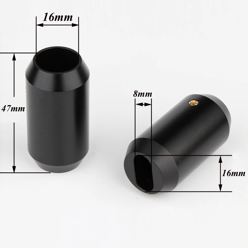 Experience high-quality sound with this set of four aluminium Y splitters designed for speaker RCA connections. Featuring a modern, minimalistic style, these splitters come in matte black with smooth, precisely machined surfaces that complement any high-end audio setup. Each splitter includes a female connector branching into two male connectors, measuring 47 mm in total length. The internal diameter spans 16 mm, with outer diameters of 7 mm for the AL1607 version and 8 mm for the AL1608 version, ensuring a secure fit. These splitters provide excellent durability and signal integrity for DIY audio wiring projects, making them ideal for audiophiles and sound engineers alike. Their streamlined aesthetic combines functionality with professional appeal, elevating your audio experience.