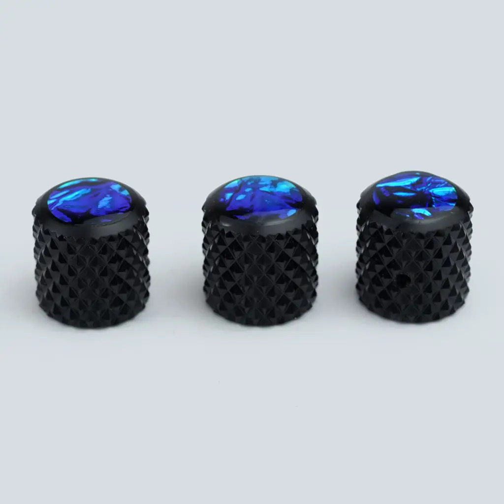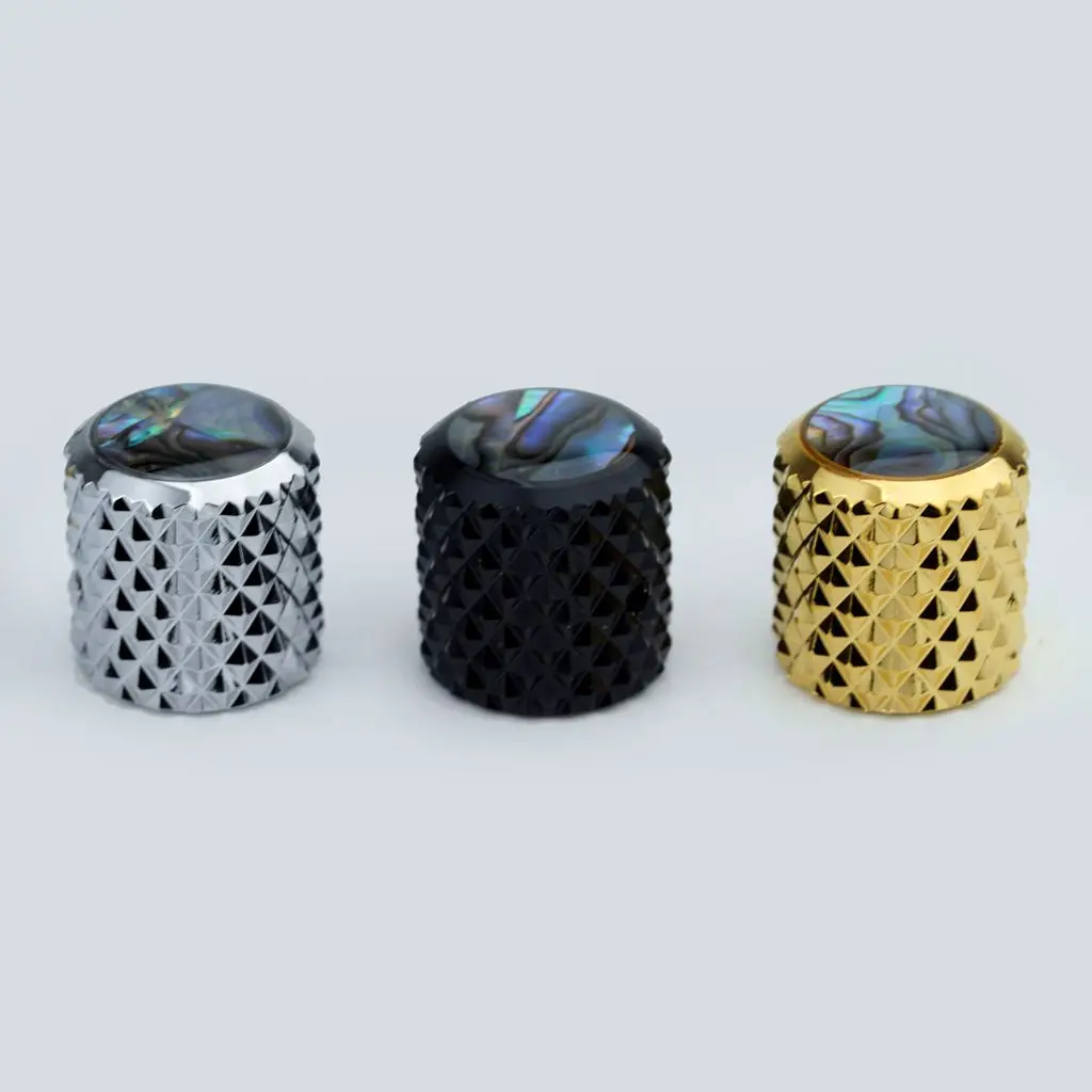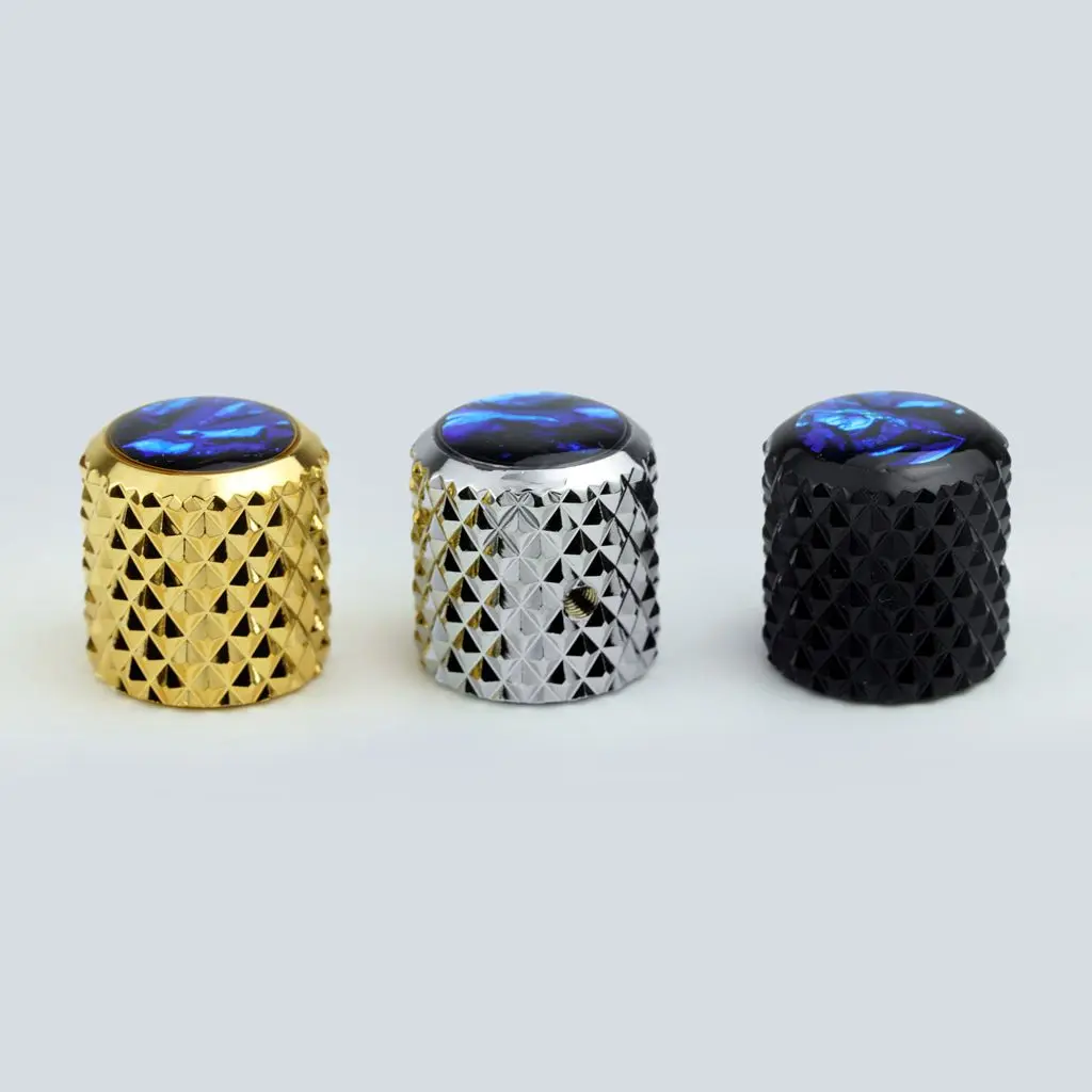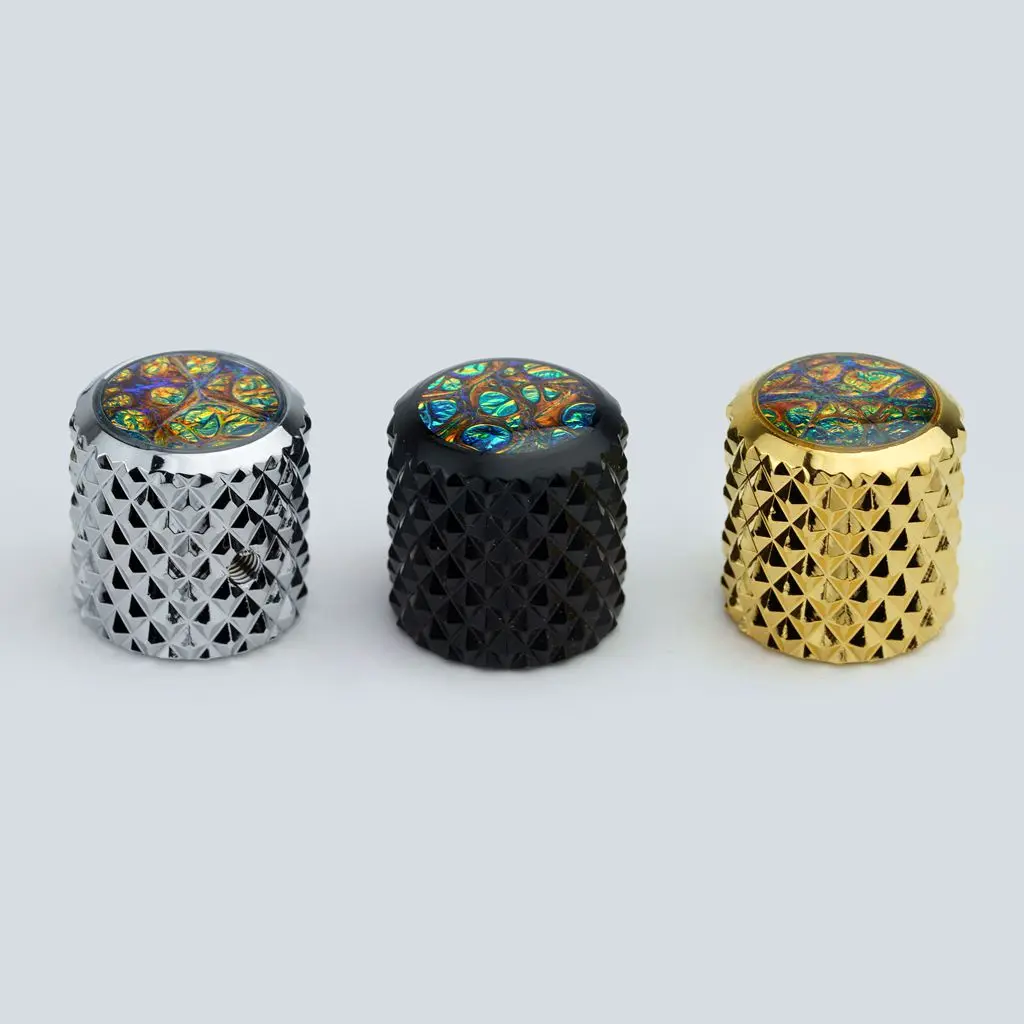 Experience the perfect blend of elegance and functionality with this set of three aluminum alloy control knobs designed for electric guitars and basses. Crafted from shiny, high-quality metal, these knobs feature a textured surface with small, raised pyramidal facets, providing both improved grip and a fascinating decorative appearance. The front face is adorned with a circular, slightly convex inlay made from vibrant, iridescent abalone shell, displaying shifting shades of blue, green, purple, and black that reflect light beautifully from different angles. Their versatility ensures they complement a wide range of guitar and bass models, making your instrument visually stand out while offering precise control. Elevate your musical setup with these luxurious, eye-catching accessories.