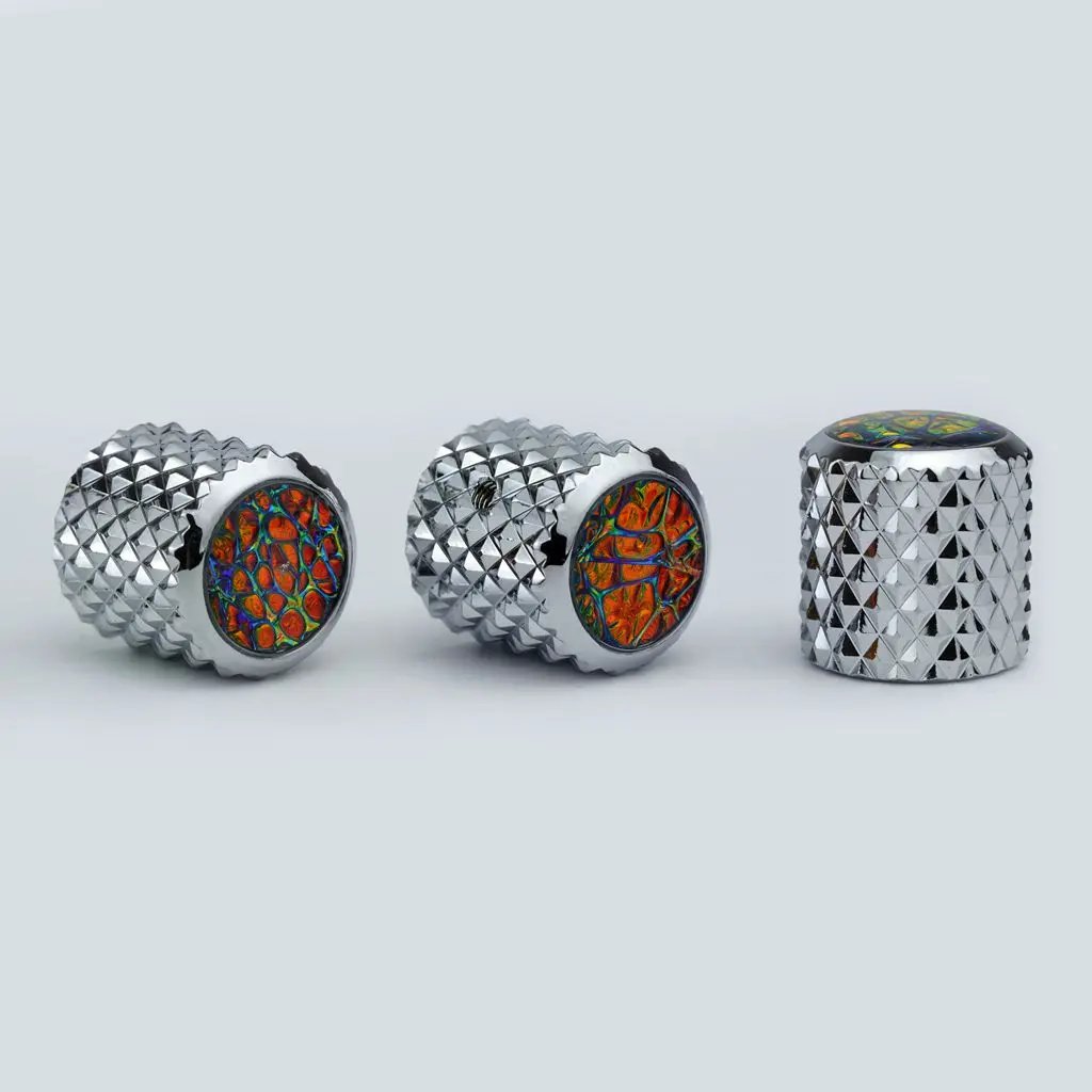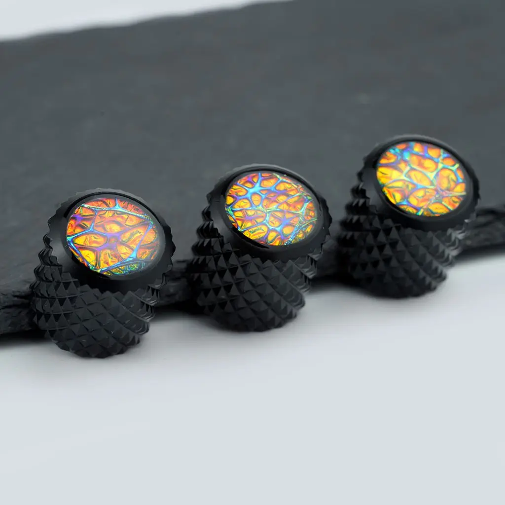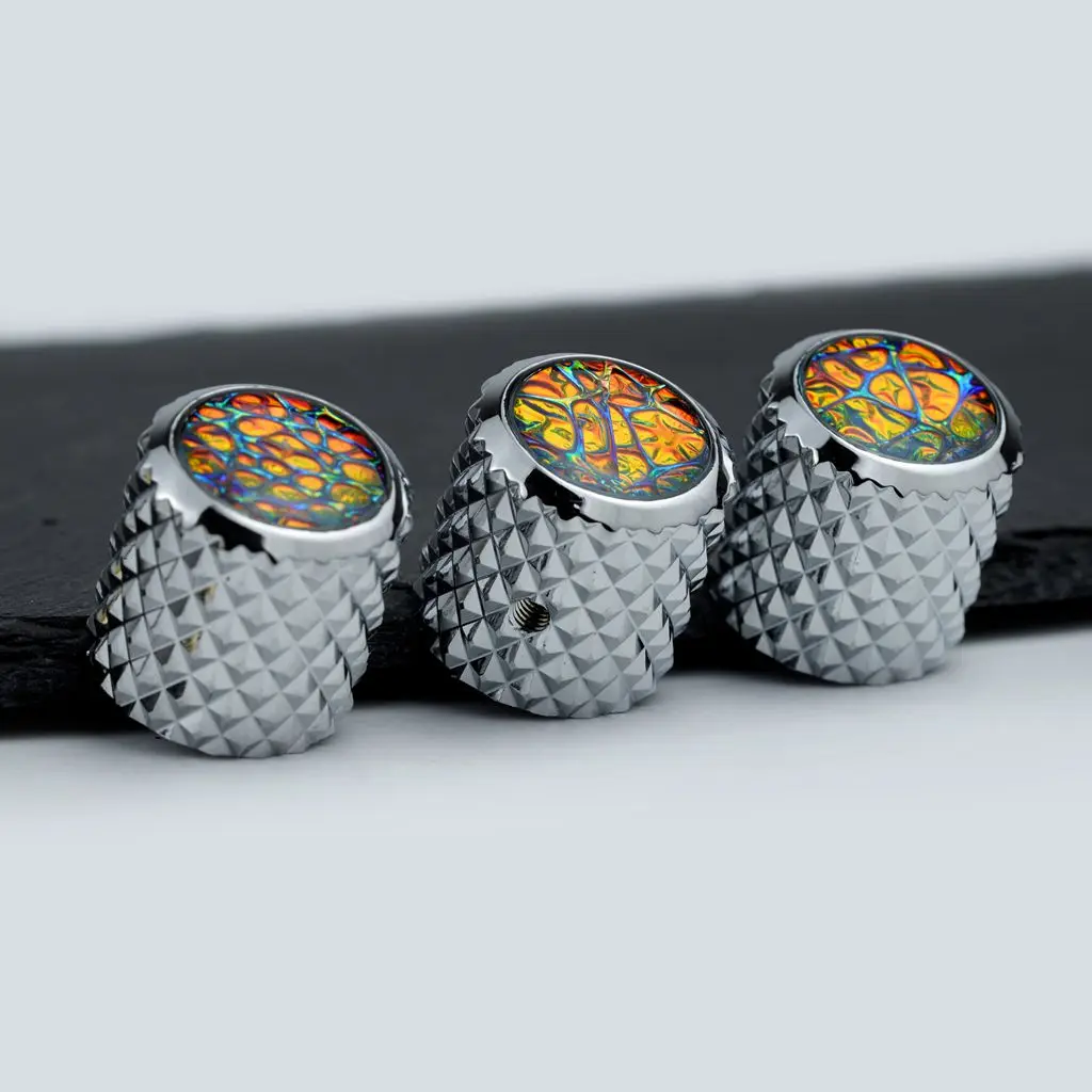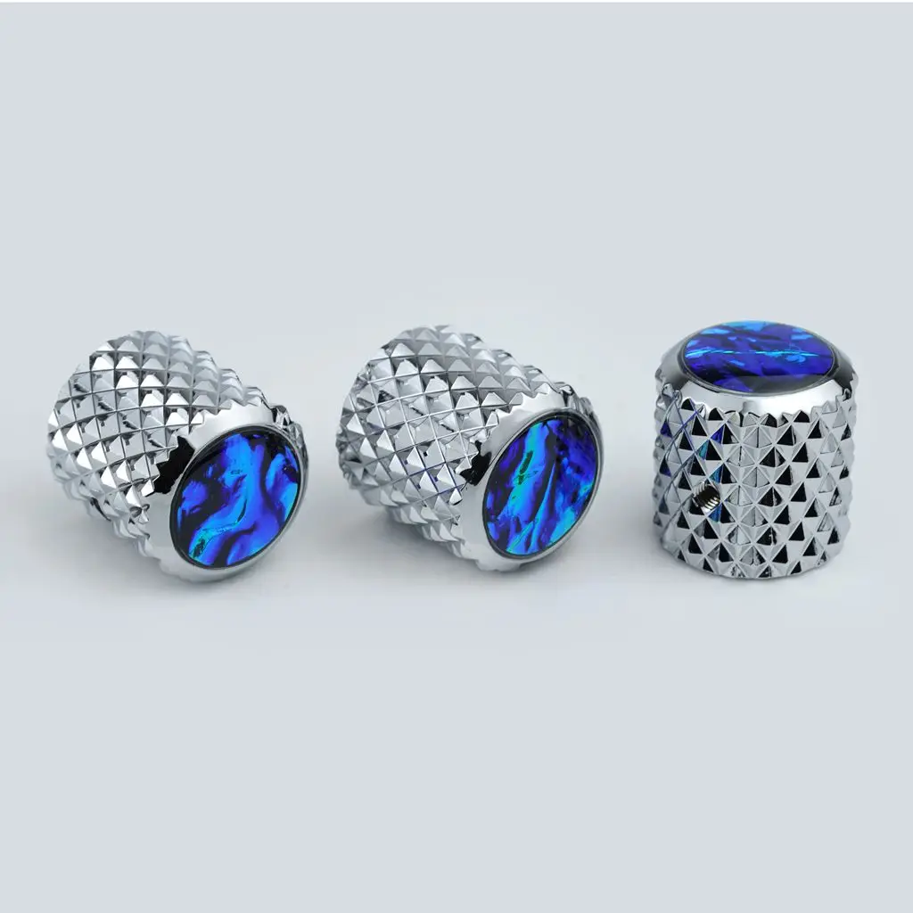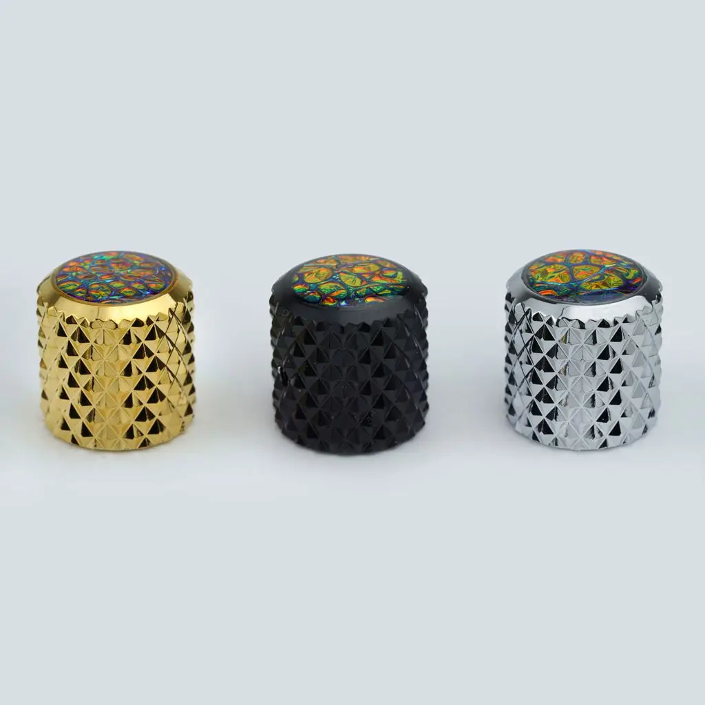 Experience the perfect blend of elegance and functionality with this set of three aluminum alloy control knobs designed for electric guitars and basses. Crafted from shiny, high-quality metal, these knobs feature a textured surface with small, raised pyramidal facets, providing both improved grip and a fascinating decorative appearance. The front face is adorned with a circular, slightly convex inlay made from vibrant, iridescent abalone shell, displaying shifting shades of blue, green, purple, and black that reflect light beautifully from different angles. Their versatility ensures they complement a wide range of guitar and bass models, making your instrument visually stand out while offering precise control. Elevate your musical setup with these luxurious, eye-catching accessories.