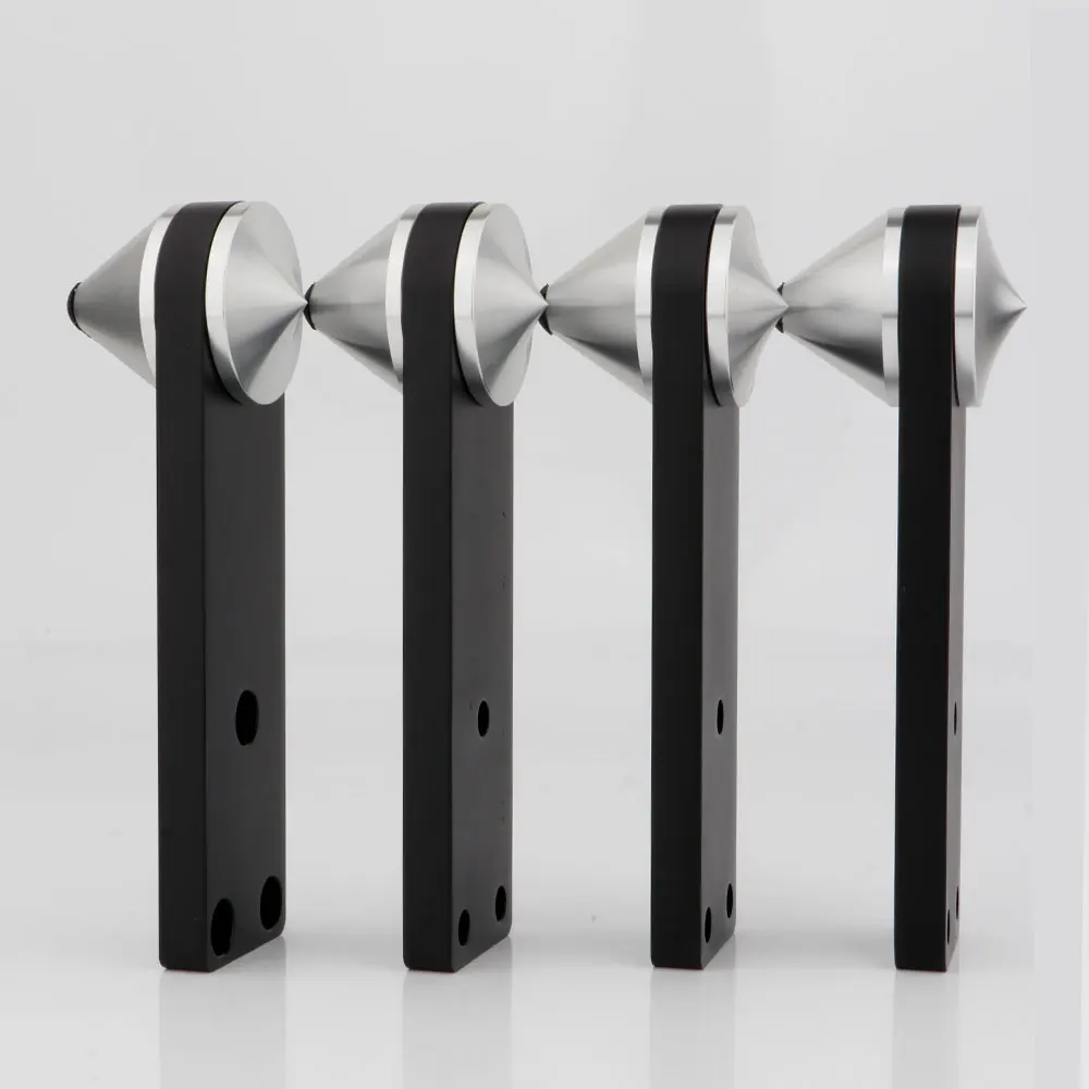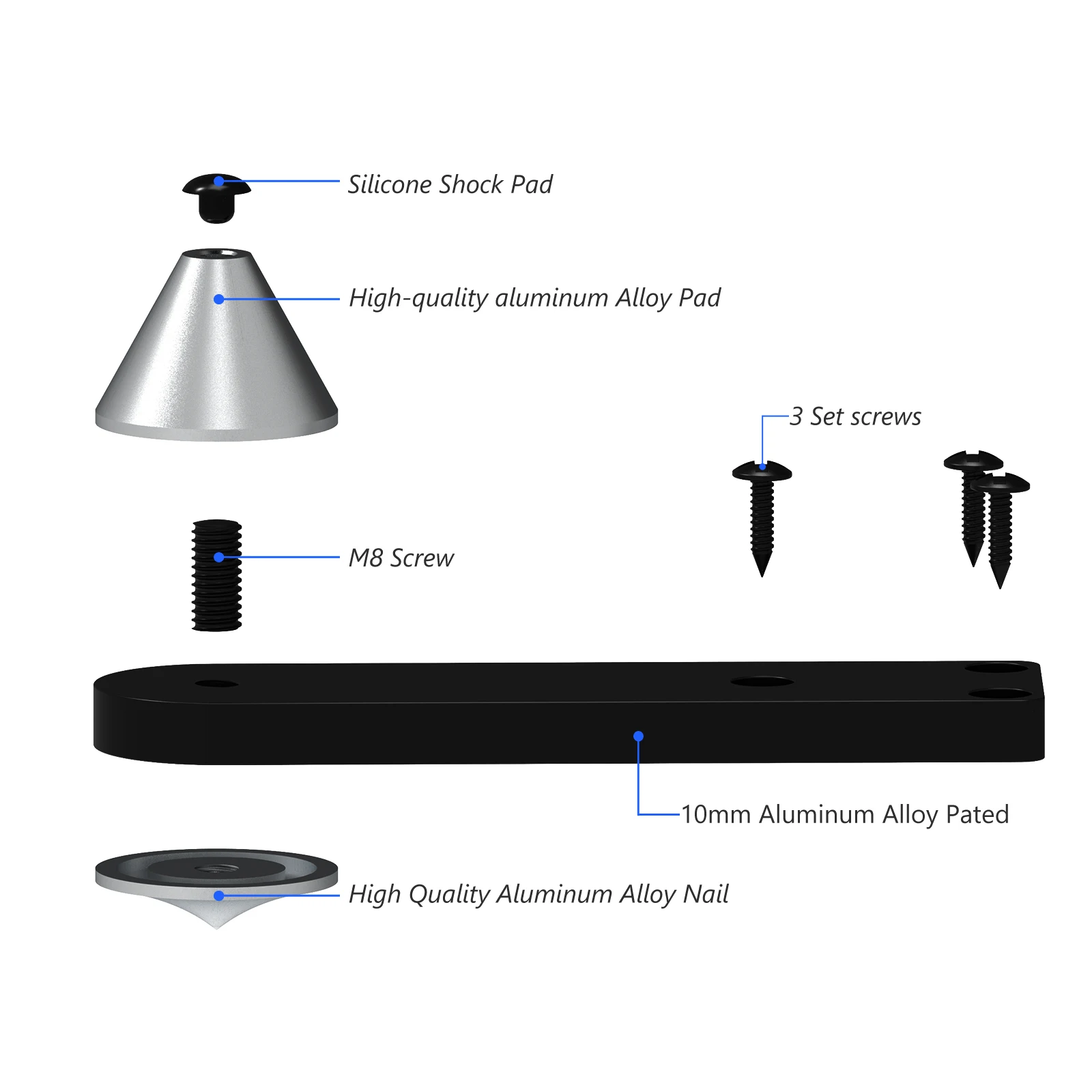 - Constructed from durable aluminum alloy with a sleek black and silver finish, these spikes are designed to withstand long-term use and resist fading or oxidation in high-end audio setups.