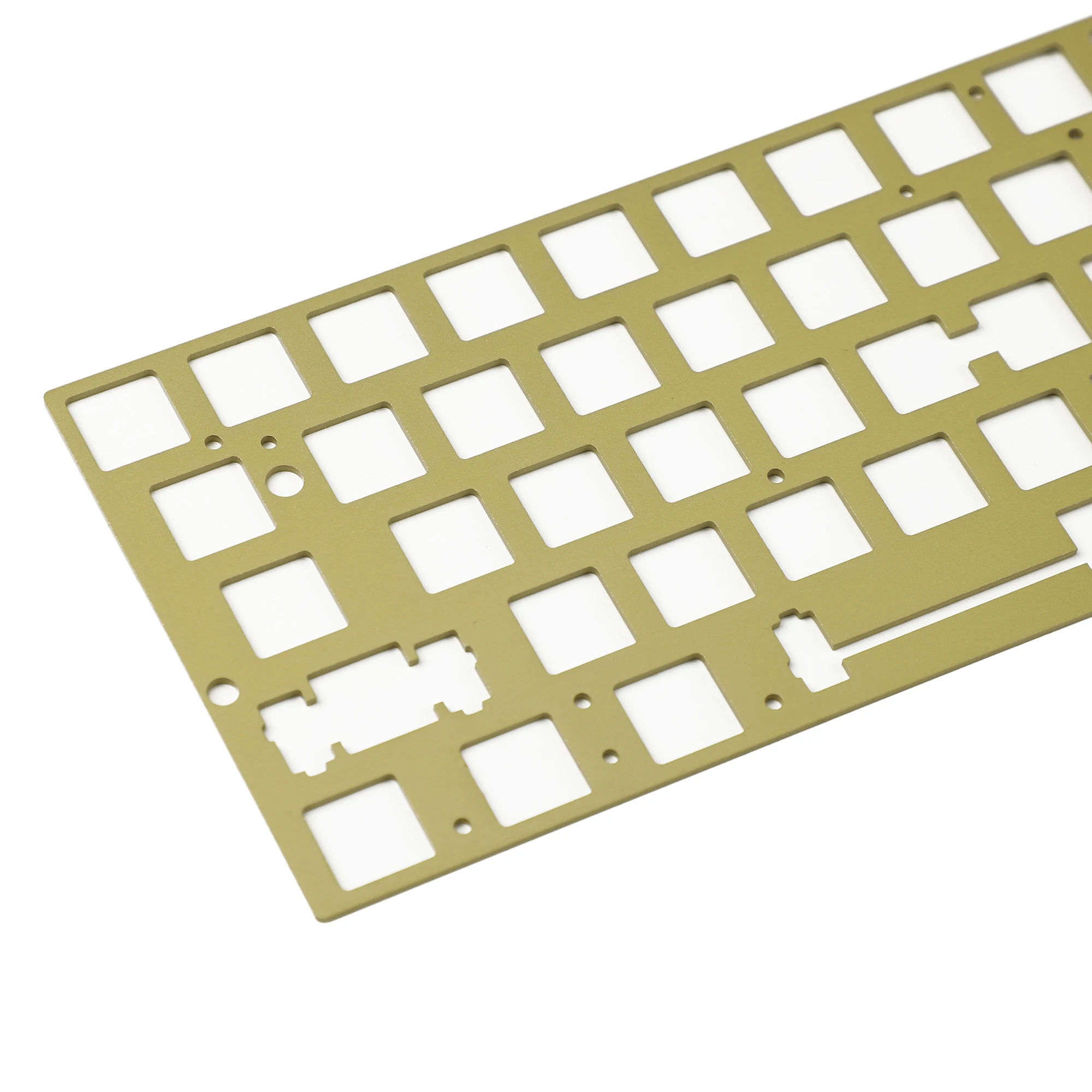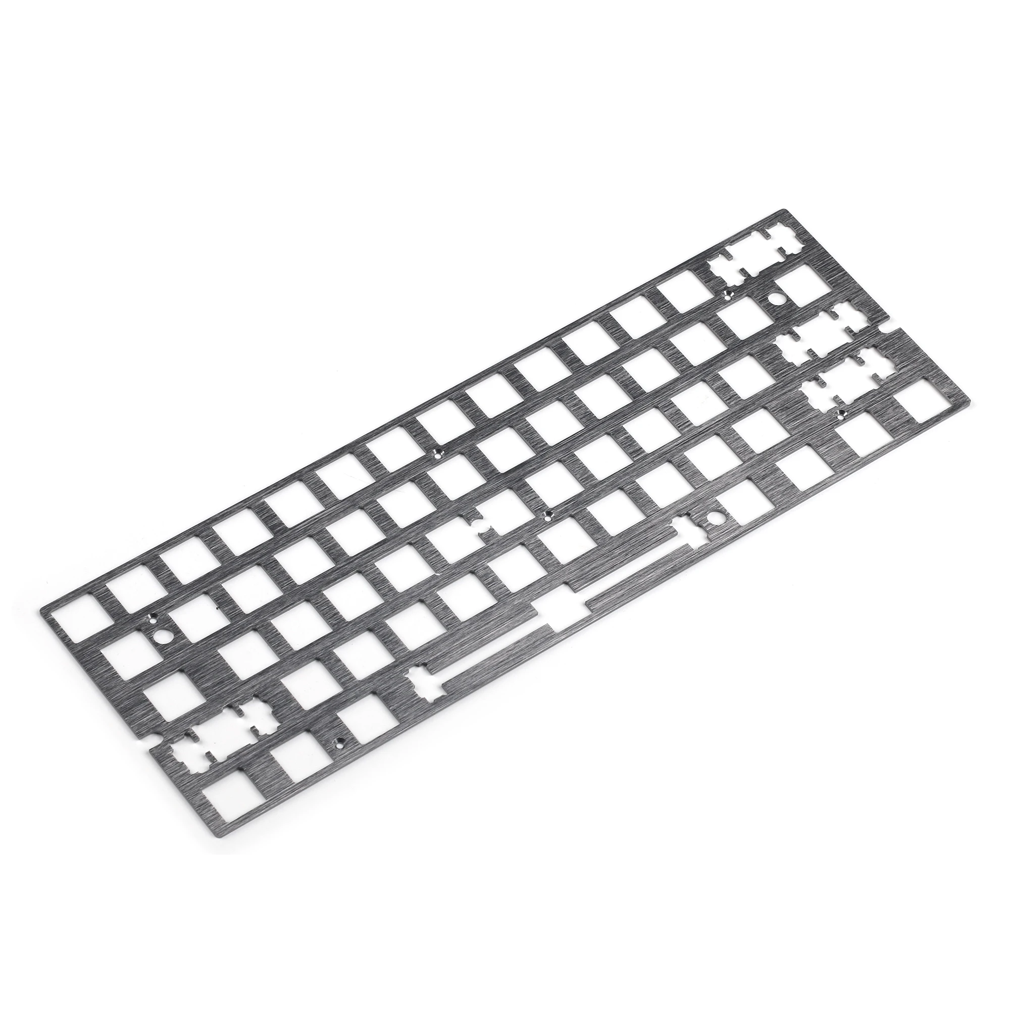 Experience the perfect blend of durability and style with this high-quality plate designed for custom mechanical keyboards. Crafted from aluminum, steel, brass, or fiber, each option offers unique aesthetic and acoustic qualities to elevate your typing experience. The brushed surface and anodized finish provide a sleek, matte texture that resists scratches and maintains their elegant look over time. Designed specifically for GH60 cases and compatible with GH60 PCBs, this plate offers a clean and symmetrical layout with precisely cut switch mounts and additional mounting holes for stability. Whether you're building a gaming or typing-focused keyboard, this plate ensures secure fitment, durability, and a superb finish that complements your personal setup.