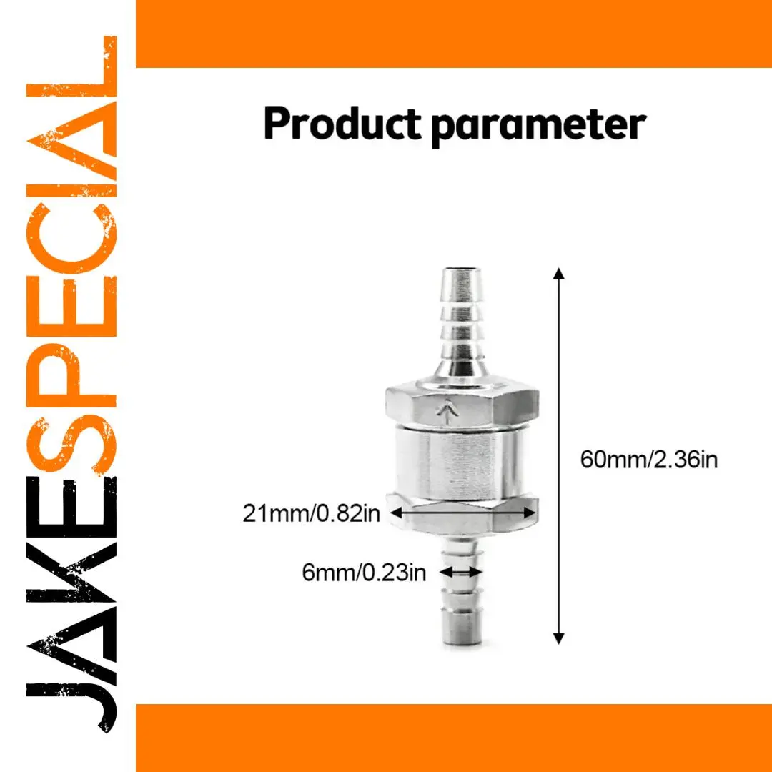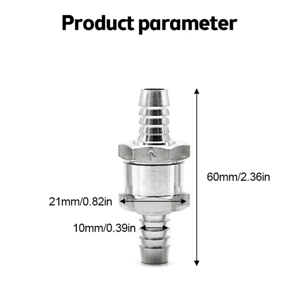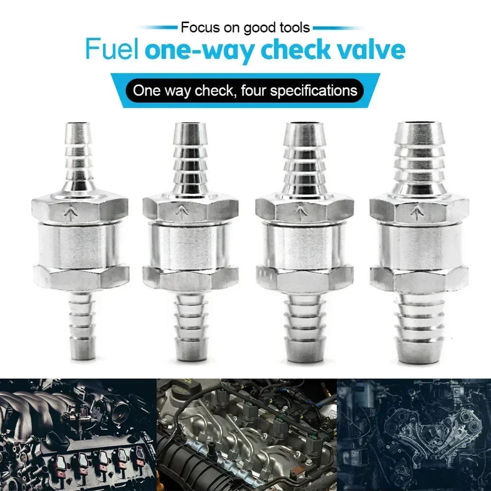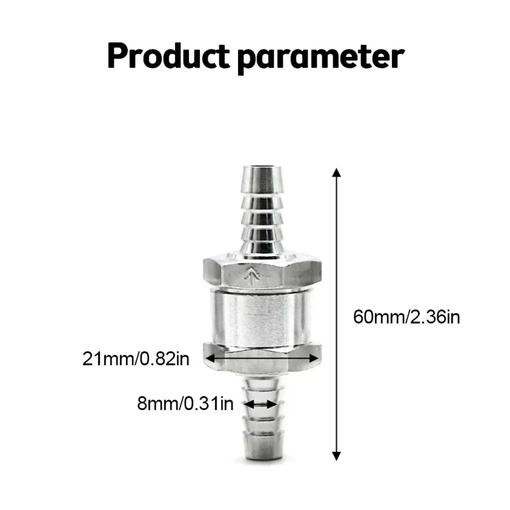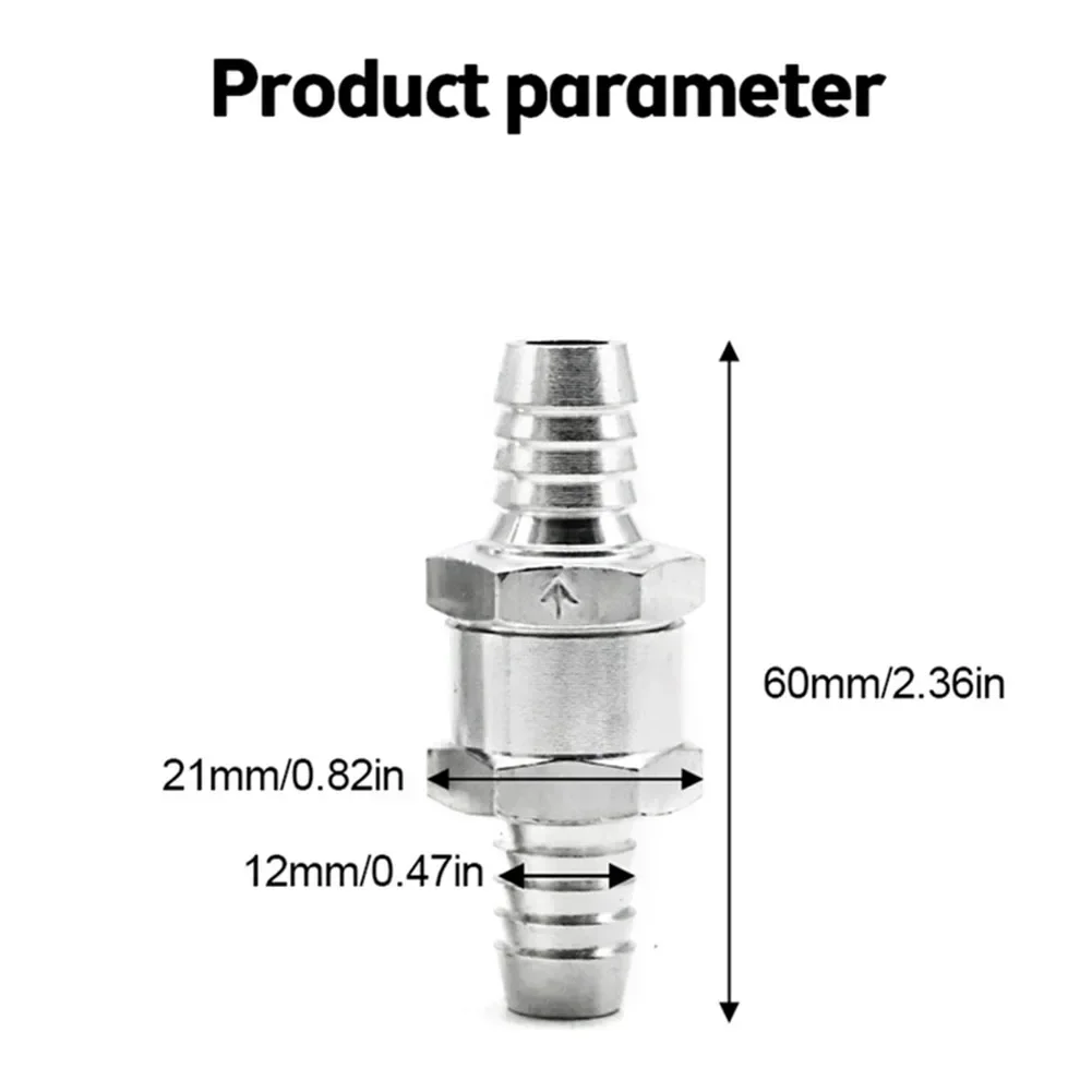 This high-quality aluminum alloy fuel check valve features a sleek, durable design with a polished, anti-corrosion finish, ensuring reliable performance in water, petrol, diesel, and oil lines (not for methanol). Available in 6mm, 8mm, 10mm, and 12mm sizes, it features a clear arrow marking to guide proper installation and prevent backflow in carburetors and low-pressure fuel systems across a range of vehicles including cars, ships, helicopters, and motorcycles. Its minimalist, industrial-inspired aesthetic with smooth, tapered nozzles and ridged connectors makes it both functional and visually appealing, providing a trusted solution for maintaining fluid flow integrity.