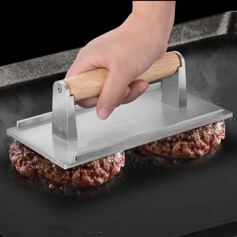 Imagine achieving those professional grill marks on your favorite meats effortlessly. This this rectangular meat press is crafted from high-quality aluminum alloy, measuring 21.5 x 11 cm, designed for both performance and durability. Its sleek, non-stick, heat-resistant surface features a subtle ridged pattern that creates appealing grill marks and helps cook meat evenly. The ergonomic, light-colored wooden handle is smooth and comfortably fits your grip, offering safety and ease during use. Welded supports curve gently upward, ensuring a sturdy and long-lasting structure. Whether you're making burgers, steaks, bacon, or quesadillas, this press speeds up cooking and prevents meat from curling, making your grilling experience cleaner and more efficient. This medium-sized press fits seamlessly into your kitchen or barbecue set, elevating your cooking game with style and reliability.