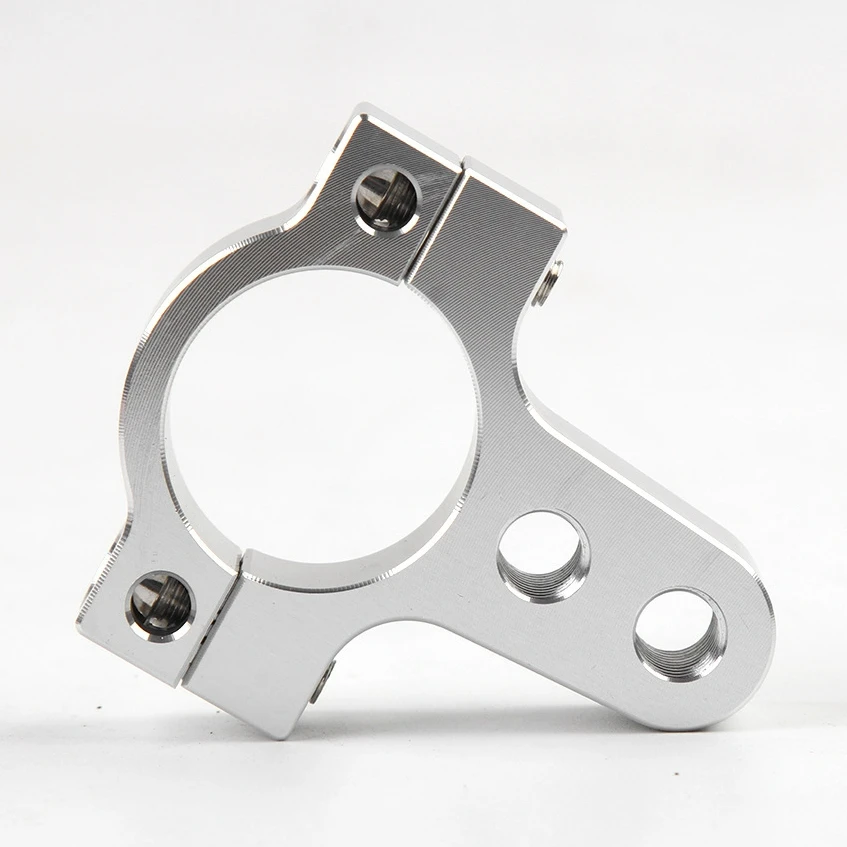 Enhance your motorcycle's stability with this high-quality aluminum steering damper fork frame mounting clamp. Made from 6061-T6 CNC-machined aluminum and finished with hard anodization, it combines strength, durability, and corrosion resistance. Its sleek silver finish provides a professional look that complements your bike’s aesthetic. Designed for precise fitment, the compact, rectangular profile with rounded edges ensures a clean and modern appearance. This bracket seamlessly integrates with your existing setup, featuring two threaded holes and unthreaded mounting points for secure attachment of the damping system. Enjoy smoother handling, reduced vibrations, and increased control, especially during high-speed riding or sudden maneuvers. Lightweight yet sturdy, it’s the perfect upgrade for your motorcycle modification needs.