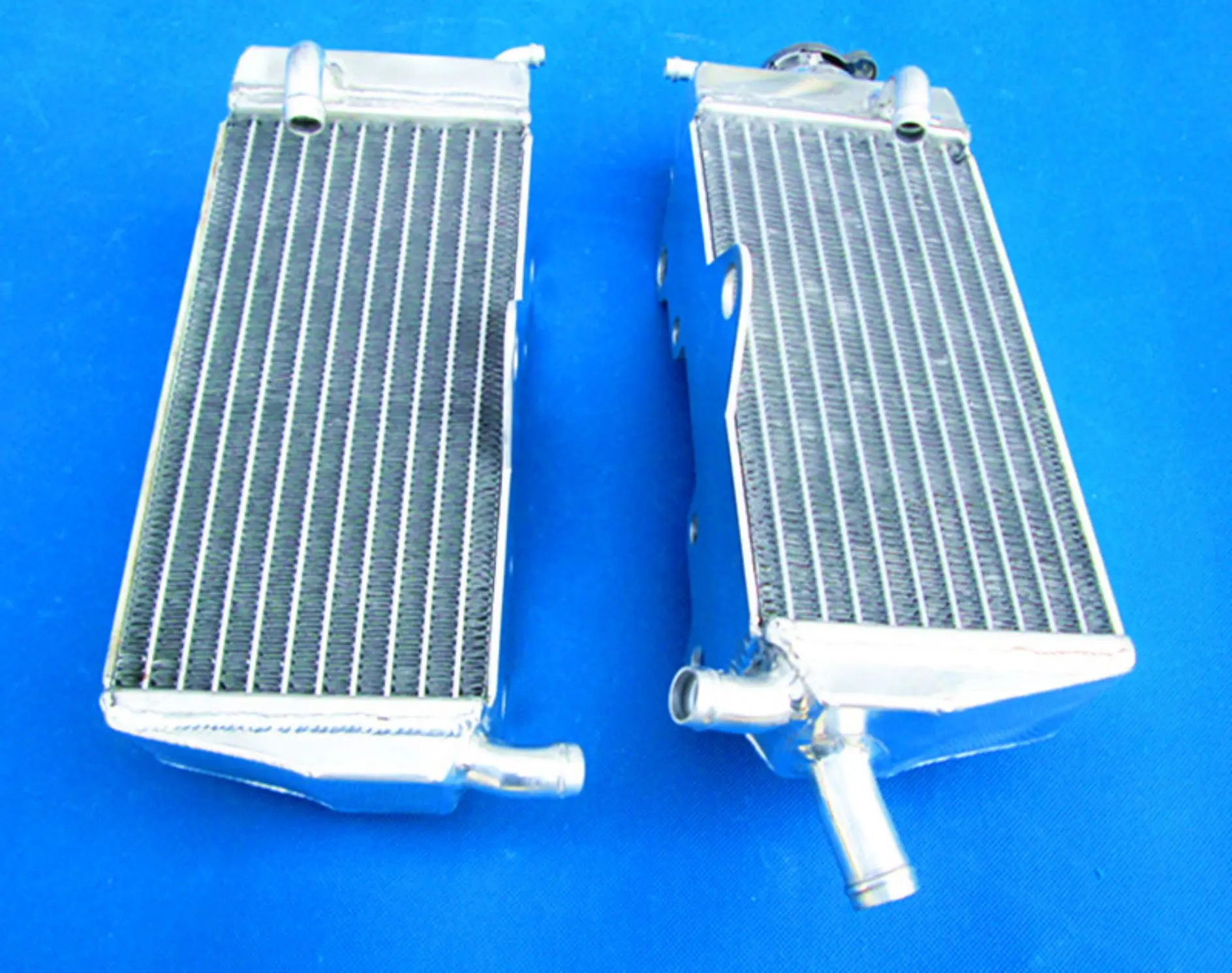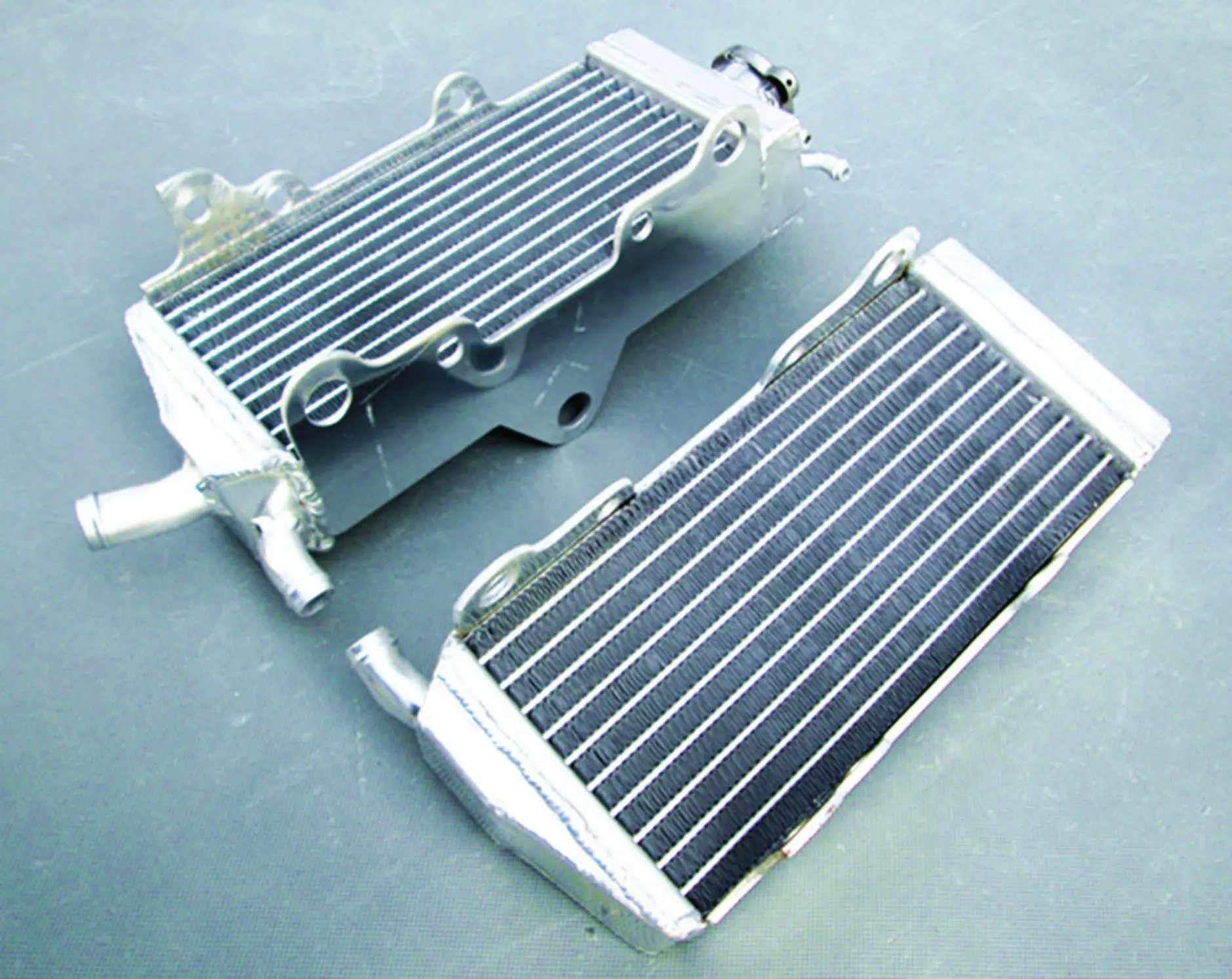Experience enhanced cooling performance with this expertly crafted pair of aluminum radiators designed specifically for Honda CR125R models from 1990 to 1997. Constructed from premium T-6061 aluminum, these radiators feature a dense array of black cooling fins, optimized to dissipate heat efficiently for demanding riding conditions. The core is seamlessly welded in a vacuum brazing furnace, ensuring a durable, epoxy-free bond. The aluminum tanks at each end are TIG welded for maximum strength and a polished, reflective finish that complements the sleek, industrial aesthetic. Lightweight yet heavy-duty, these radiators deliver about 40% increased cooling capacity, aligning with or surpassing OEM standards. They guarantee a perfect fit with minimal modifications, elevating your motorcycle's performance and reliability.