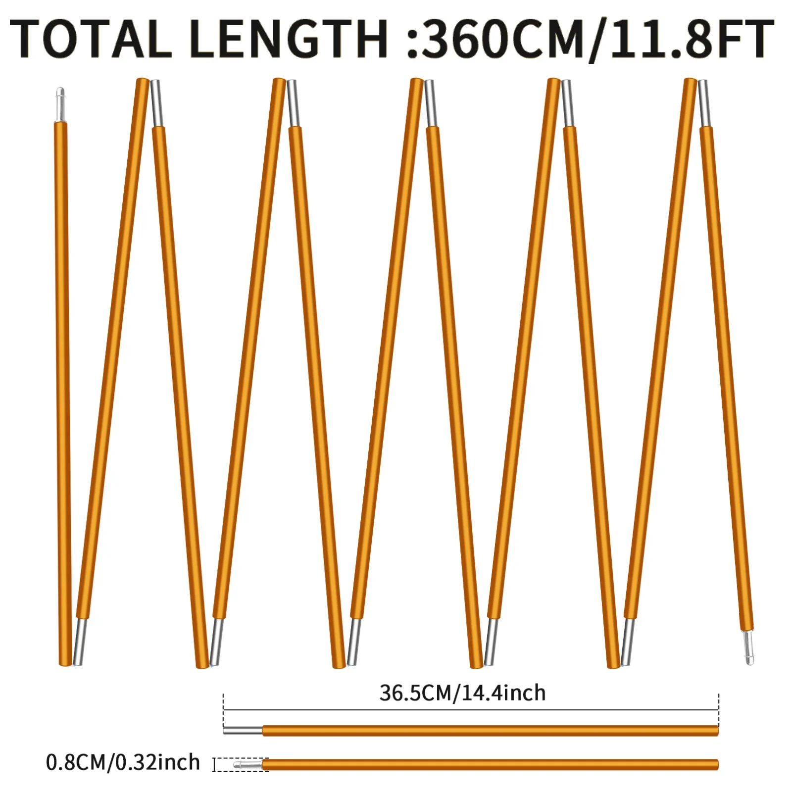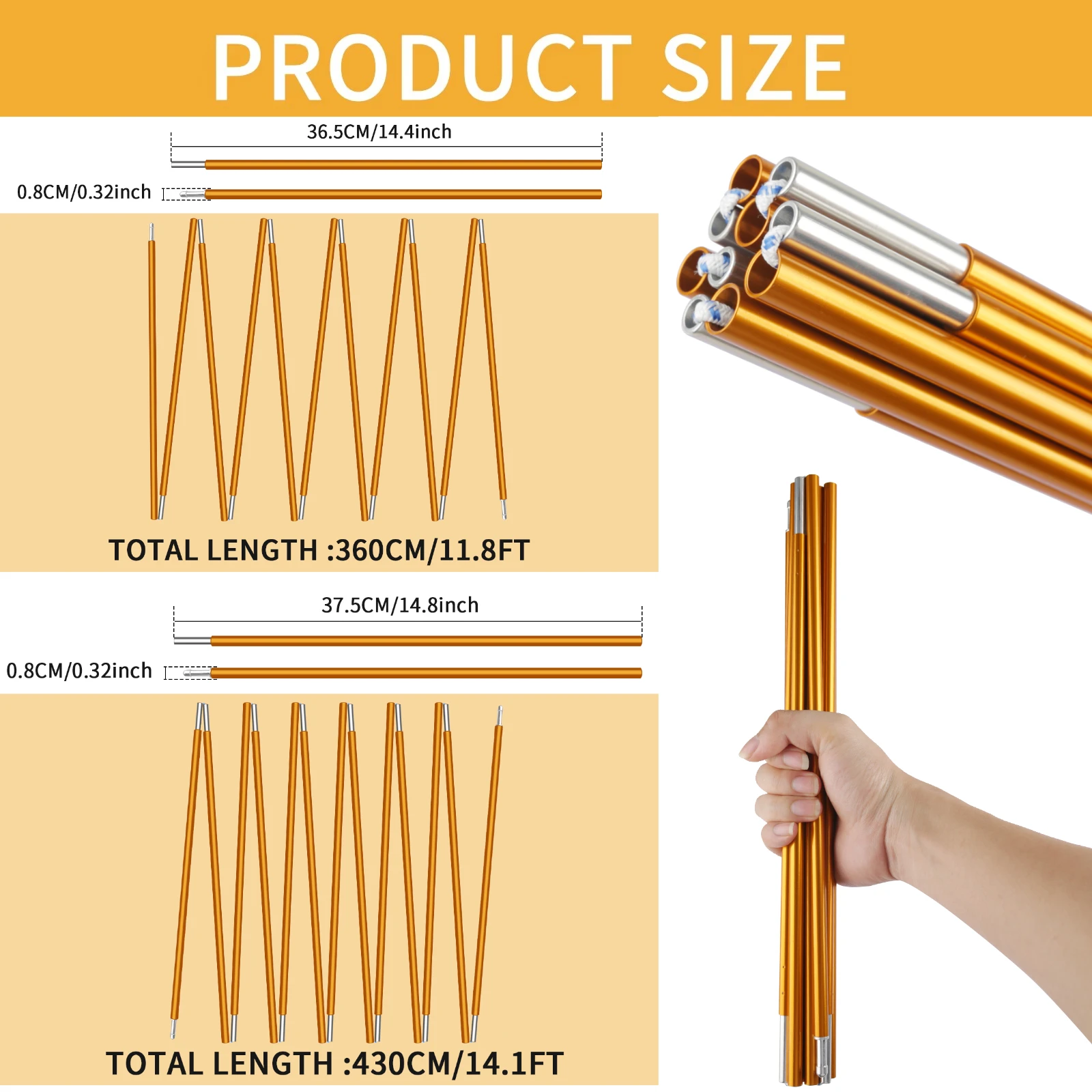Enhance your outdoor setup with lightweight, high-strength aluminum alloy support poles available in 3.6 meters (0.8 cm outer diameter, approximately 0.25 kg) and 4.3 meters (0.8 cm outer diameter, approximately 0.31 kg). Crafted from durable 7001 series aircraft-grade aluminum, these poles feature a segmented design with male tips for easy assembly and a resilient elastic cord inside each section. Their sleek black or gold finish offers a modern aesthetic, while their customizable length allows them to be cut to suit your specific needs. Ideal for tent replacement, awning supports, and various outdoor applications, they deliver quick setup, excellent bend resistance, and long-lasting performance.