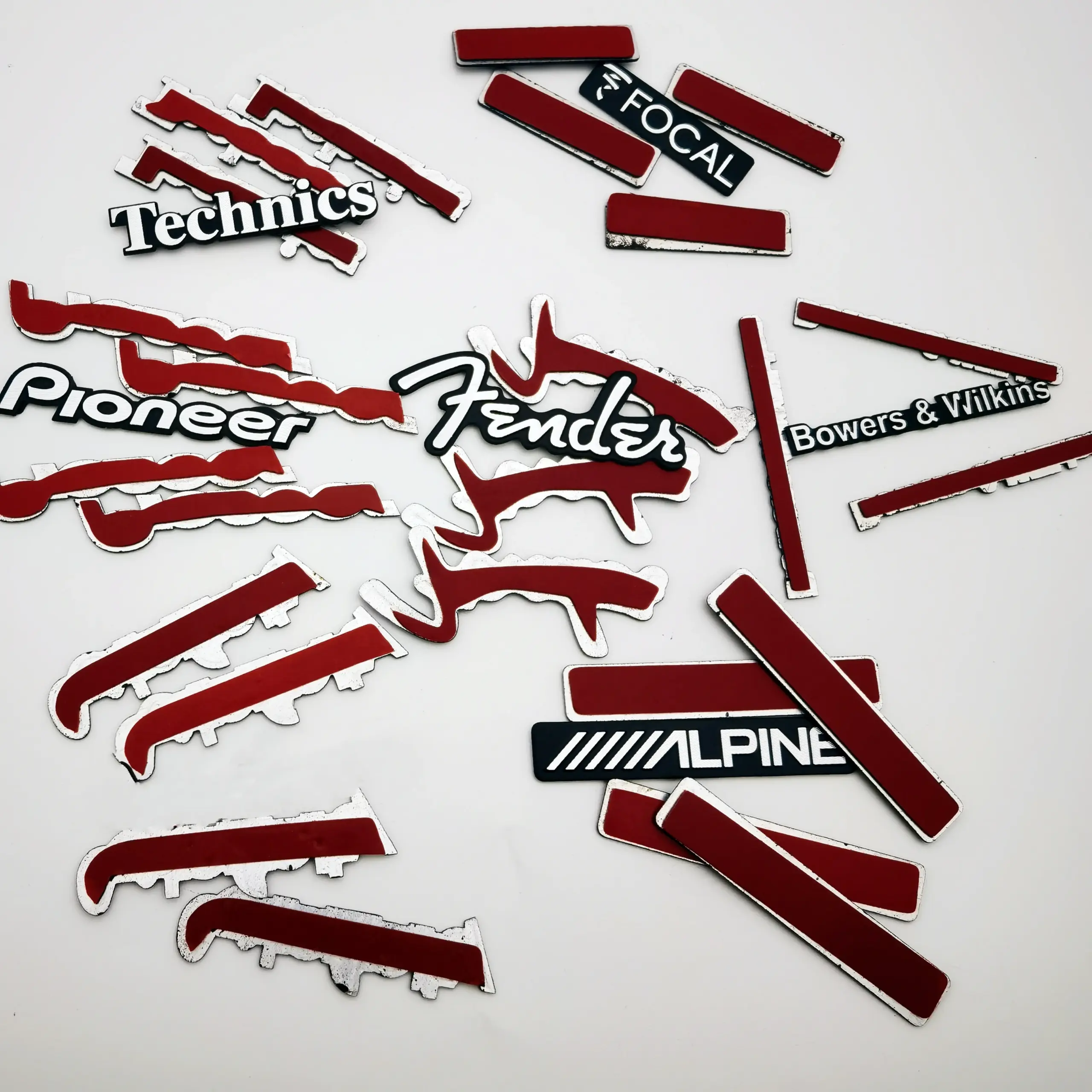 Enhance your vehicle’s audio system with this set of four high-quality aluminum alloy speaker emblems, measuring 50mm x 20mm, 50mm x 5mm, 34mm x 9mm, 41mm x 18mm, 53mm x 10mm, and 55mm x 10mm, complemented by a 20mm x 15mm sticker. Featuring iconic logos such as Technics, FENDER, ALPINE, Pioneer, Bowers & Wilkins, JBL, and FOCALE, these durable emblems add a sleek, modern touch to any car speaker. Easy to install with double-sided tape, their refined metallic finish and minimalist design provide a professional and stylish upgrade for enthusiasts seeking a personalized, high-performance look.