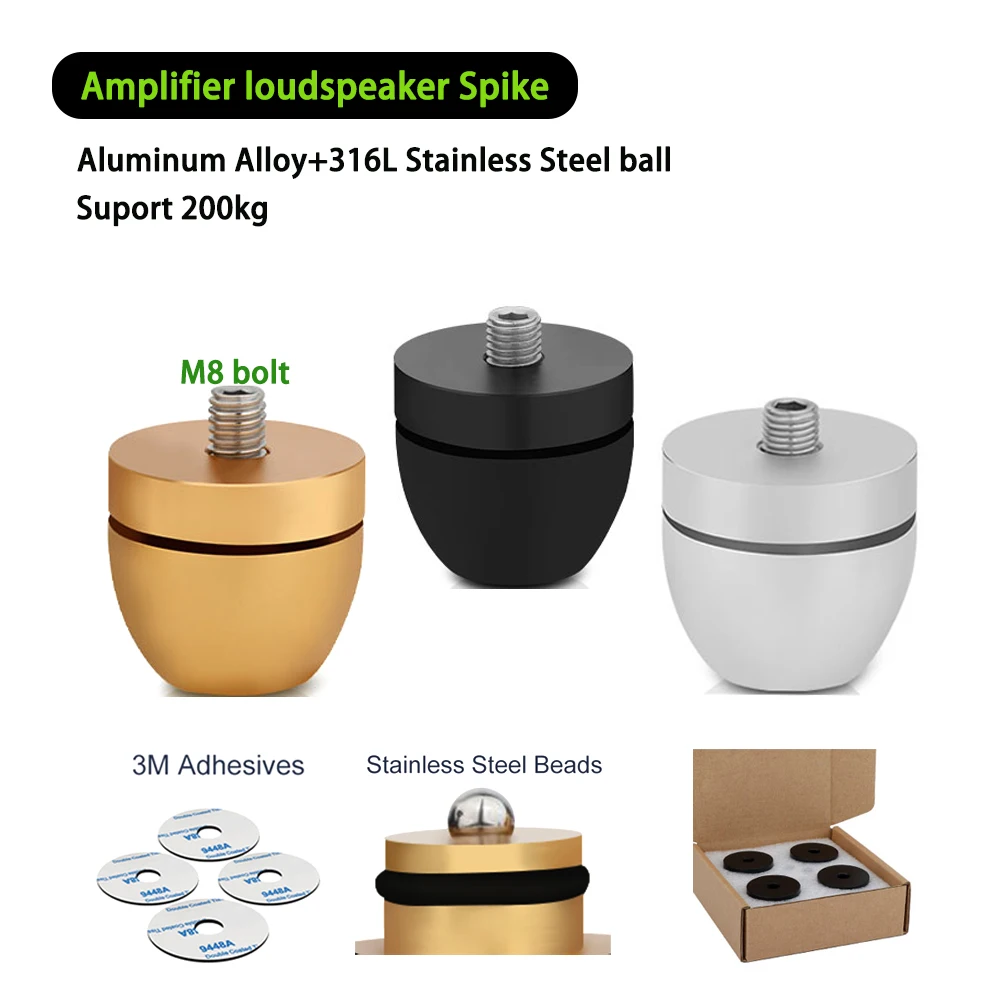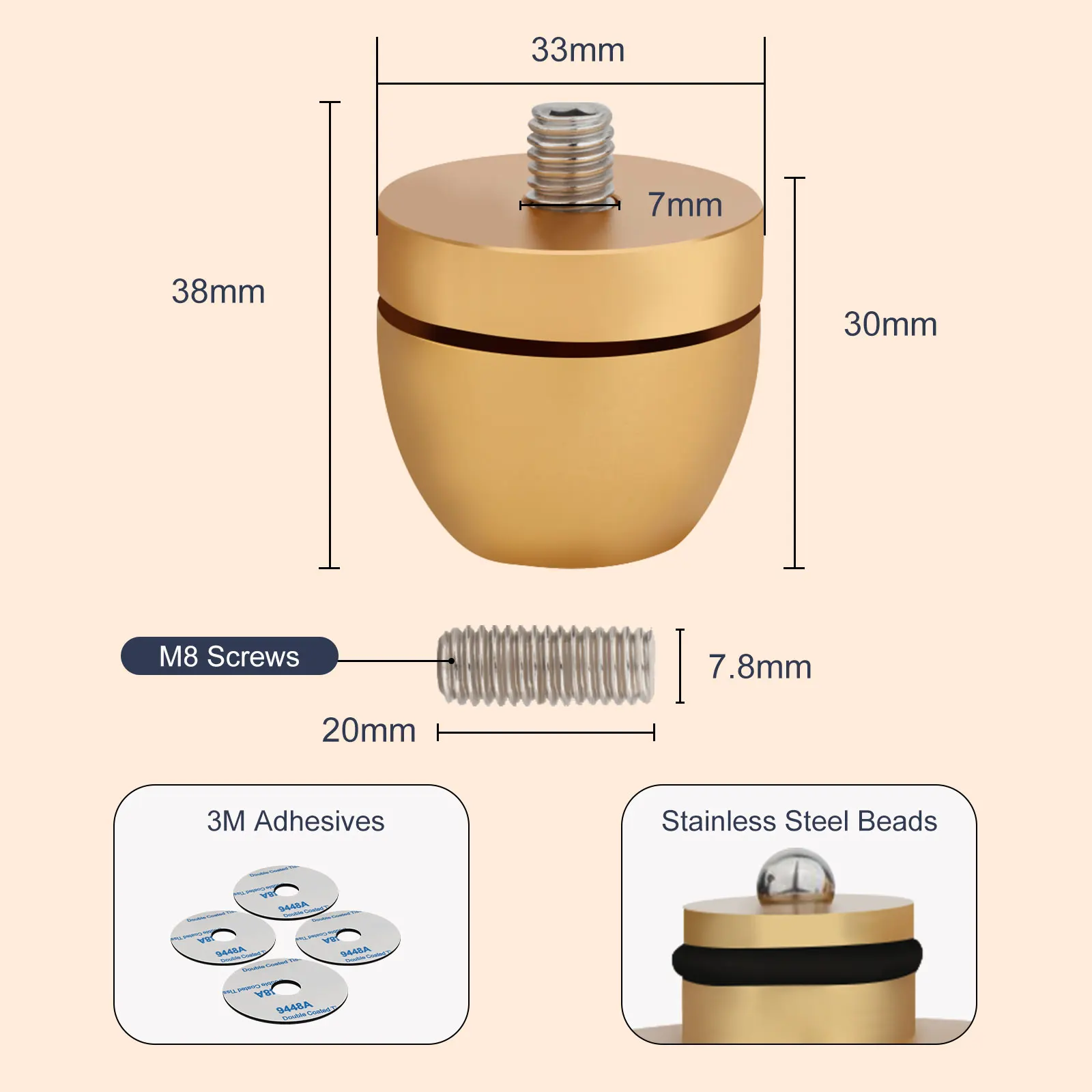 Imagine elevating your audio equipment with these precisely engineered aluminum alloy feet, designed to dampen vibrations and enhance sound clarity. Crafted with a smooth CNC anodized finish, these feet feature a modern industrial style available in black, gold, or silver hues that seamlessly blend with high-end audio gear. Each foot measures 30mm in diameter and stands 33mm tall, offering stable, elevated support. The embedded 316L stainless steel ball in the center provides superior vibration absorption, reducing mechanical noise and resonance. Weighing approximately 62 grams each, these sturdy supports are built to hold up to 200kg collectively, ensuring your components stay steady during operation. They include M8 screws and durable 3M double-sided PE stickers for versatile mounting options, making them perfect for speakers, amplifiers, or chassis.