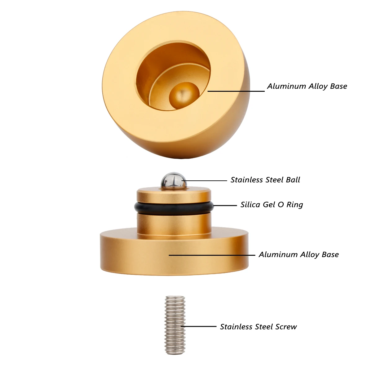 - Each support features an embedded 316L stainless steel ball that enhances vibration absorption and shock damping for audio clarity.