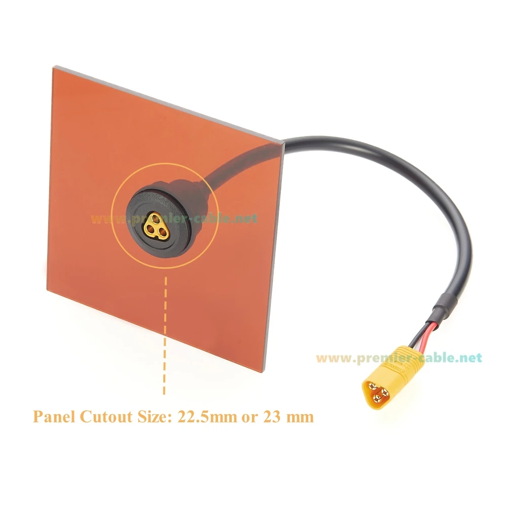 Experience reliable power transfer with this high-quality Amass MT60 connector cable, designed for demanding RC applications like drones, brushless motors, and industrial equipment. The sleek black cable features a durable, smooth outer sheath, exuding a modern and professional look. One end sports a vibrant yellow MT60 3-pin connector, highlighting its secure, rounded contact holes, while the other end showcases a polished gold-plated connector, combining aesthetics with corrosion resistance and high conductivity. The high-performance design ensures stable and efficient connections, even under high current loads of 30A to 60A. Its streamlined, panel-mountable female connector with a threaded flange simplifies installation, making it perfect for precision setups that demand both style and durability. Whether for hobby or industrial use, this cable guarantees safe and stable power delivery.