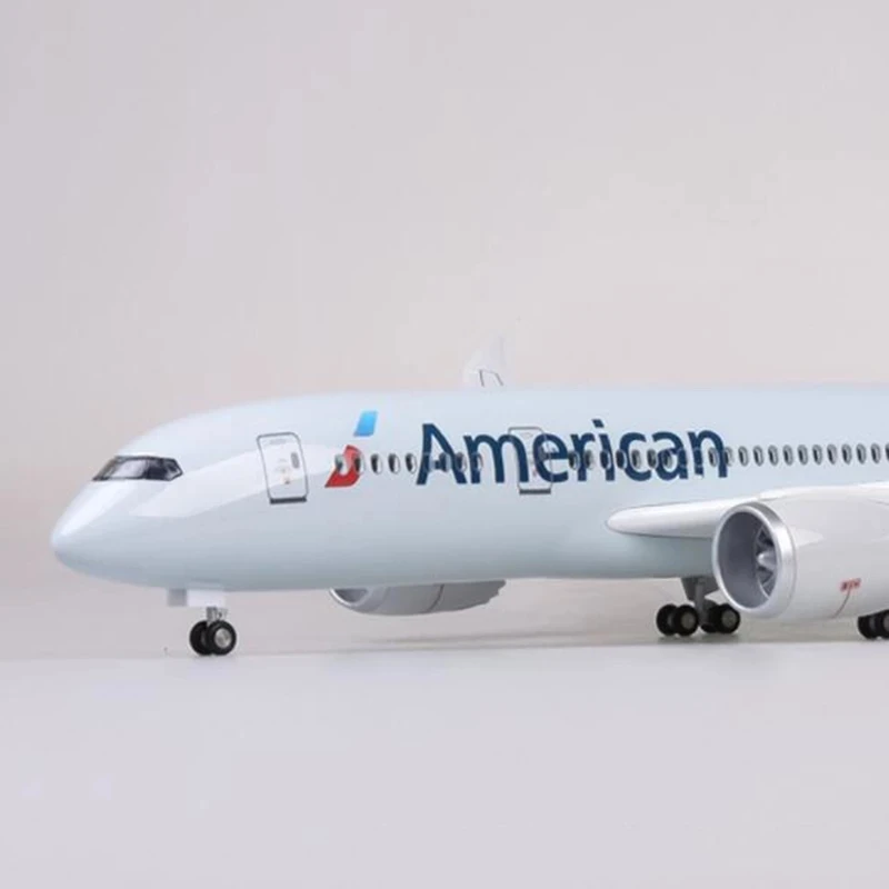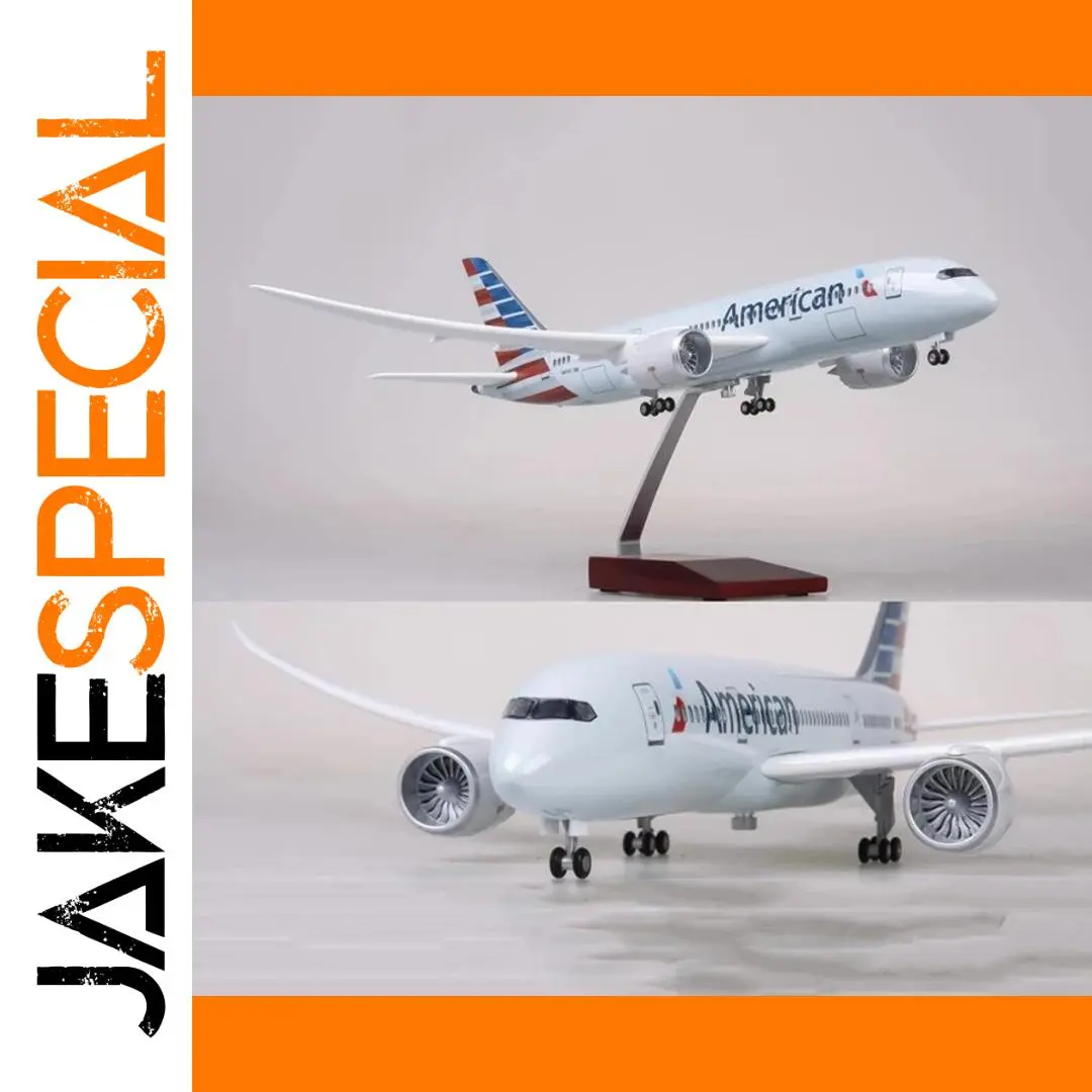 Enhance your collection with this detailed 1:130 scale model of a Boeing 787 Dreamliner in American Airlines livery. Measuring approximately 47 cm in length, the resin aircraft features a sleek white fuselage, the iconic red, white, and blue tail fin, and finely crafted details like cockpit windows, passenger windows, and turbine blades. It includes a wooden trapezoidal base with metal support brackets for stability and removable wings and wheels for assembly. The voice-controlled LED cabin lighting adds a modern touch, activating by voice or touch and powered via USB with a built-in 75mAh lithium battery. Perfect for display, gifting, or interior decor, it embodies realistic craftsmanship and sophisticated design.