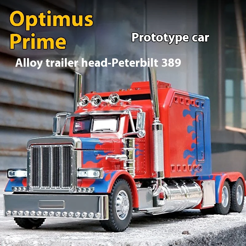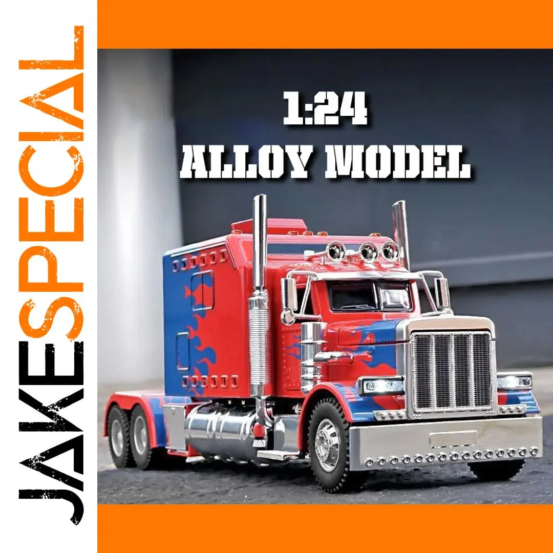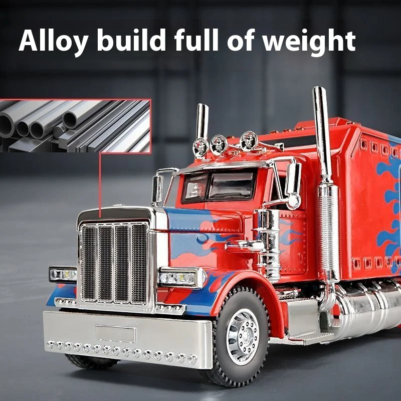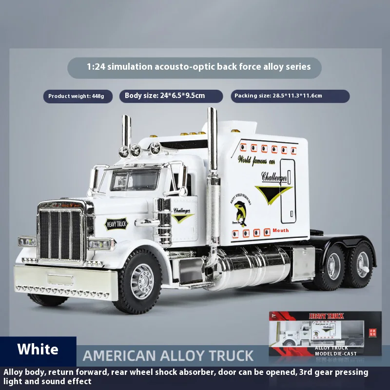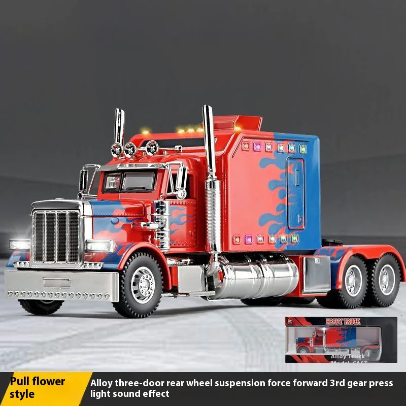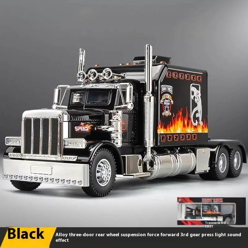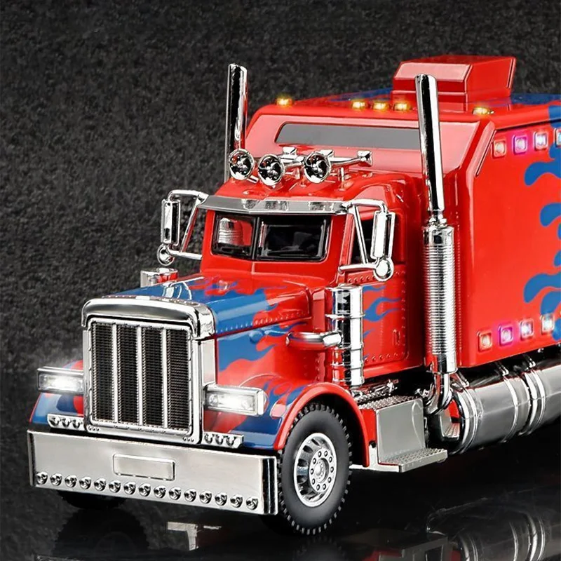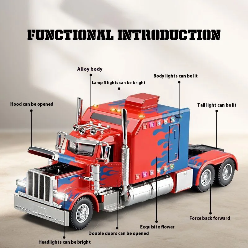 Imagine owning this dynamic diecast replica of an American-style semi-truck, crafted with meticulous detail. Its vibrant red, black, or white finish, accented with stylized blue flames or graphics on the sides and front, immediately draws the eye. The bold grille with vertical chrome bars, chrome exhaust pipes, and silver metallic bumper highlight its rugged, aggressive look. Made from durable metal, this model features collision and fall resistance, making it a trusted collectible for display. Integrated sound and light effects bring the model to life, enhancing its realism. Perfect for enthusiasts, it stands out on any shelf and promises to be a centerpiece of your collection—an impressive reminder of power and craftsmanship.