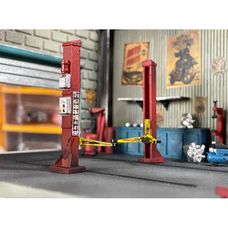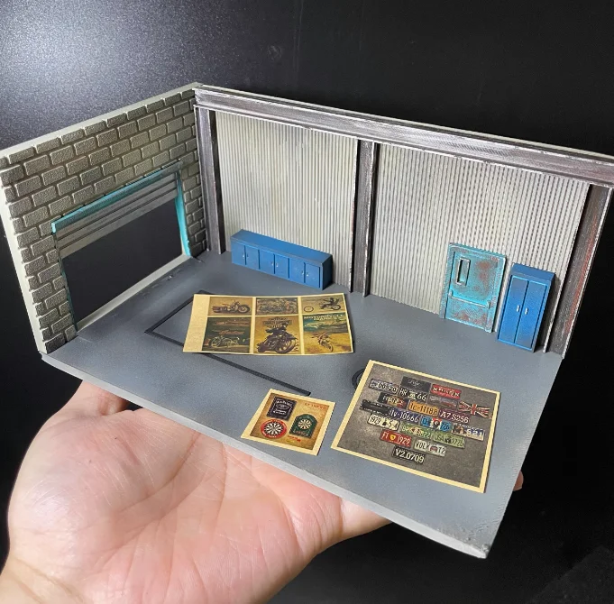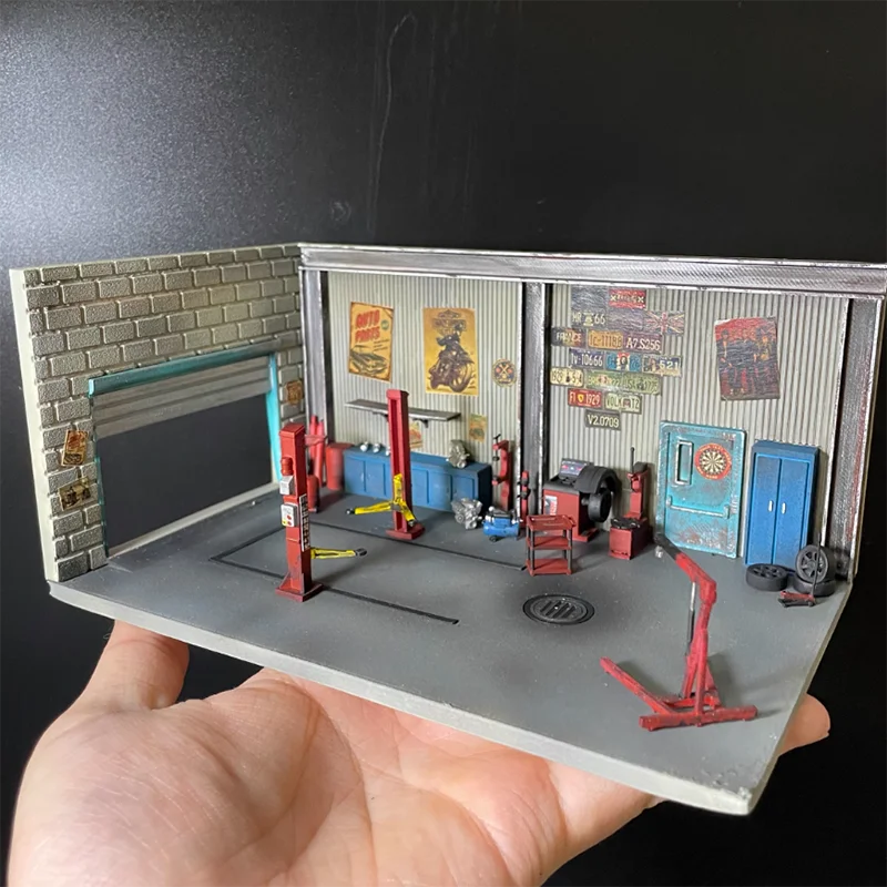 This 1/64 scale American Garage miniature scene, measuring 18 x 11 x 8.5 cm, is crafted from resin and designed for DIY assembly and bonding. It features a vibrant, detailed garage environment with tools, machinery, and vintage signage in bold colors like metallic silver, bright blue, and vivid red. Ideal for collectors, home decor, or display, this diecast, non-electrical model offers an authentic automotive workshop ambiance. Suitable for ages 14 and older, it boasts textured surfaces with glossy and matte finishes, providing a realistic, vintage industrial aesthetic that will bring your collection or space to life.