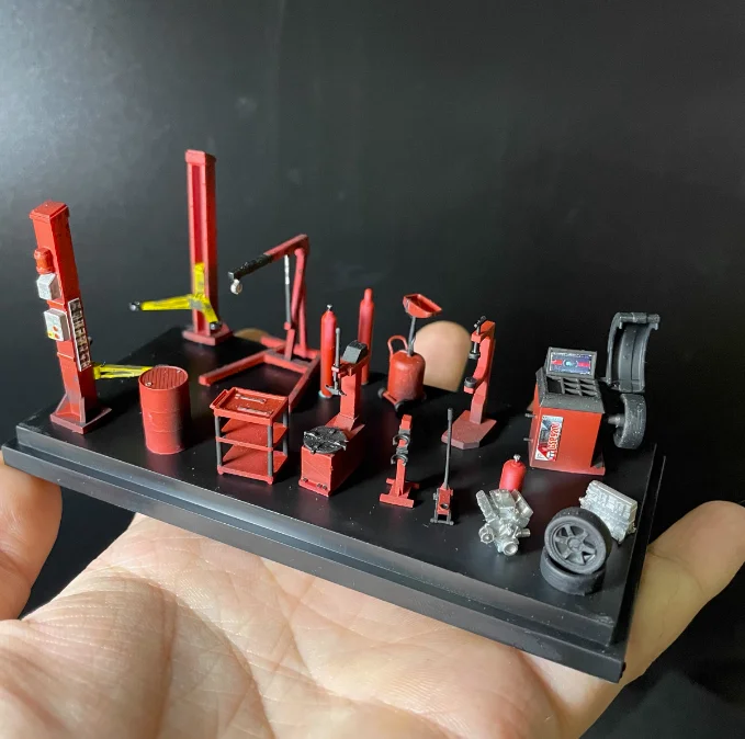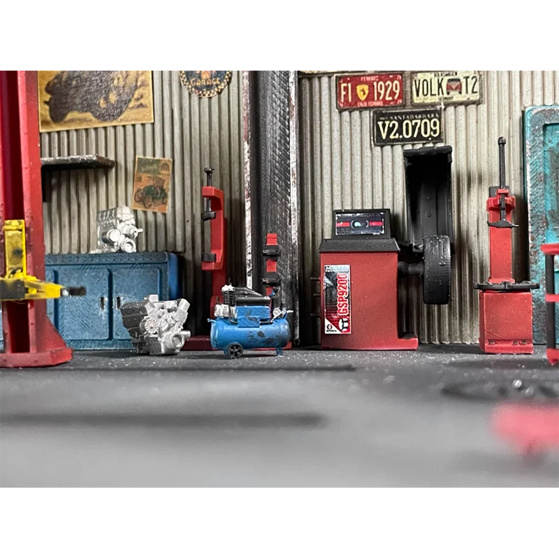 Imagine bringing a bustling automotive repair workshop to life right on your display shelf with this highly detailed miniature scene. Crafted from resin, this model measures approximately 18 centimeters in length, 11 centimeters in width, and 8.5 centimeters in height. Its exterior features textured brickwork and corrugated metal sheets, creating an industrial aesthetic. Inside, the vivid red, blue, and yellow accents adorn vintage workbenches, toolboxes, and automotive equipment, contrasted against the muted metallic tones of the structure. Small touches like a spare tire, miniature oil drum, and scattered tools add realism. Perfect for collectors or enthusiasts, this scene exudes authentic workshop ambiance, making your collection stand out with lively, nostalgic charm.