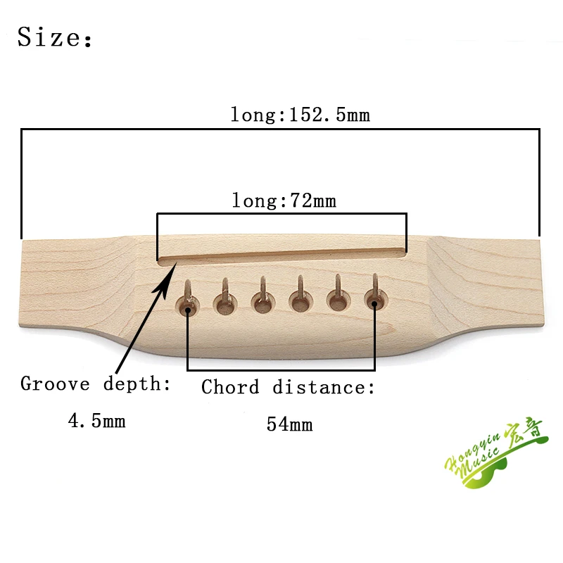 This wooden guitar bridge crafted from high-quality American hard maple measures 72 mm in length and 4.5 mm in depth, featuring a sleek black finish that complements various guitar styles. Designed for versatility, it accommodates different hole positions with optional drilling guidance, making it suitable for installation or replacement in a range of guitar models. Its smooth surface with rounded edges ensures comfortable playability and aesthetic appeal, while the precision-drilled screw holes facilitate secure string attachment. An essential component for guitar builders and repair technicians, this durable bridge combines functional accuracy with elegant simplicity, offering a reliable upgrade or replacement for your instrument’s bridge while enhancing its overall tone and appearance.