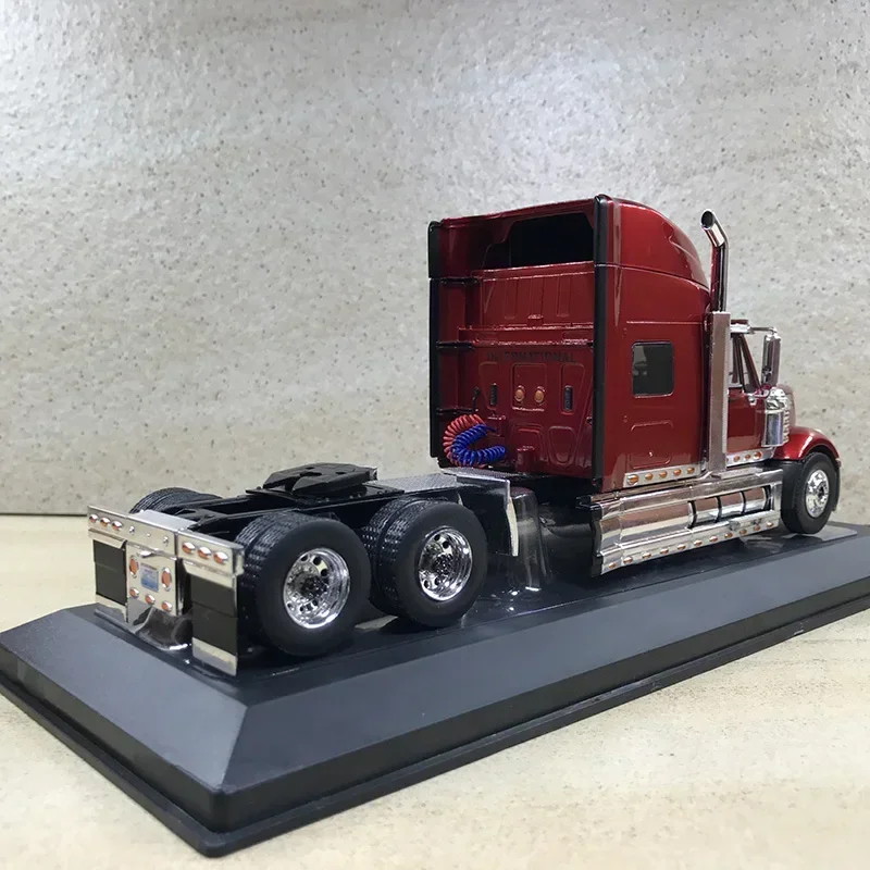 Experience the thrill of owning a meticulously crafted diecast alloy model of an American trailer truck head, specifically an International Lonestar traction head transporter. With a vibrant, glossy red finish, this 1:43 scale model captures every detail of the real truck’s aerodynamic design, from the smoothly contoured roof to the bold front grille with vertical chrome bars. Chrome accents highlight the windows, side mirrors, exhaust pipes, and side steps, while the small circular orange marker lights add realism. The dual rear axles with black tires and shiny silver rims enhance its authentic appearance. Made from high-quality alloy, rubber, and ABS, this finished model is perfect for collectors and enthusiasts who appreciate precision and style in their display pieces.
