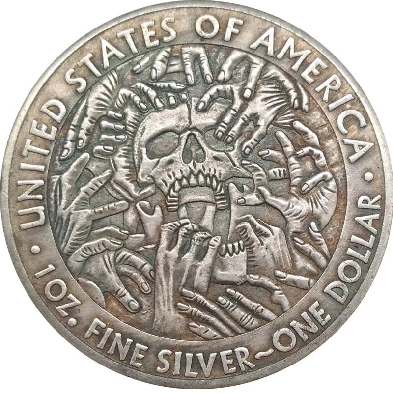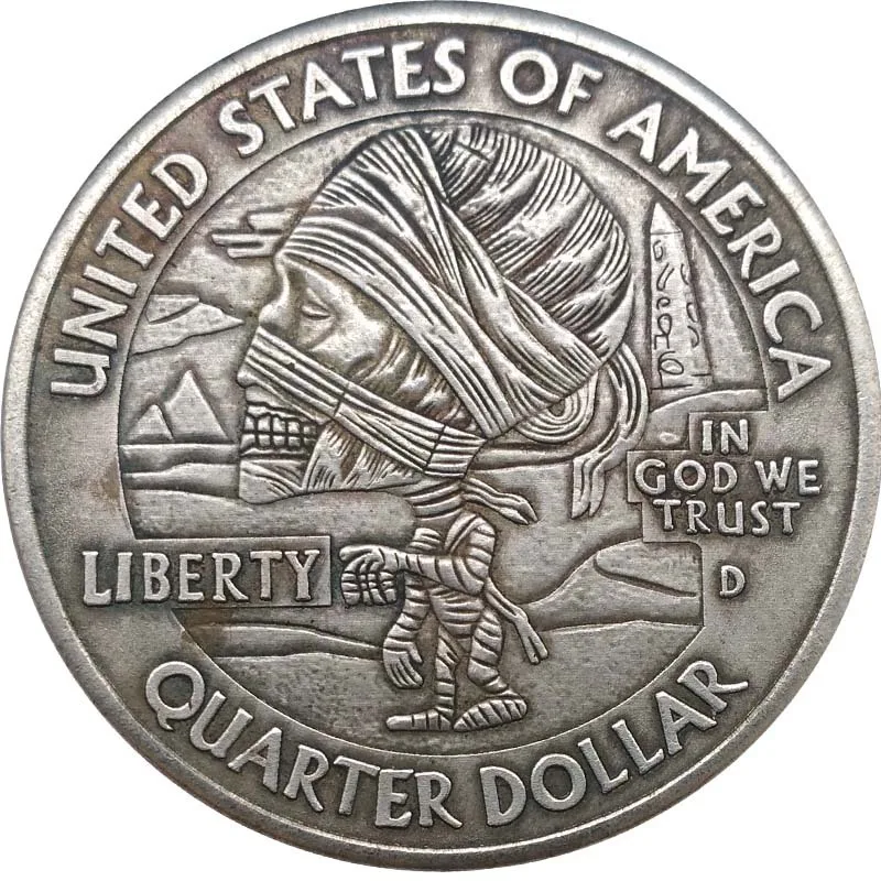 - The coin has a polished, shiny metal texture with detailed relief engravings that accentuate the intricate American symbols and patriotic motifs.