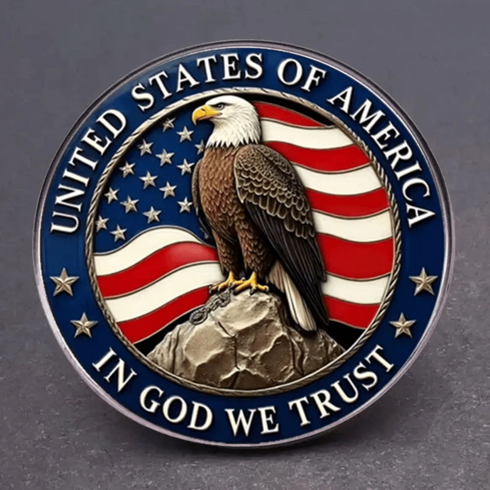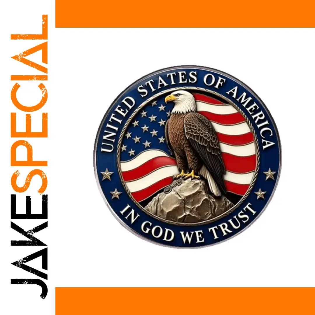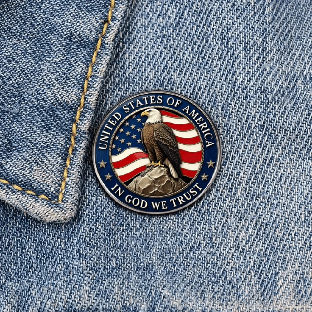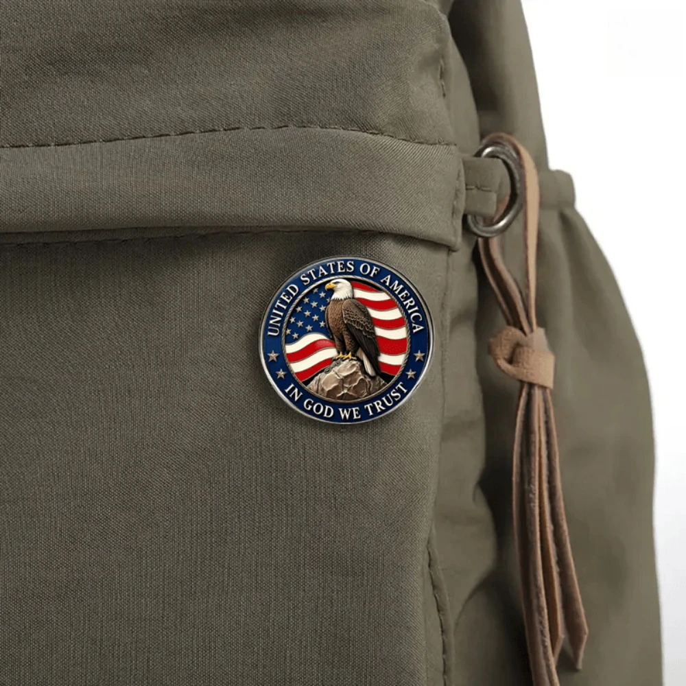 This patriotic American White Eagle star brooch is crafted from alloy with a stylish light grey finish and features a curved, retro-inspired design. The detailed three-dimensional depiction of a bald eagle, with a white head, tail, textured brown feathers, and a bright yellow beak, captures realism and craftsmanship. Behind the eagle, flowing red and white stripes of a stylized American flag arc gracefully against a dark blue background adorned with tiny white stars, all encased in a polished metallic border. Its versatile, unisex style suits various aesthetics including military, punk, gothic, trendy, and minimalist. Perfect for decorating jackets, backpacks, hats, or DIY projects, adding a striking patriotic touch to your wardrobe.