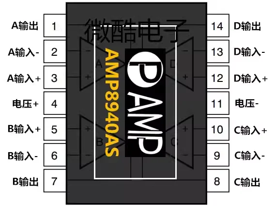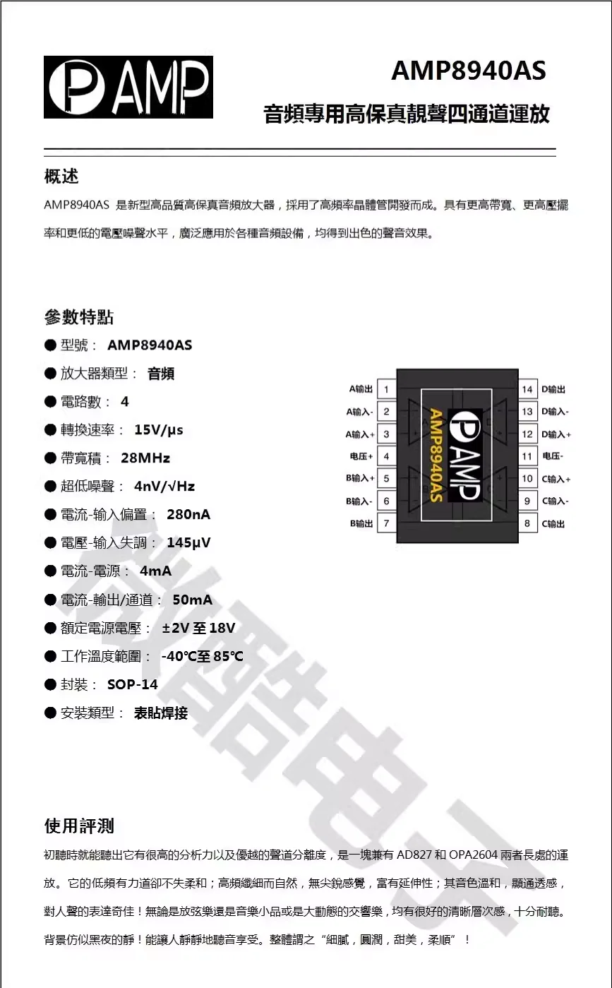 Experience exceptional audio clarity with the AMP8940AS quad operational amplifier, designed to replace popular models like TL084, TL074, LME49740, AD713, OPA4132, OPA4134, and LT1058. Crafted in Korea, this new drive-type op-amp delivers a delicate, smooth, and musical sound with a clear, natural tone, ensuring high durability for your audio or analog projects. Its sleek, matte black rectangular body features 16 evenly spaced metallic pins (8 per side), slightly bent at the tips for easy socketing onto circuit boards. Ideal for those seeking professional-grade performance, the AMP8940AS elevates your sound experience with reliability and precision.