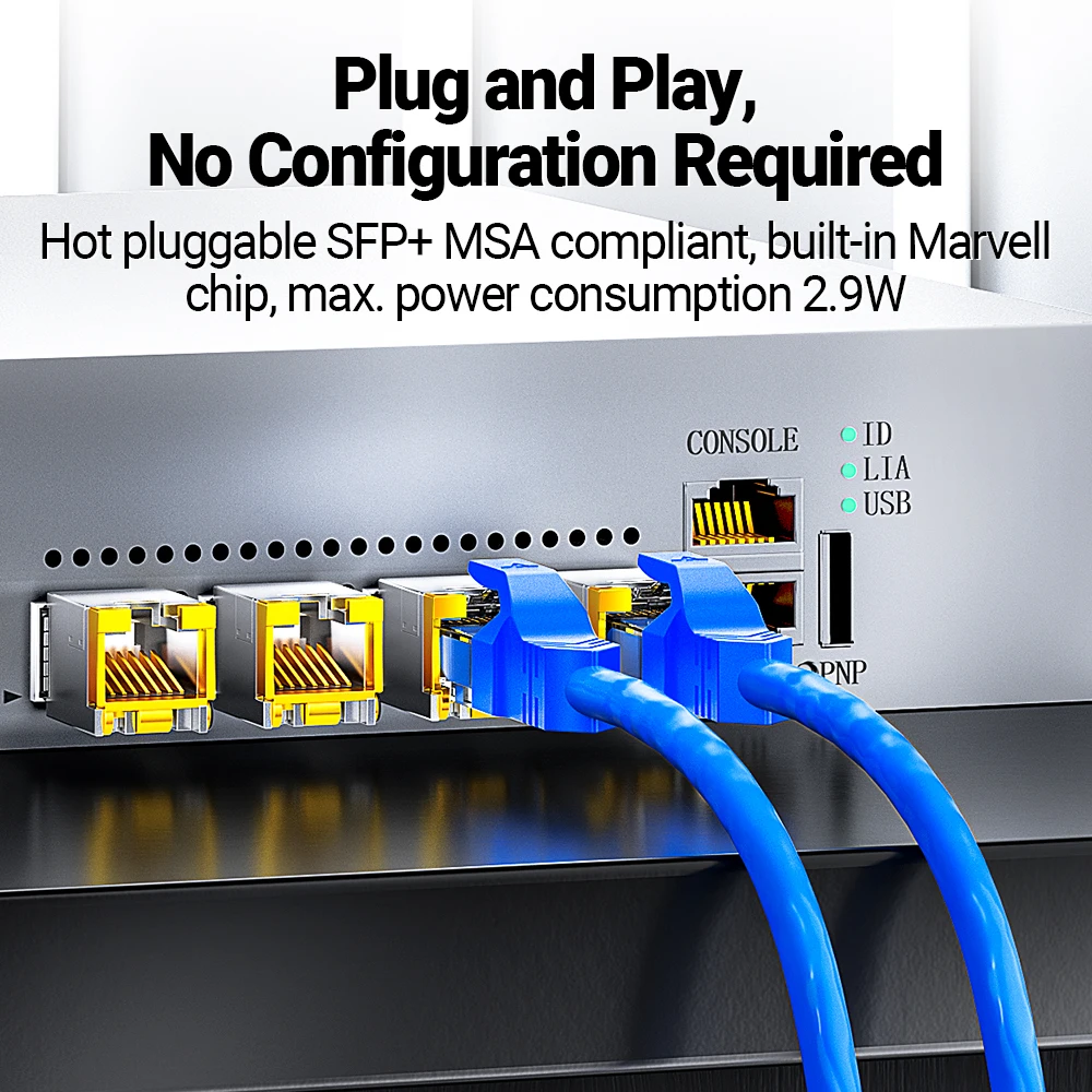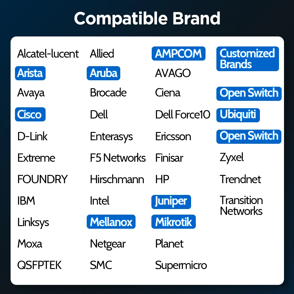- MSA compliant, hot-swappable, with brand-specific coding required for optimal operation across different switch brands and network devices.