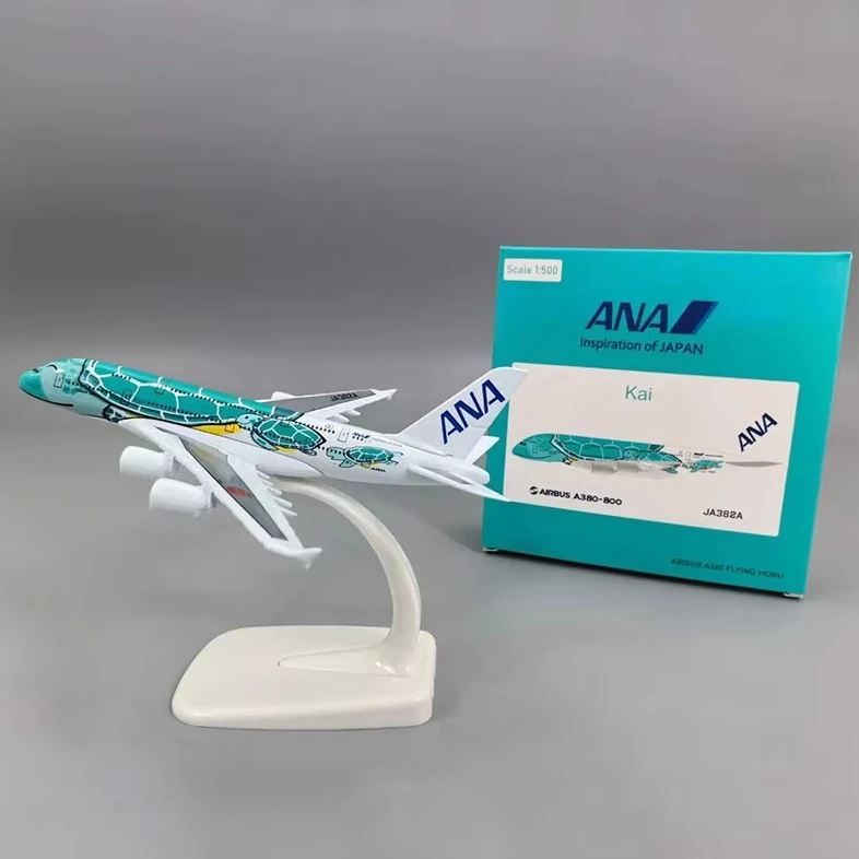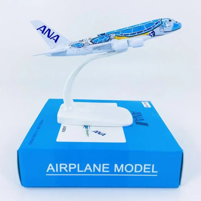 Experience the exquisite detail of this diecast 1/500 scale model of an Airbus A380, measuring approximately 14 cm in length with a wingspan of 15.5 cm. Crafted from durable metal, it features the vibrant ANA Airlines Blue Turtle Lani Kala livery, with a sleek fuselage, four engines, and a double-deck design. Mounted on a white curved display stand, this collectible piece showcases the aircraft’s realistic styling and colorful artistry, making it a perfect addition to any home, office, or bar décor. Designed for display only, it’s suitable for enthusiasts aged 14 and above, emphasizing its artistry and craftsmanship over functionality.