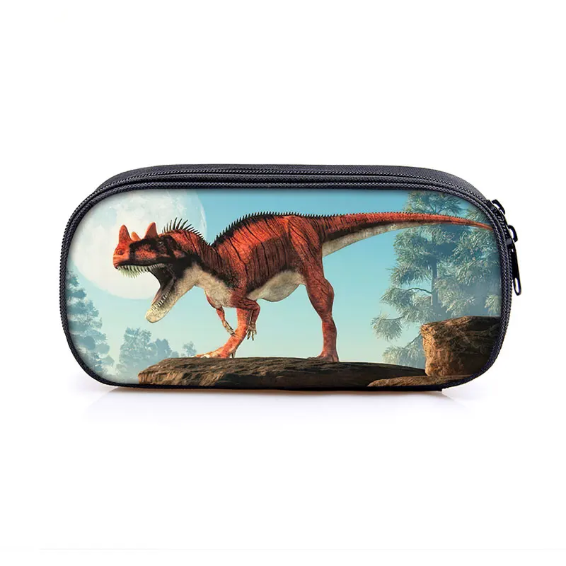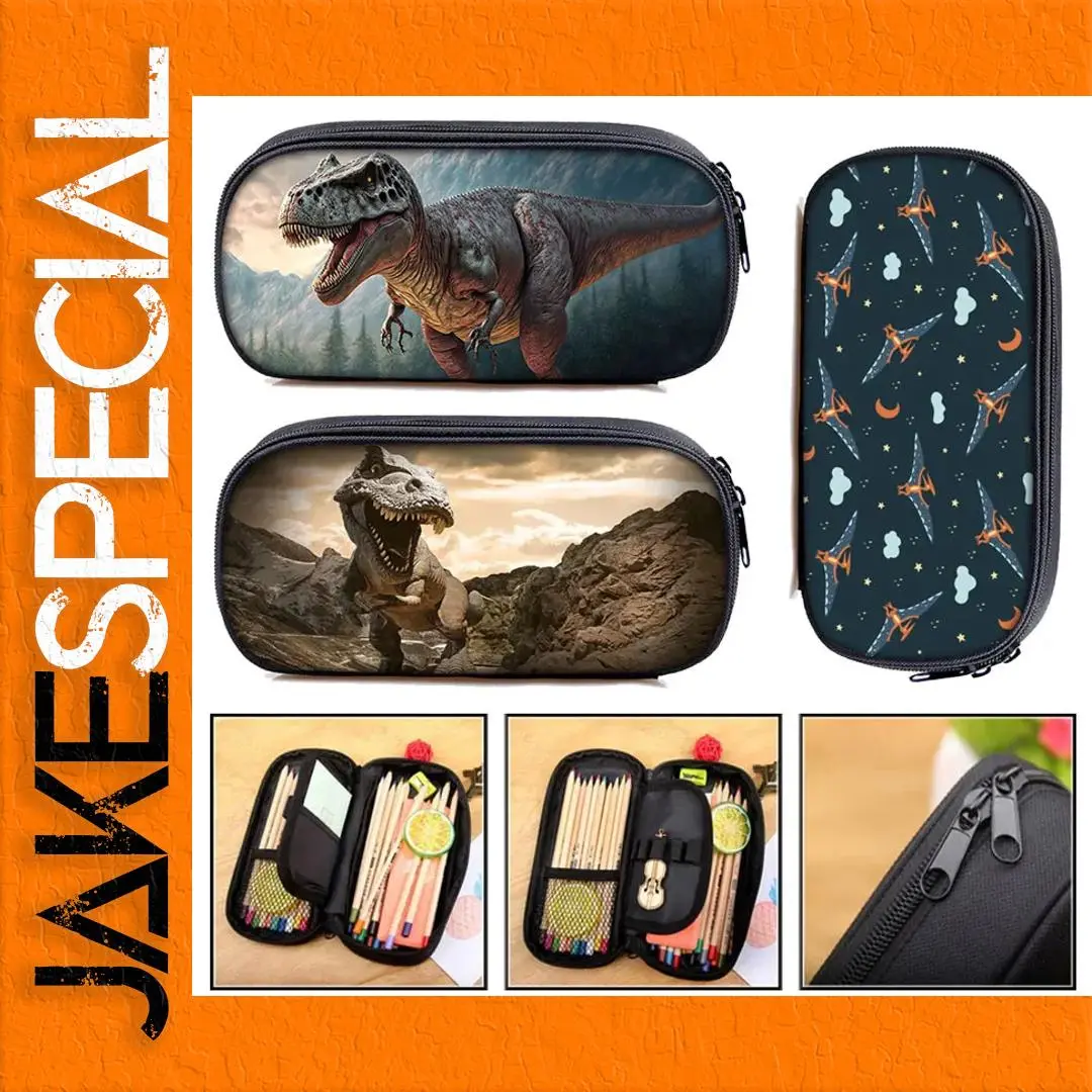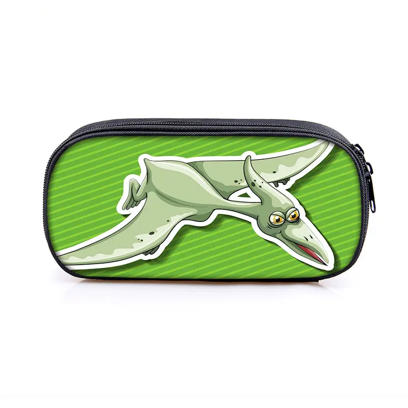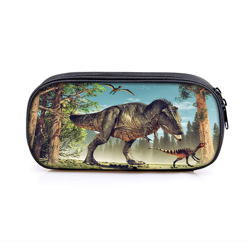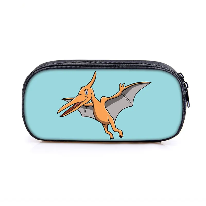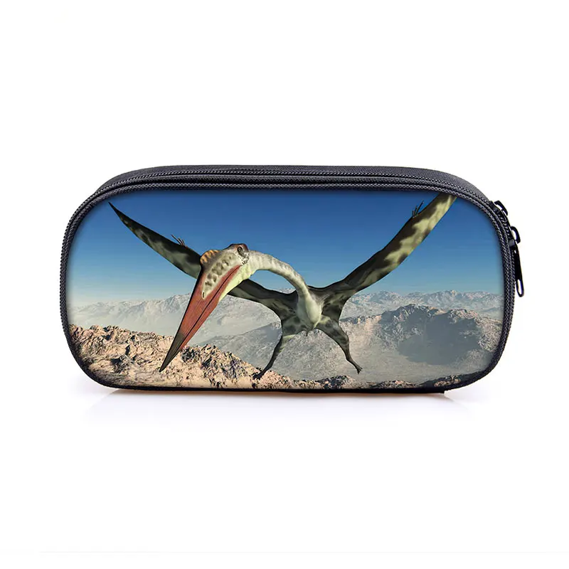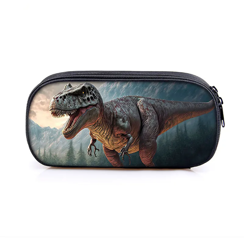 The playful dinosaur-themed cosmetic case, model number 23071801, features a vibrant, box-shaped design. Measuring 20 cm in length, 10 cm in height, and 5 cm in width, it is crafted from durable polyester with a smooth, glossy finish. The eye-catching exterior displays a detailed Tyrannosaurus rex against a dramatic backdrop, while whimsical flying dinosaurs add charm to the design. The zipper closure ensures easy access to the organized interior, complete with compartments for brushes and small items. Weighing only 80 g, this casual case is perfect for dinosaur enthusiasts looking to keep their essentials stylishly organized.