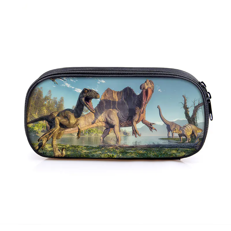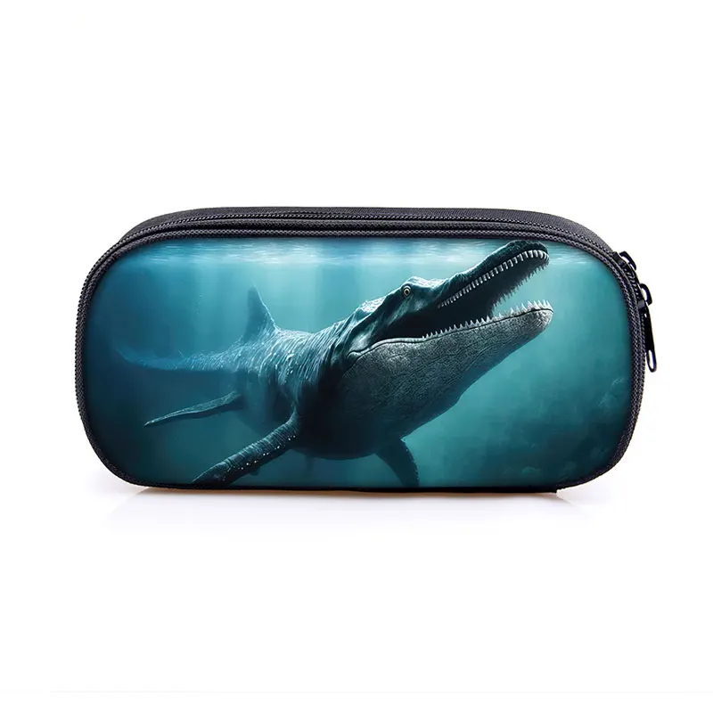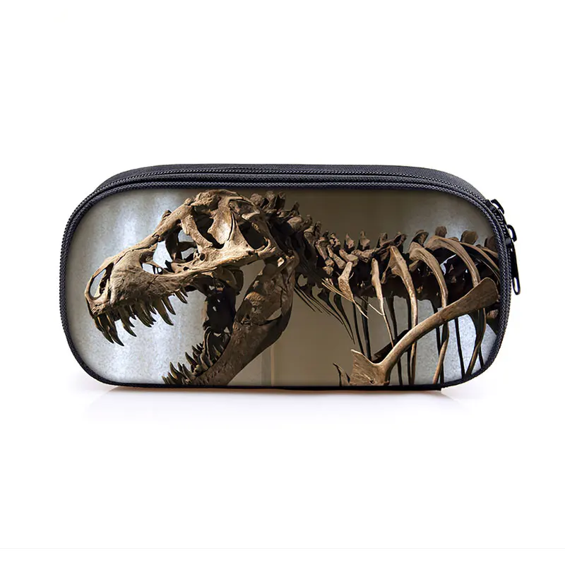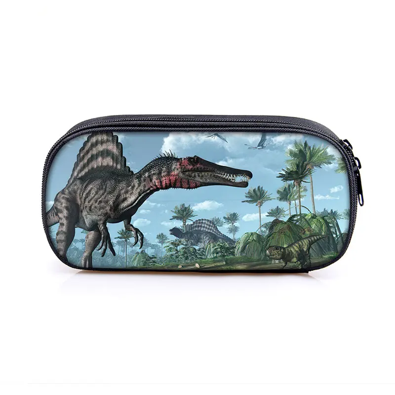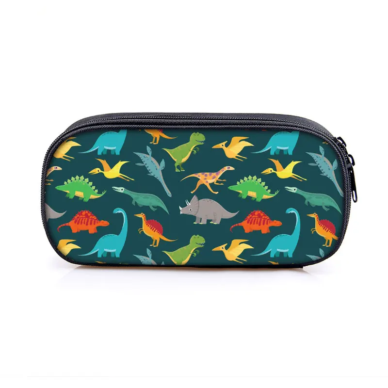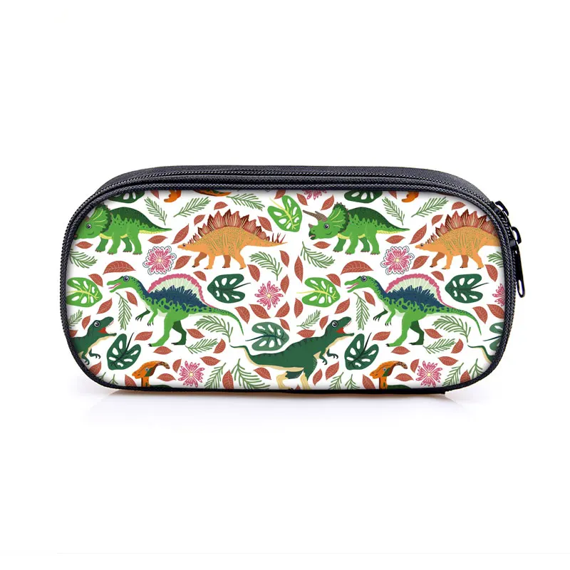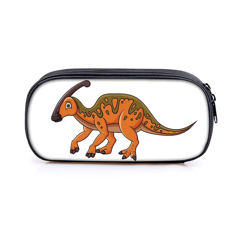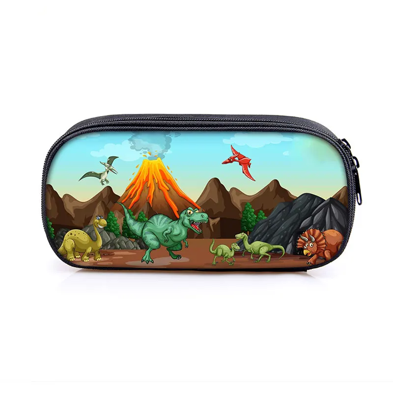 The playful dinosaur-themed cosmetic case, model number 23071801, features a vibrant, box-shaped design. Measuring 20 cm in length, 10 cm in height, and 5 cm in width, it is crafted from durable polyester with a smooth, glossy finish. The eye-catching exterior displays a detailed Tyrannosaurus rex against a dramatic backdrop, while whimsical flying dinosaurs add charm to the design. The zipper closure ensures easy access to the organized interior, complete with compartments for brushes and small items. Weighing only 80 g, this casual case is perfect for dinosaur enthusiasts looking to keep their essentials stylishly organized.